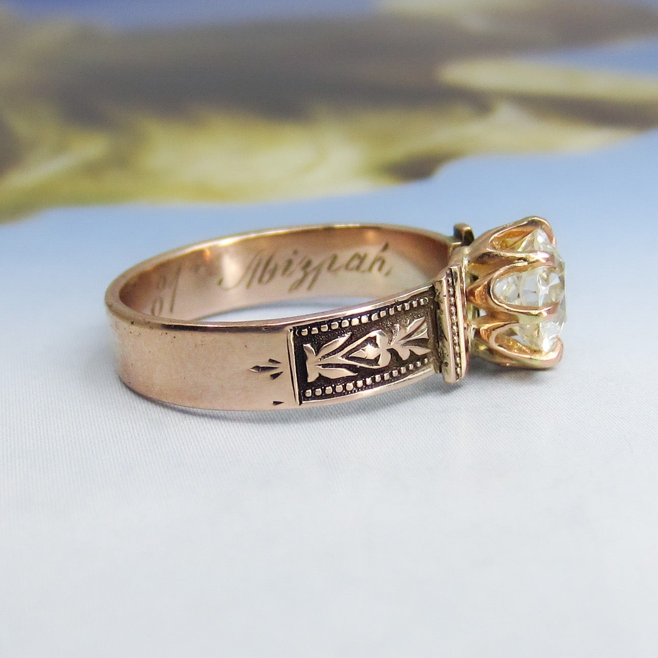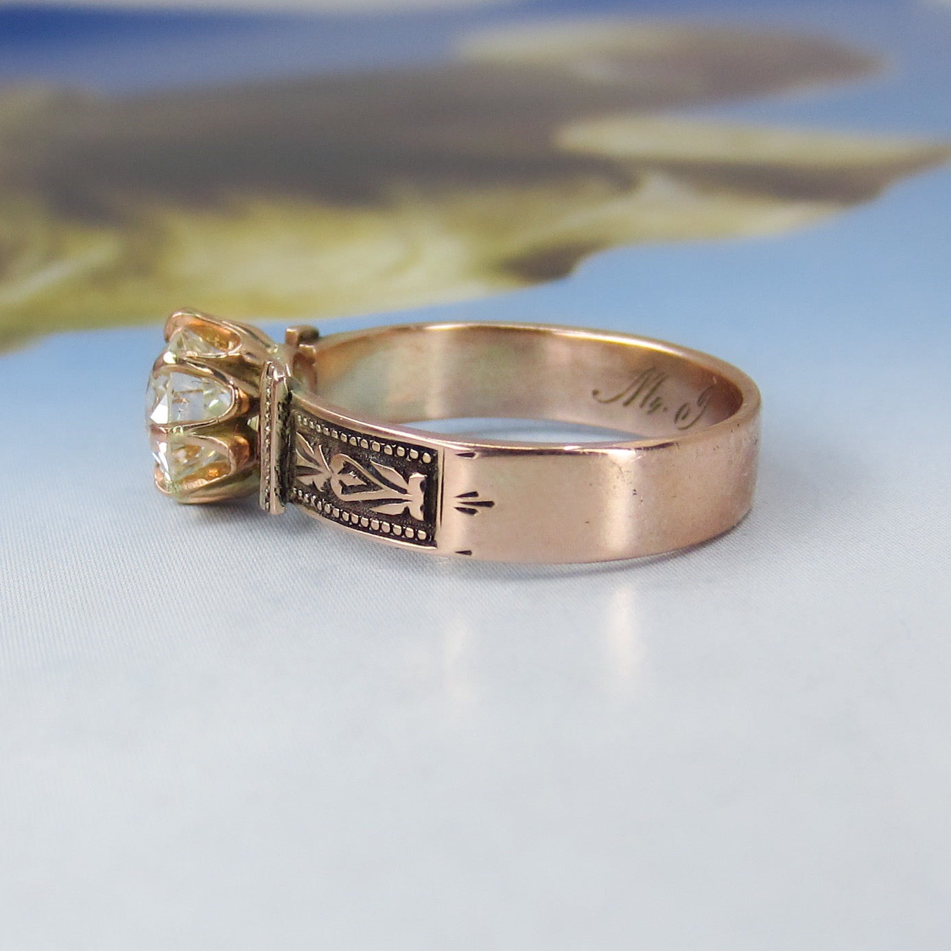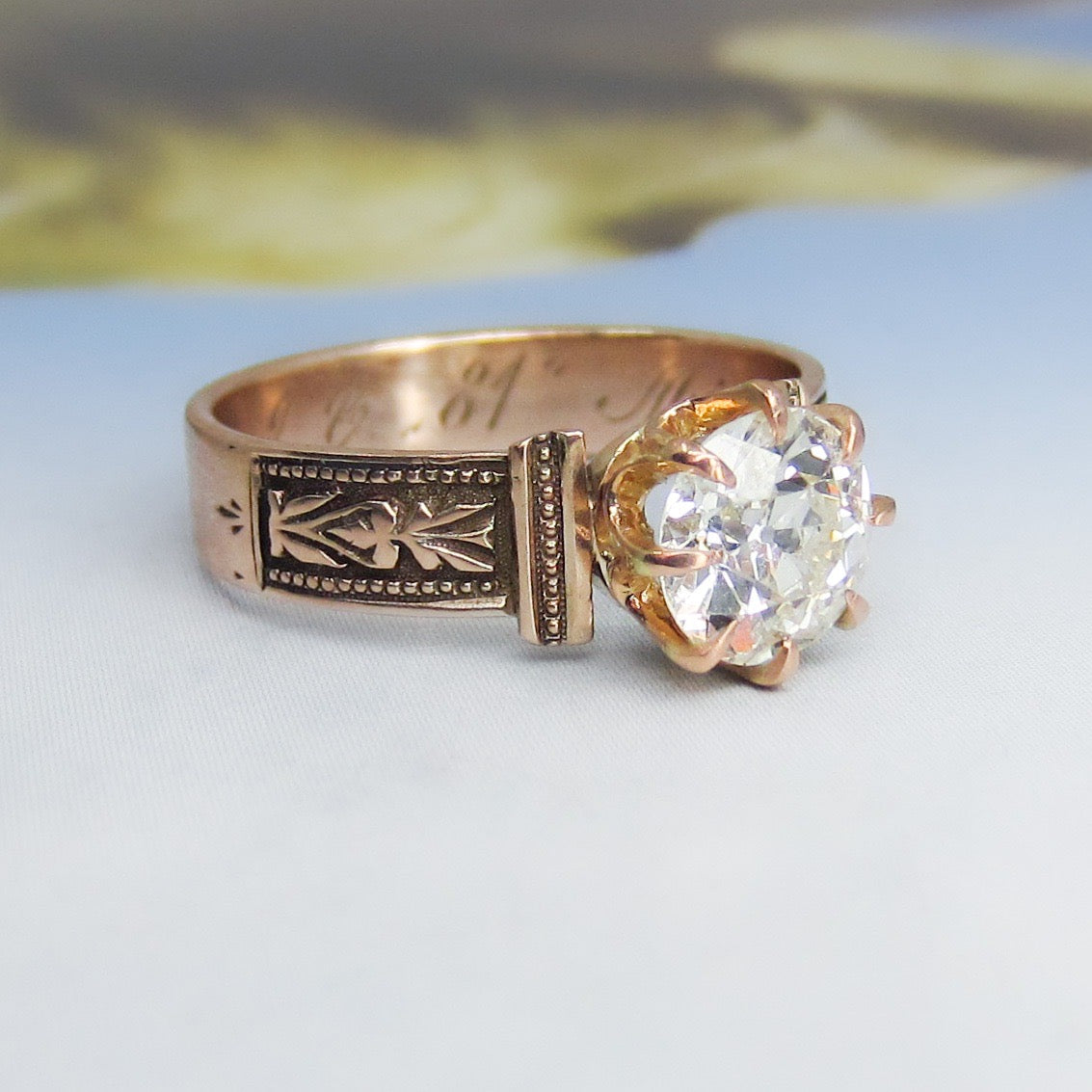 The new owner of this stunningly beautiful antique engagement ring is going to be one lucky lady! Made during the late Victorian era, this 14k rose gold mounting holds a 1.18ct Old European Cut diamond in a crown basket. Inside the shank is engraved "M.J.C. '81 Mizpah". In romantic jewelry from this period, the word mizpah signifies remembrance. This ring is simple and clean, but with those perfect Victorian details you want in a piece from that era! Stacks beautifully with a wedding band.