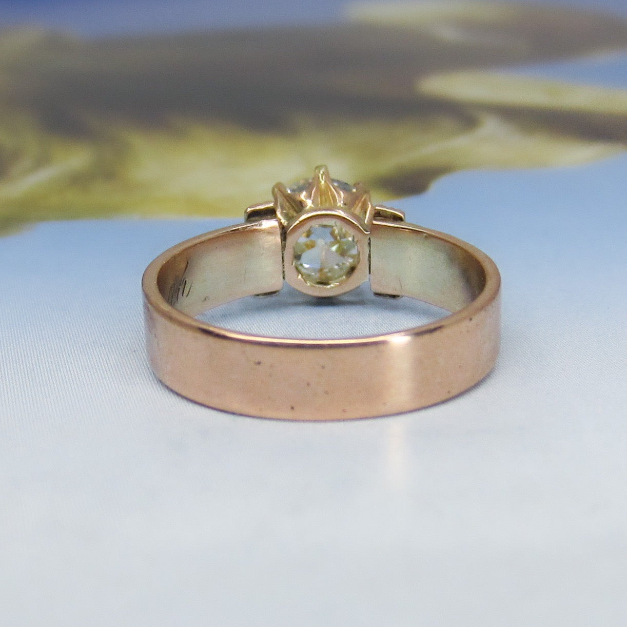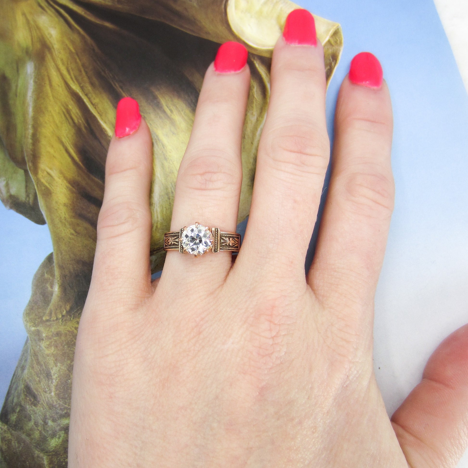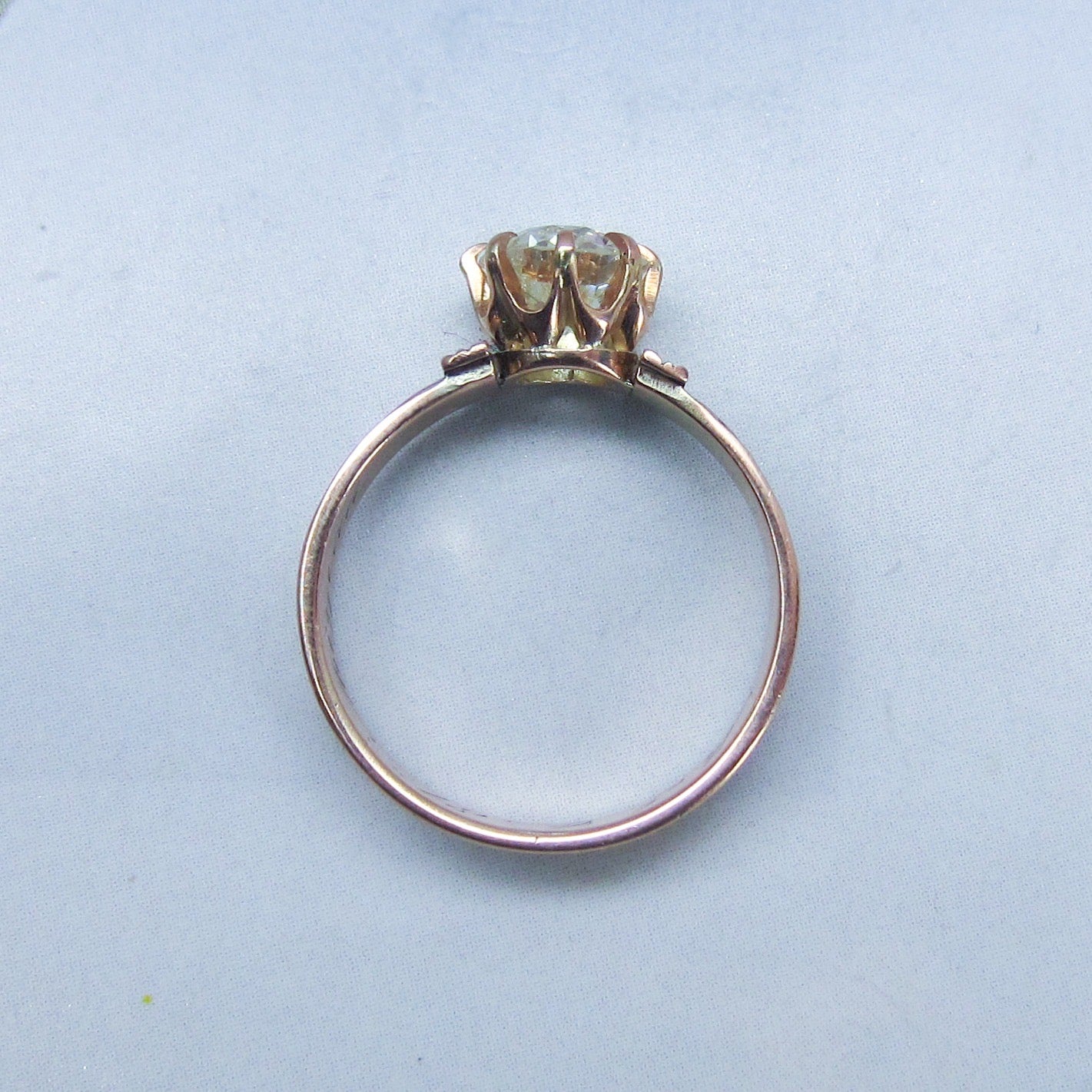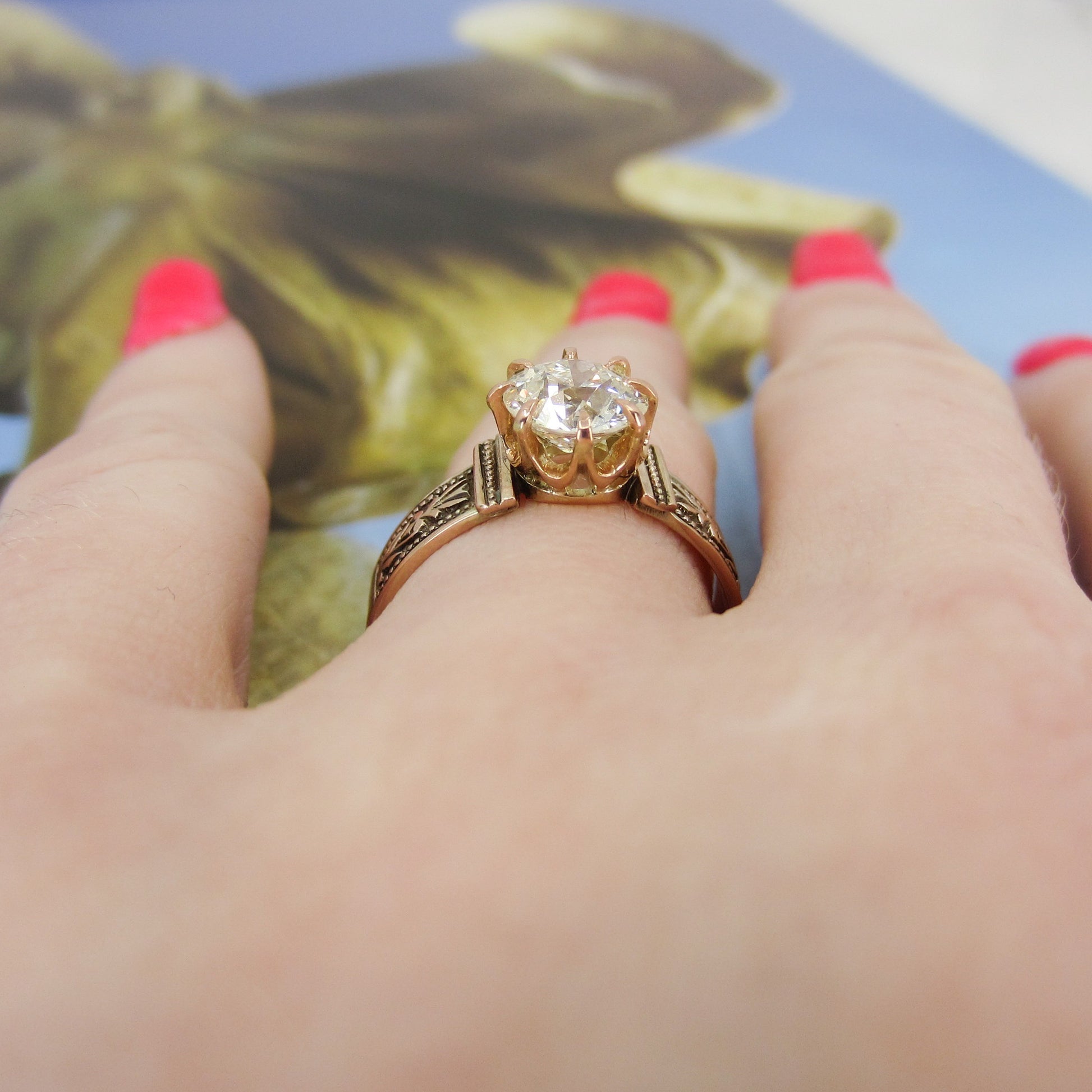 The new owner of this stunningly beautiful antique engagement ring is going to be one lucky lady! Made during the late Victorian era, this 14k rose gold mounting holds a 1.18ct Old European Cut diamond in a crown basket. Inside the shank is engraved "M.J.C. '81 Mizpah". In romantic jewelry from this period, the word mizpah signifies remembrance. This ring is simple and clean, but with those perfect Victorian details you want in a piece from that era! Stacks beautifully with a wedding band.
