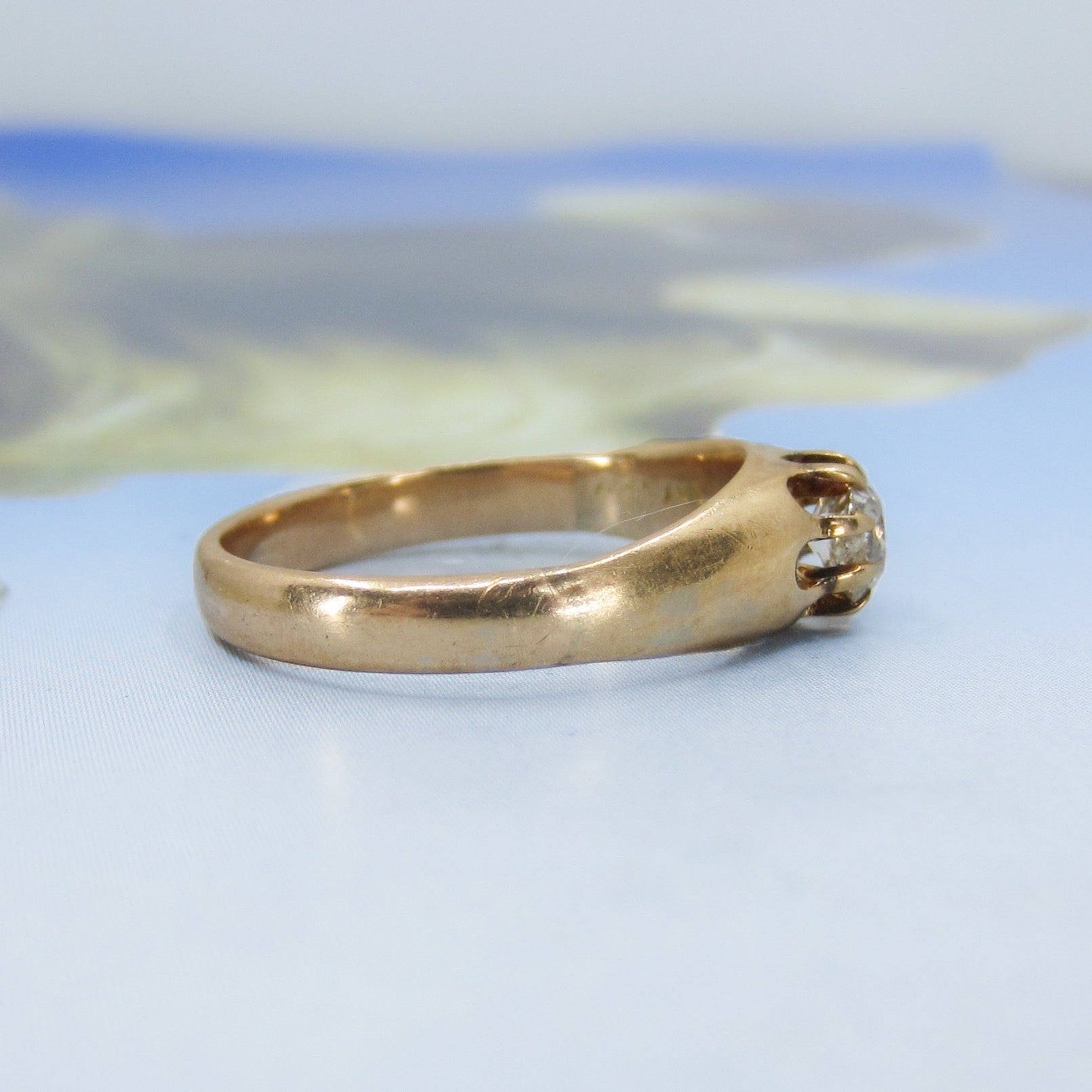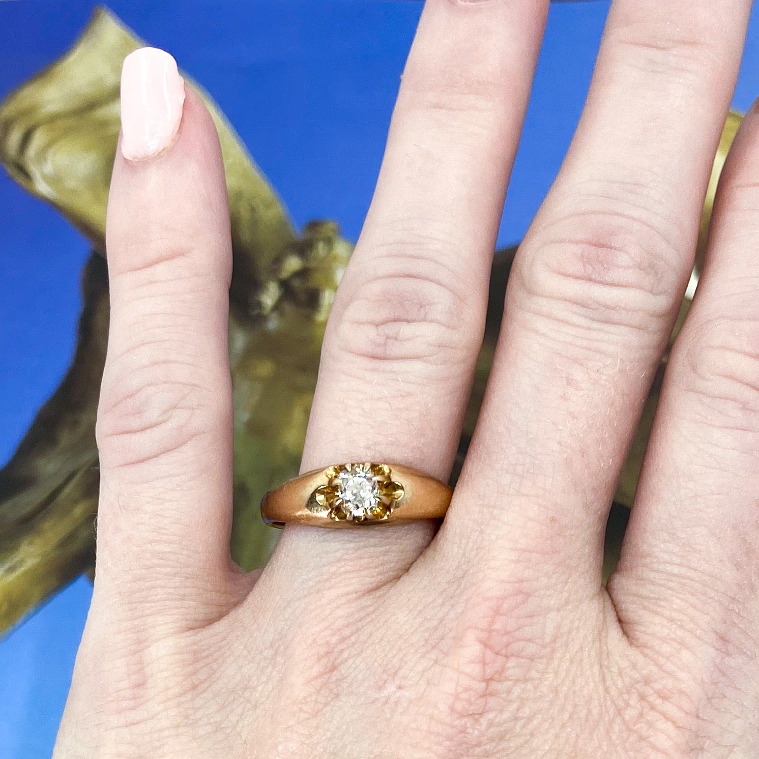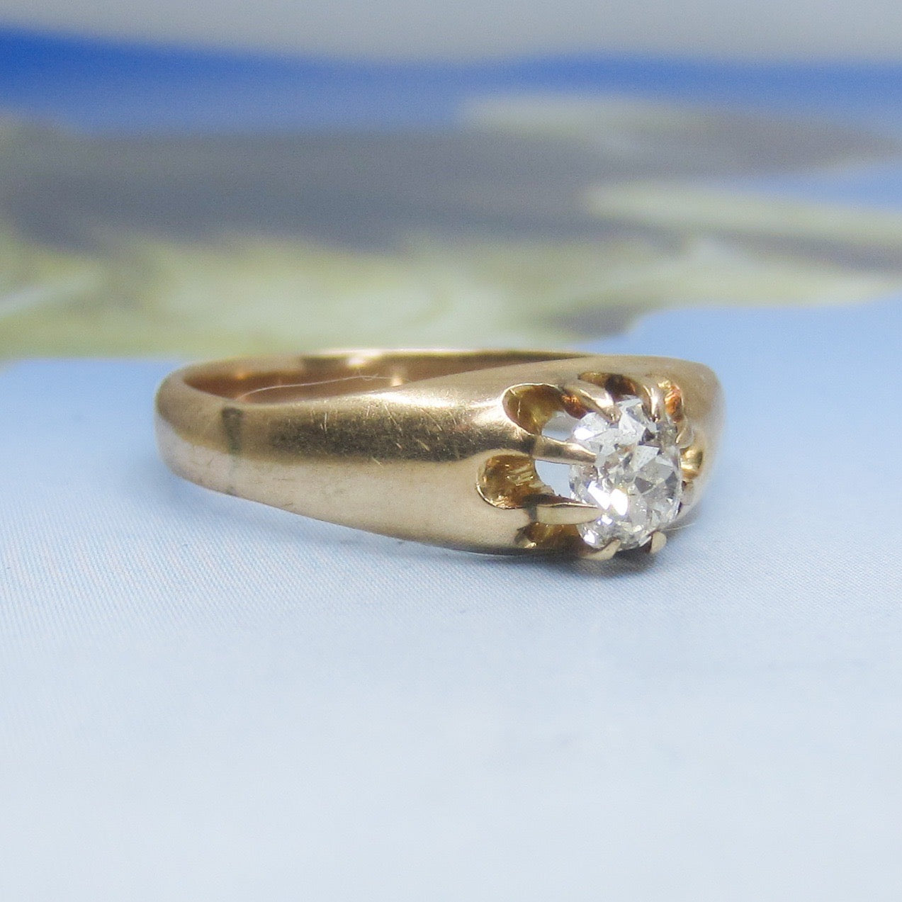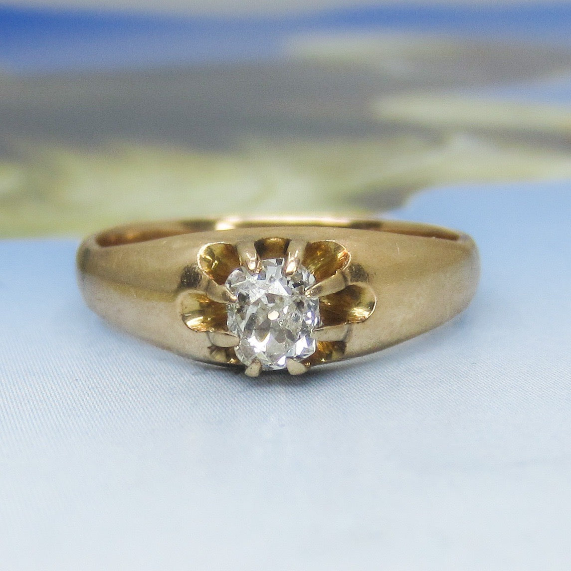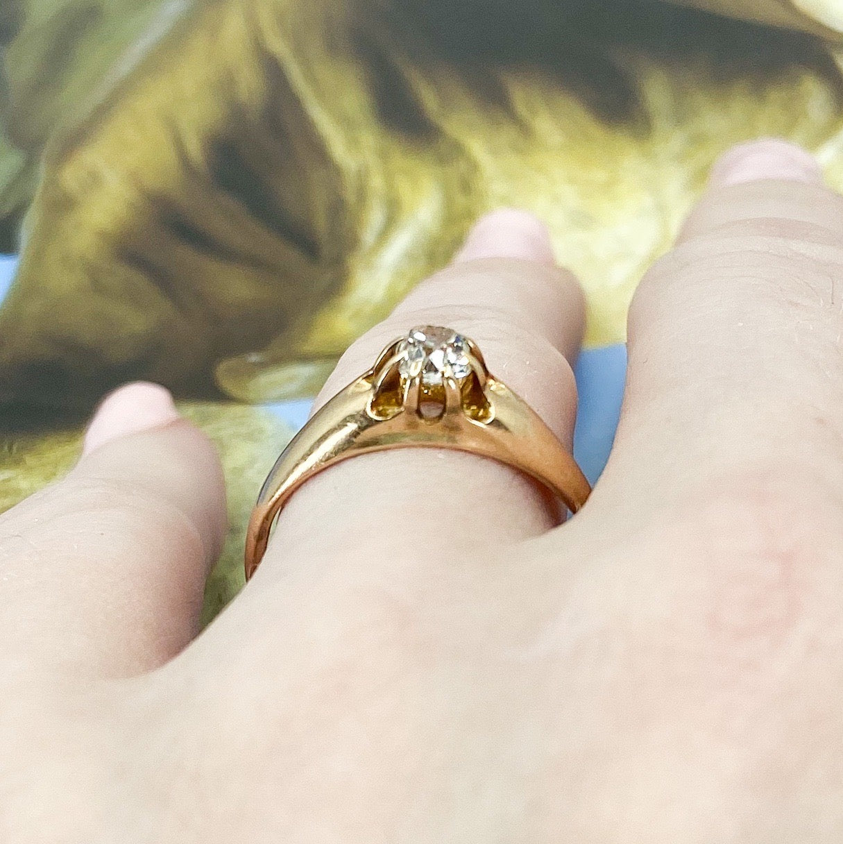 This is a late Victorian ring, holding a central Old Mine cut diamond weighing approximately .35ct, set in a belcher setting of 14k gold and made circa 1880. I love the patina this old gold has gotten over the years, it's very rich and offsets the soft sparkle of this diamond very nicely. This style of ring makes for a great antique engagement ring but it doesn't have to be engagement, I have many customers that wear rings like this on other fingers alone or stacked with other rings---there are many options, don't be scared when you see a solitaire vintage ring that it has to be for an engagement!