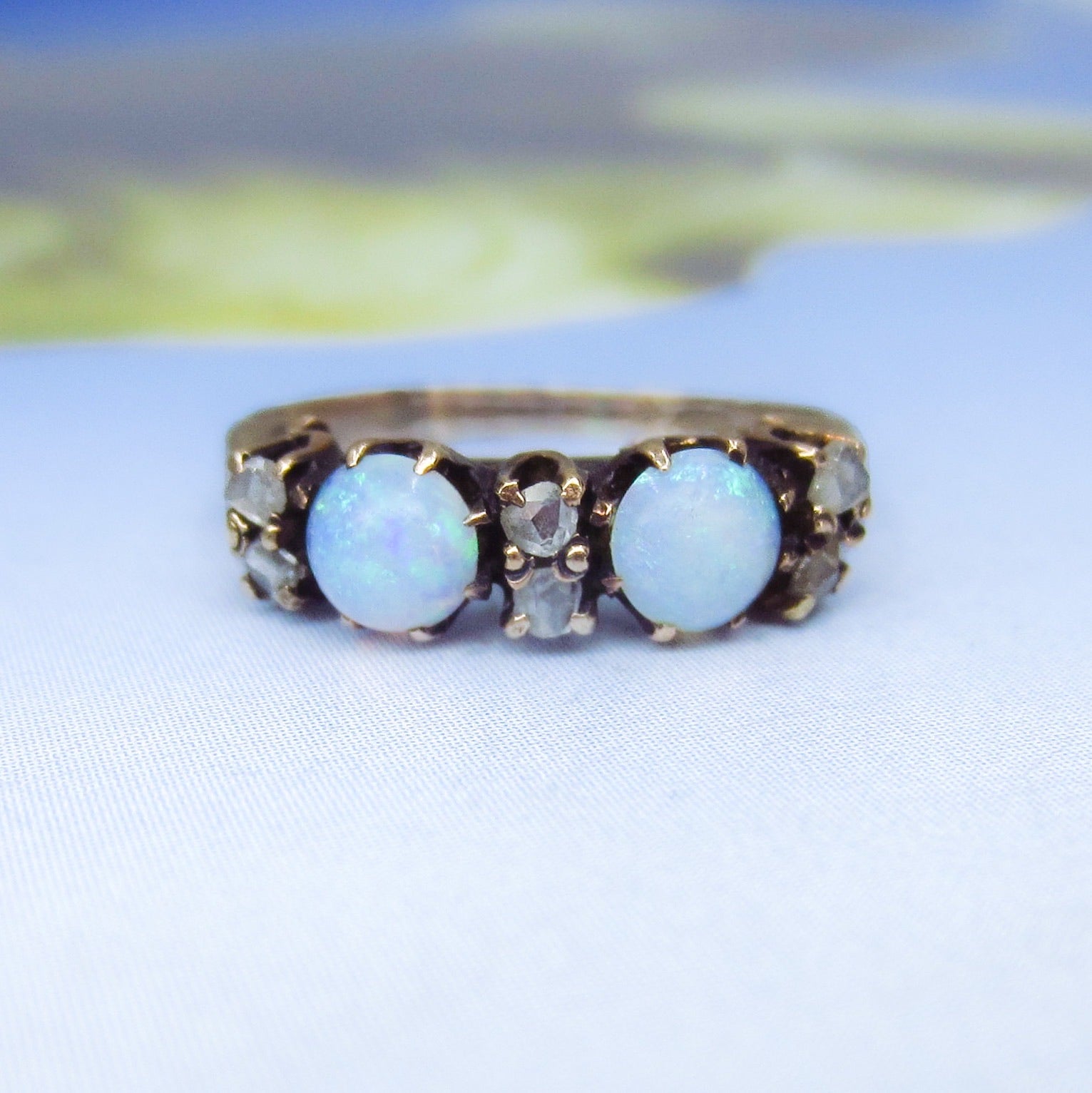 This ring is so romantic! Made in the late Victorian period cIrca 1890, it features two lovely opals and six rose cut diamonds in a 14k rose gold mounting.
