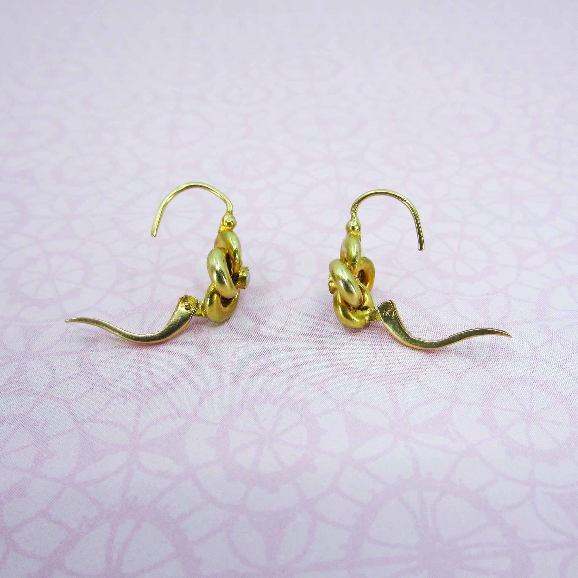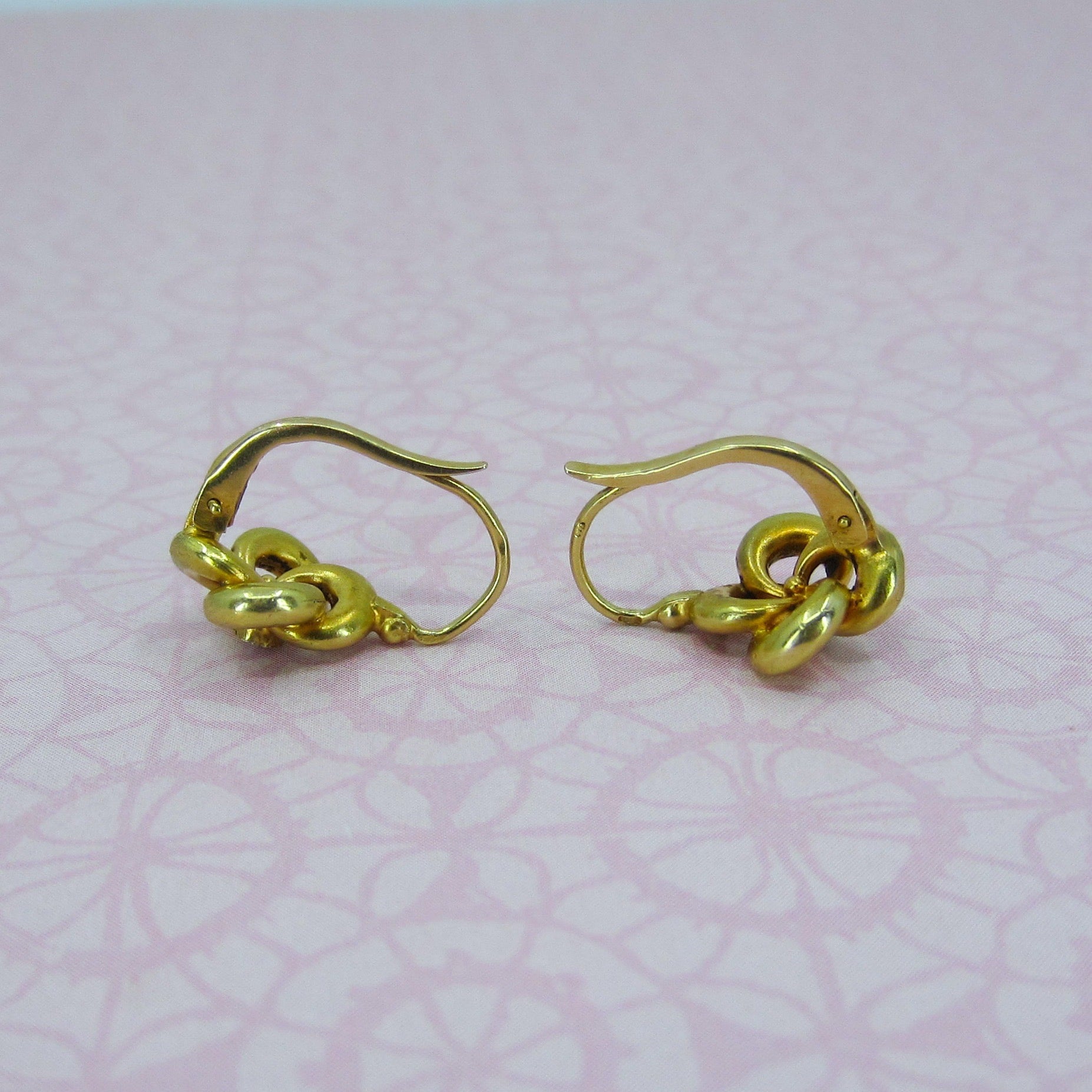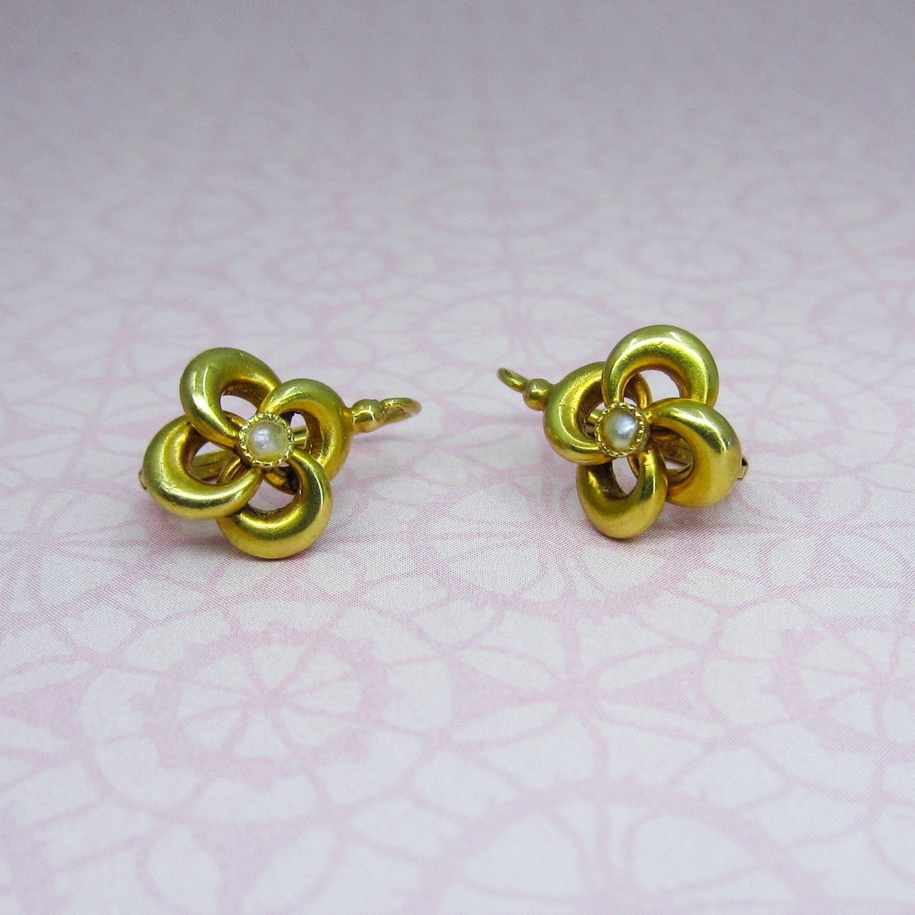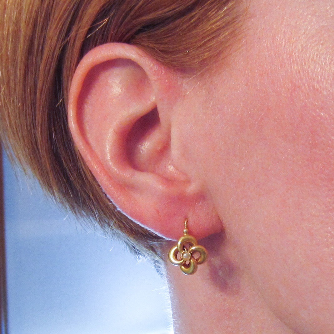 The perfect everyday earring! These late Victorian earrings were made in France circa 1900 and hold a tiny seed pearl set in an 18k love knot motif. The lever backs make for a strong hold so they are very difficult to lose. Put them on and go!