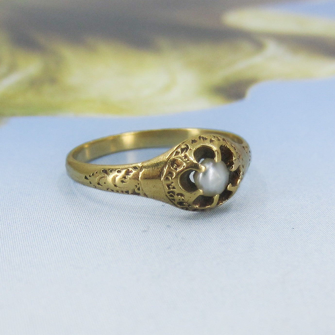This beautiful and very sweet Victorian ring was made circa 1880 and holds one small natural pearl, belcher set in an 18k mounting with ornate frame and shoulders.