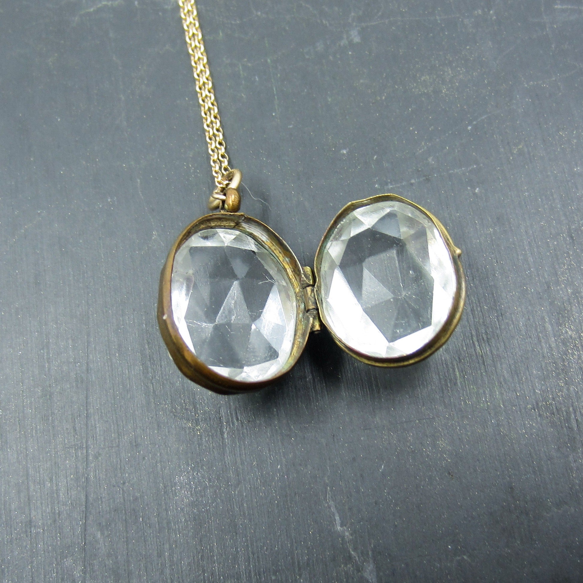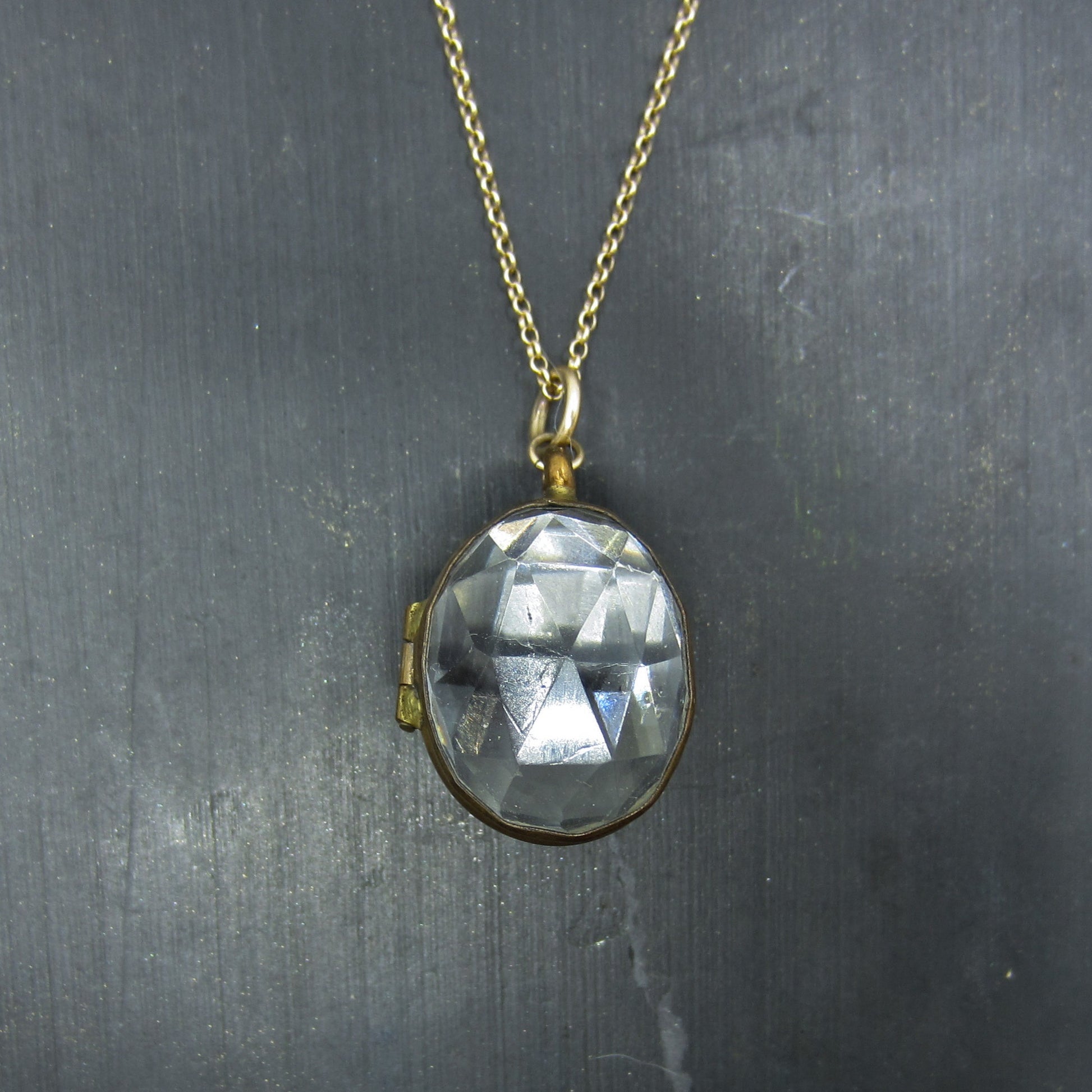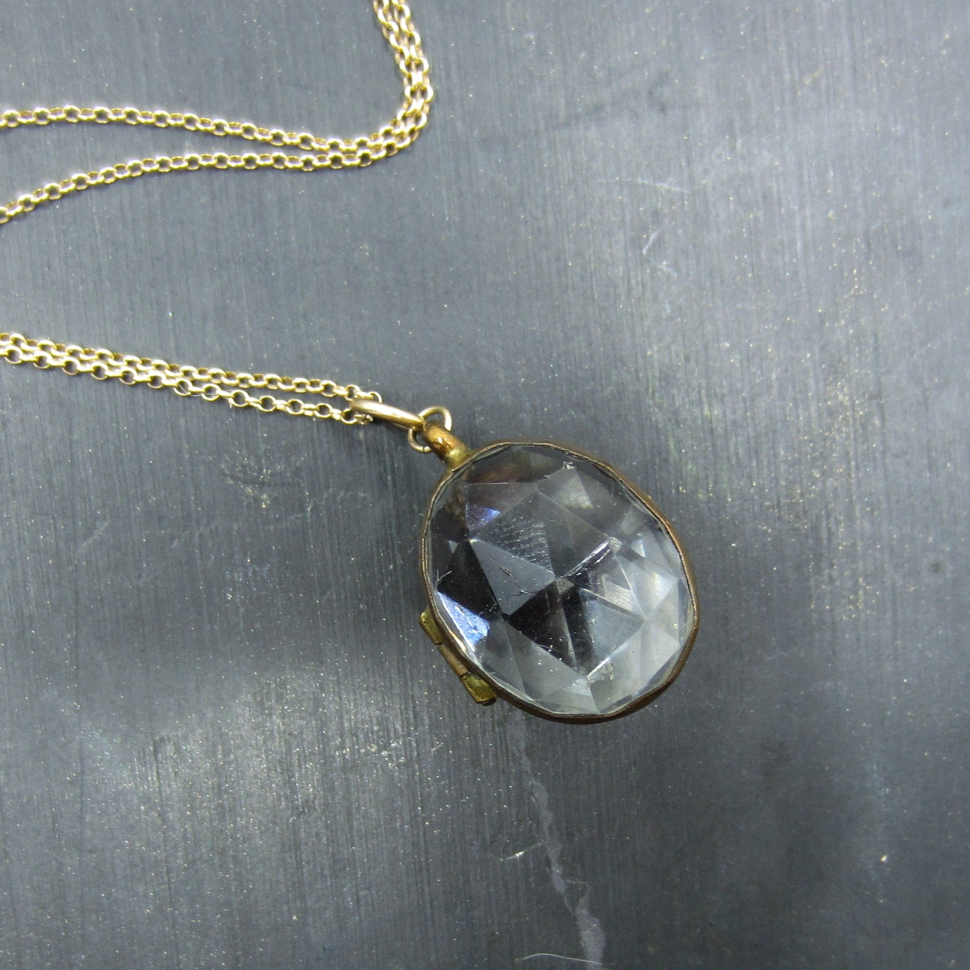 Ugh this thing is so gorgeous--you just want to hold it and look at it and roll it around in your hands as soon as you lay eyes on it! Made circa late 1800's, this is a Victorian piece and consists of two faceted crystal halves set in a locket frame of gold-fill. The crystal is faceted much like a rose cut and is deeply cut so the entire locket resembles an egg. It is glorious! A very pretty, special little jewel, ready for your neck!