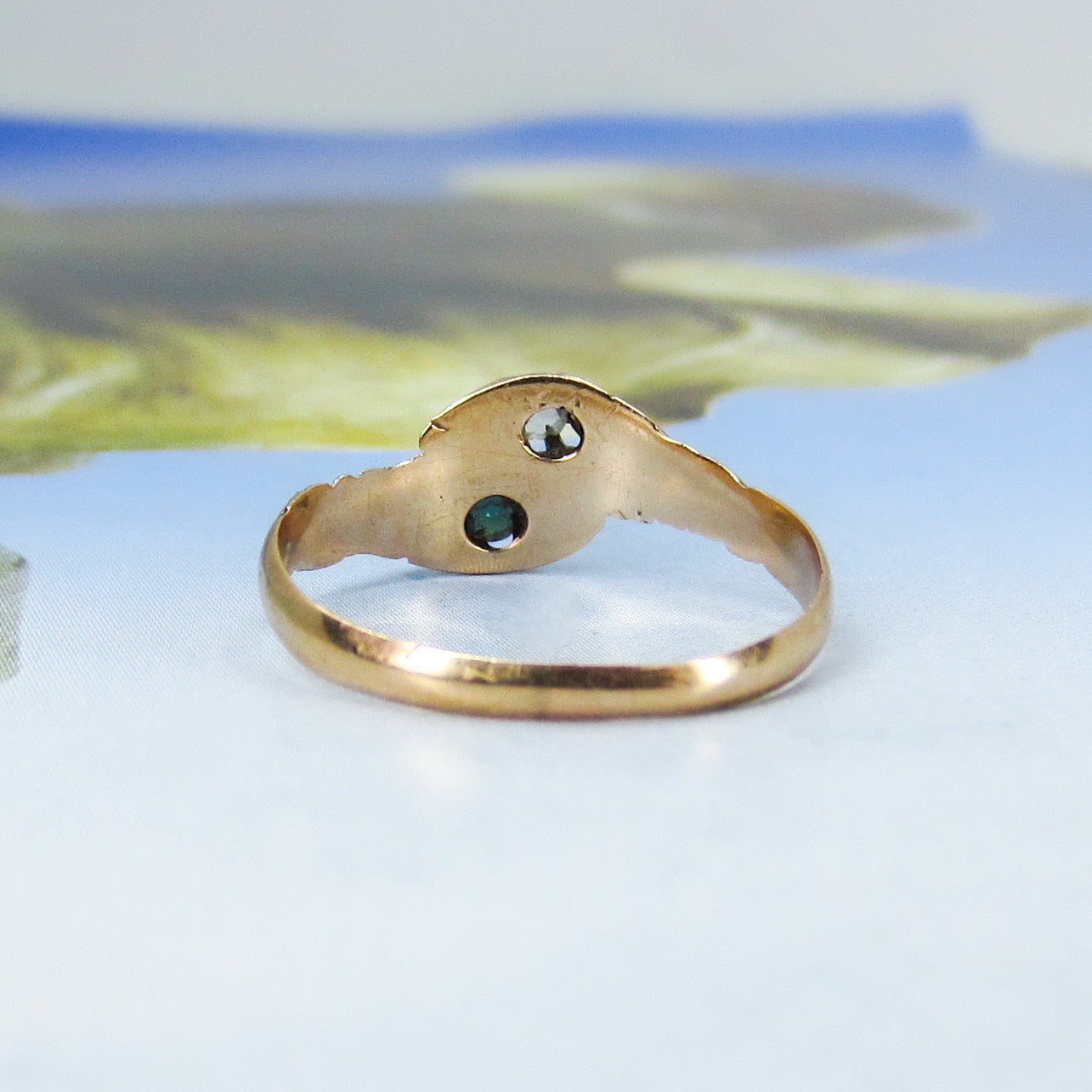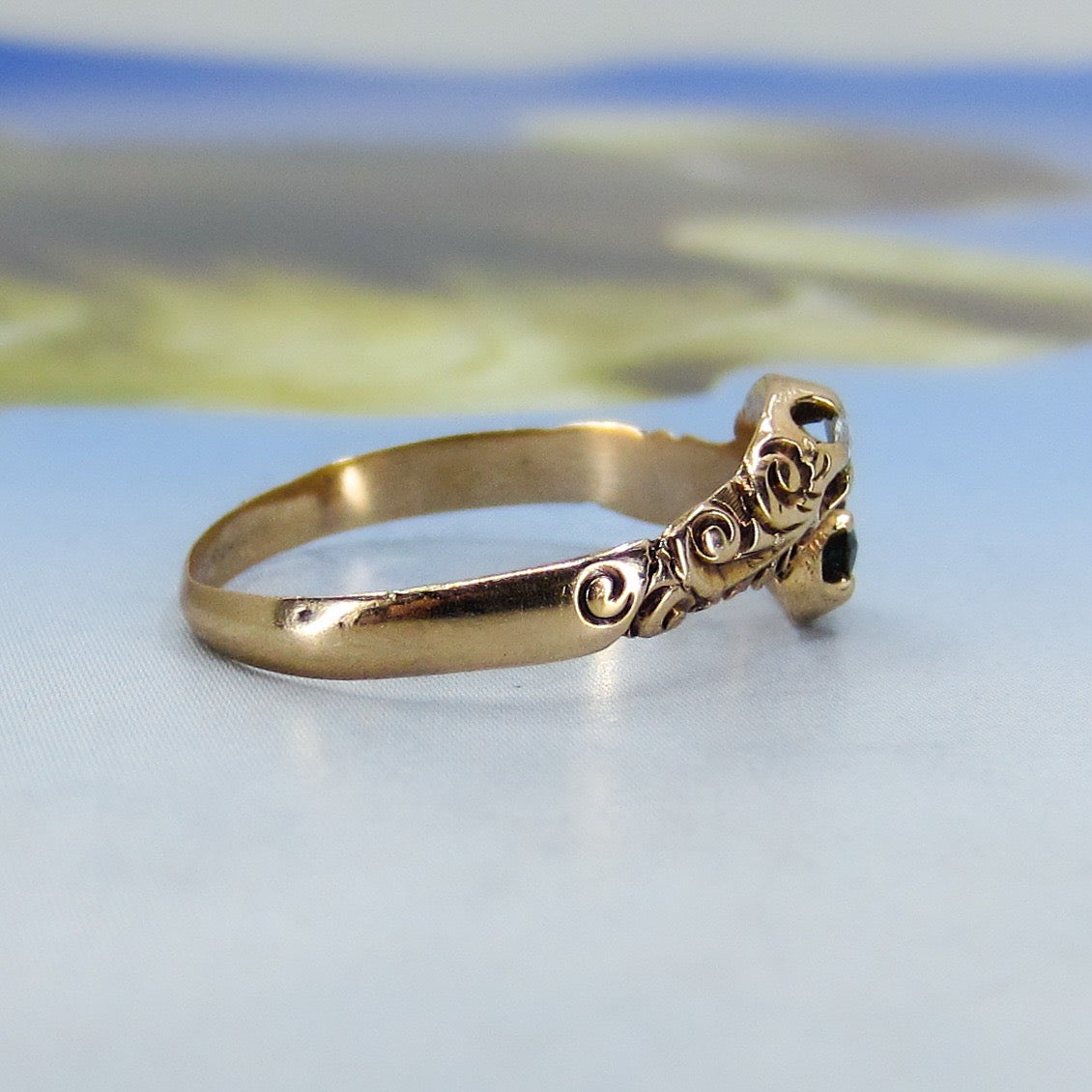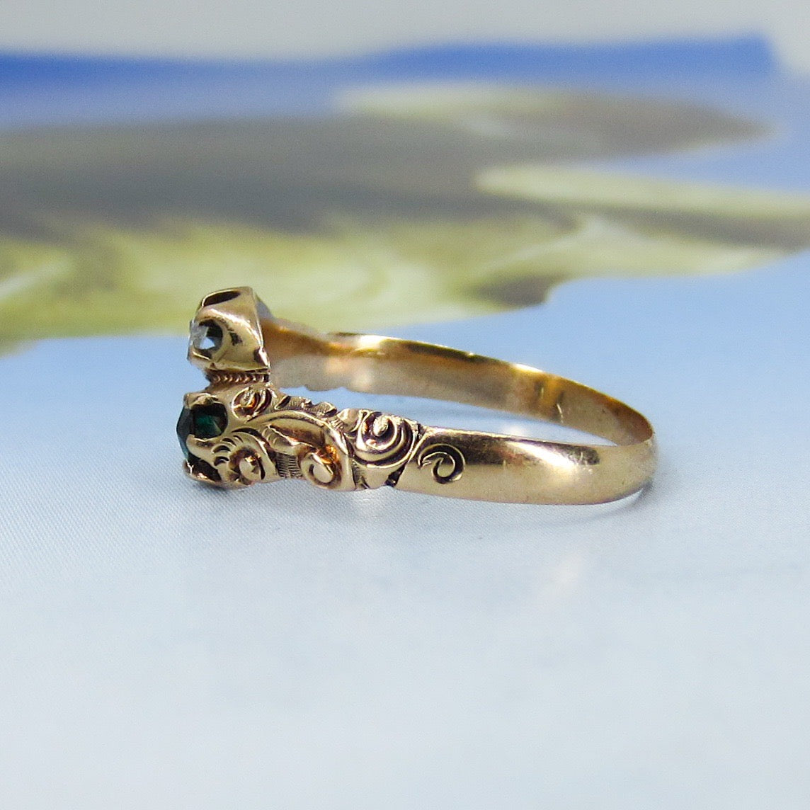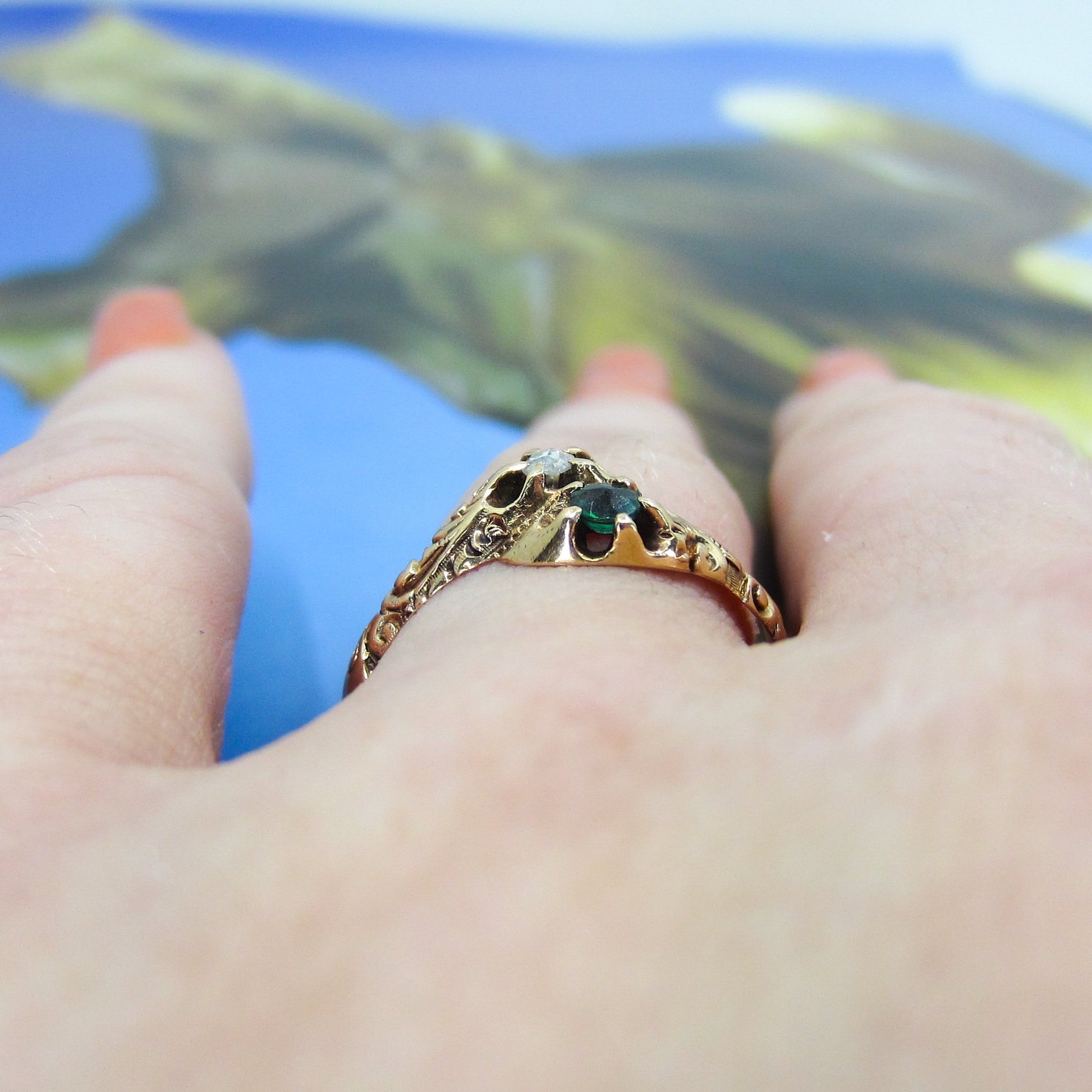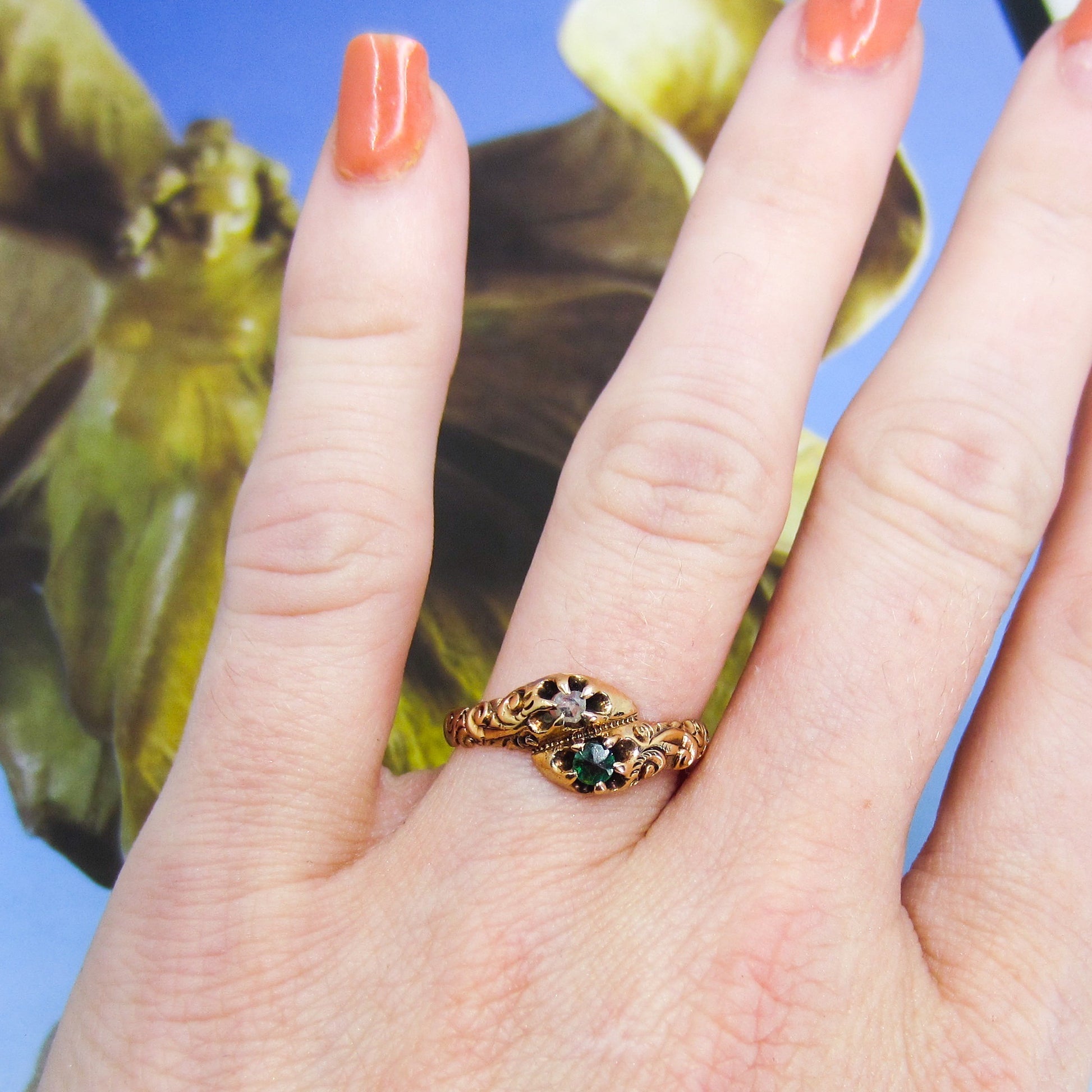 Made circa 1880, this antique Victorian ring holds a natural Rose Cut diamond and a doublet--which is an old Victorian trick!--made of garnet and green glass to simulate an emerald. We see these doublets often in Victorian rings and it is unclear if the original purchaser was ever aware that they weren't buying an emerald! I actually love that this ring has its original stones including the doublet, that's how this ring was made 140 years ago and is part of the fingerprint of this piece!