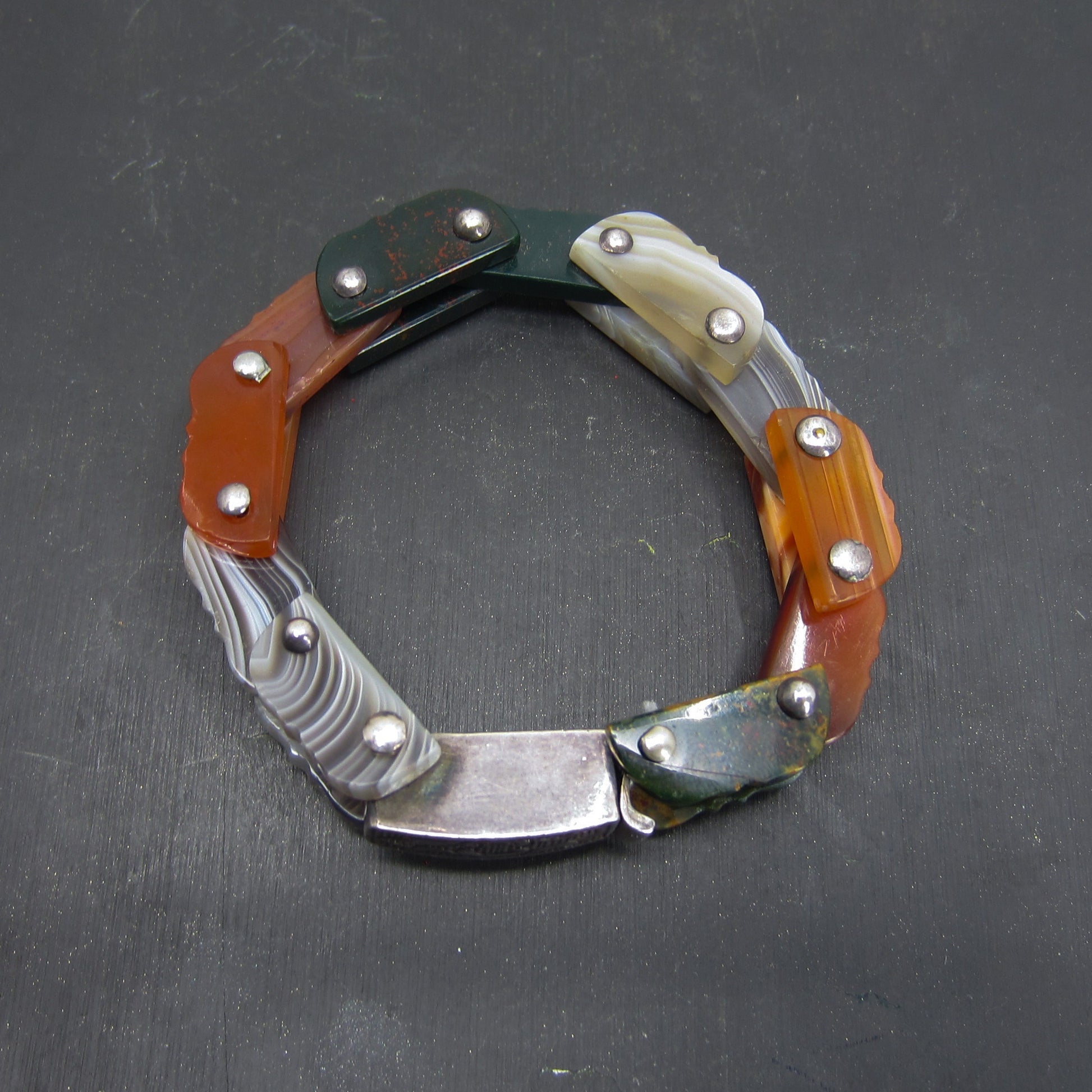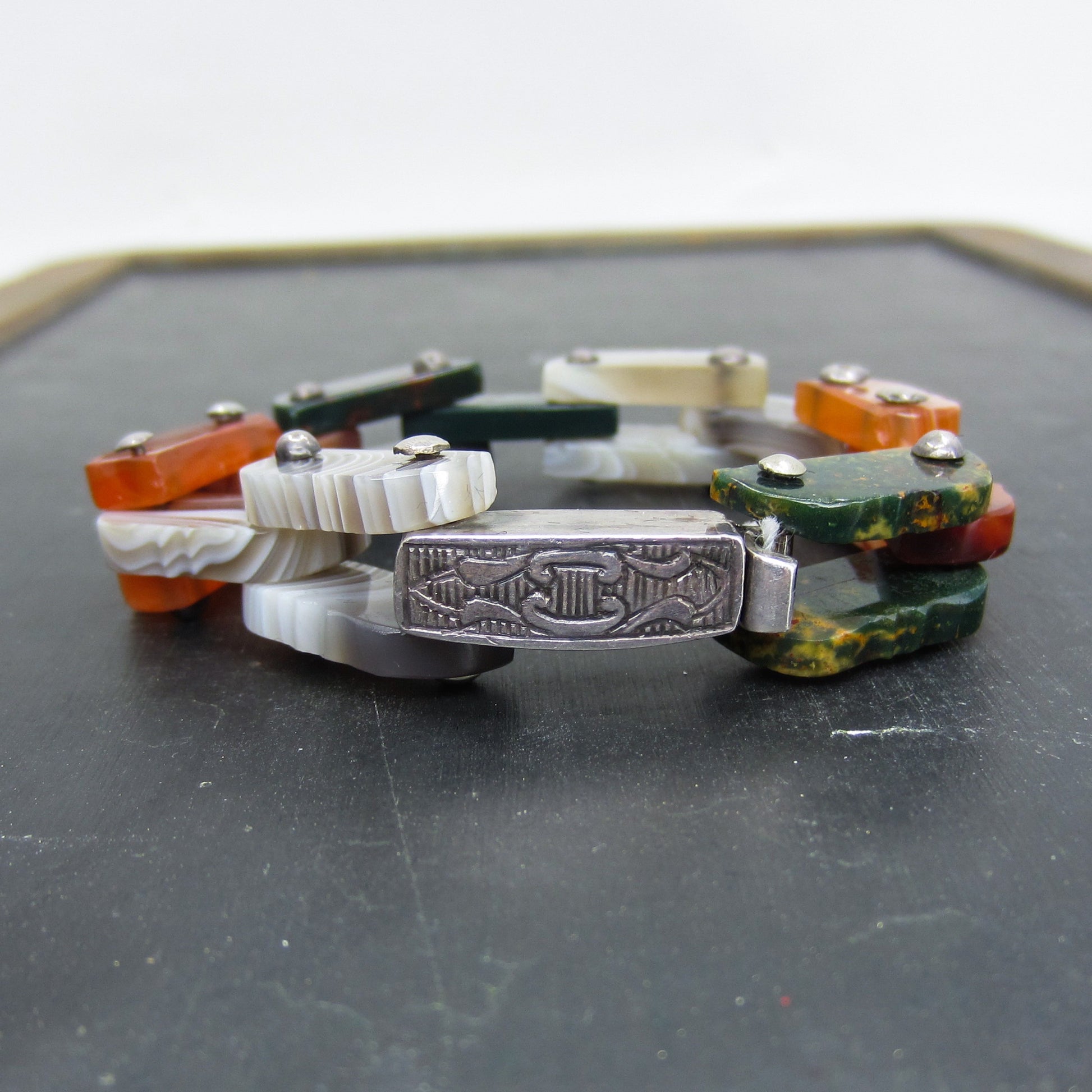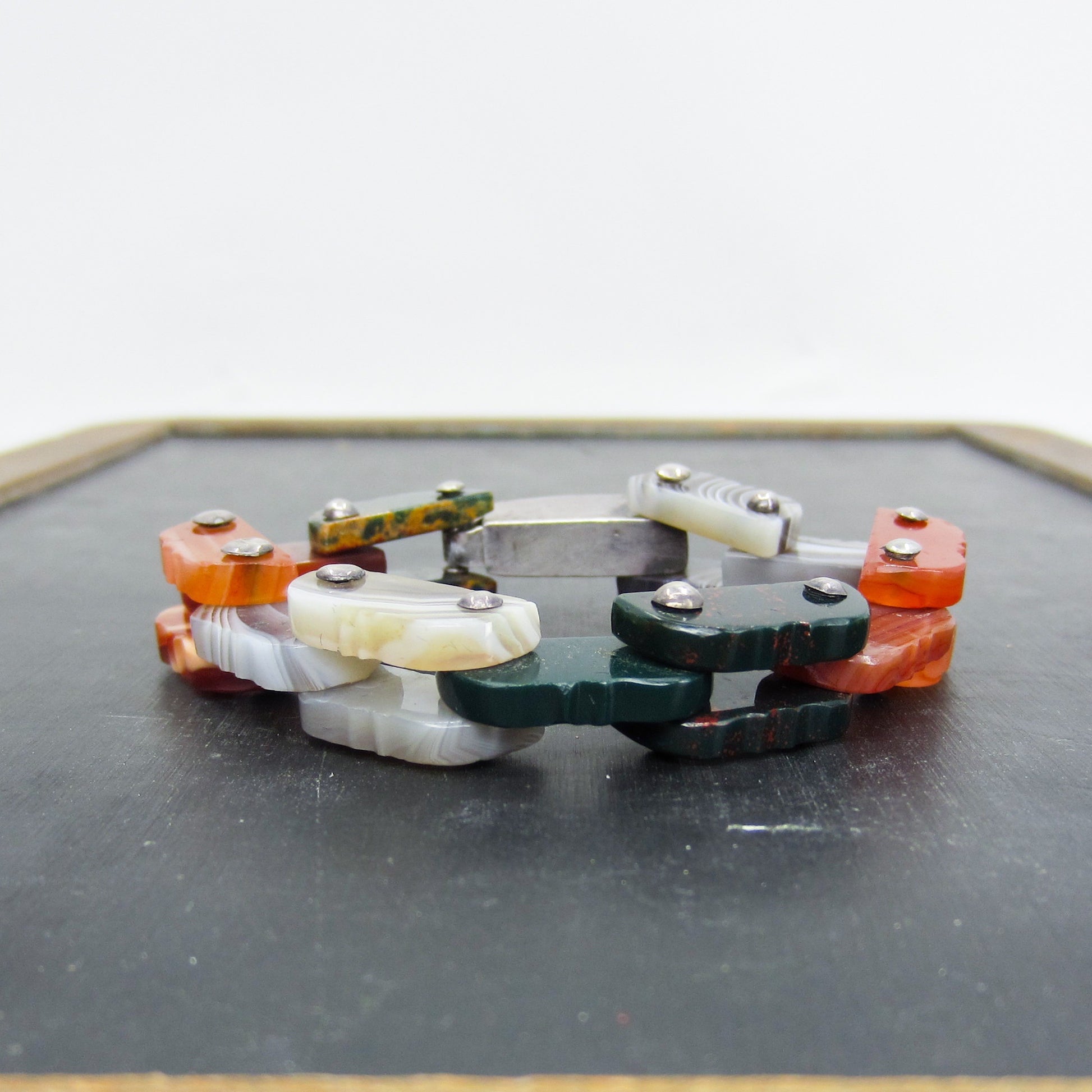 This is another fantastic piece of Scottish agate jewelry from the late 1800's, popularized at the time by Queen Victoria's love of Scotland and Scottish jewelry. Made circa 1880, this bracelet's links are made of the agate themselves, with carnelian, jasper, banded agate and bloodstone riveted together to form a flexible piece full of color and beauty. The sterling silver clasp has Celtic motif engraving. In incredible antique condition!