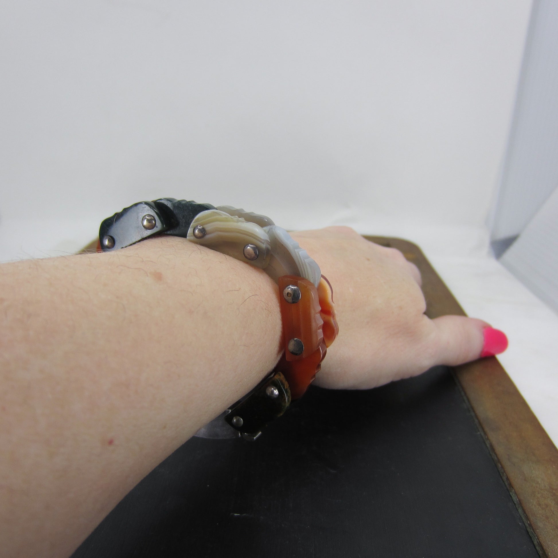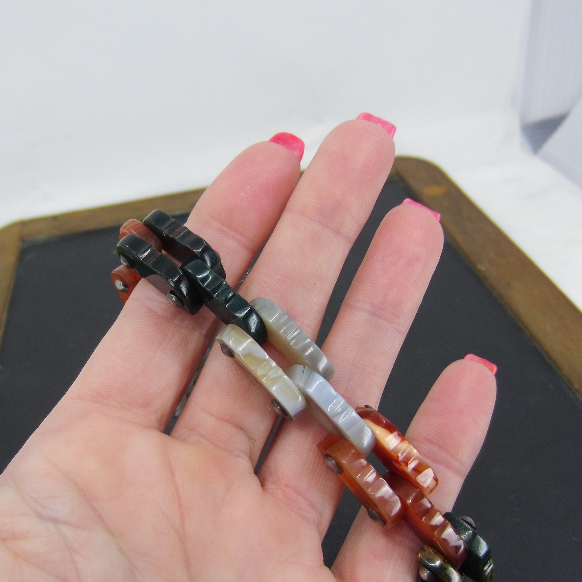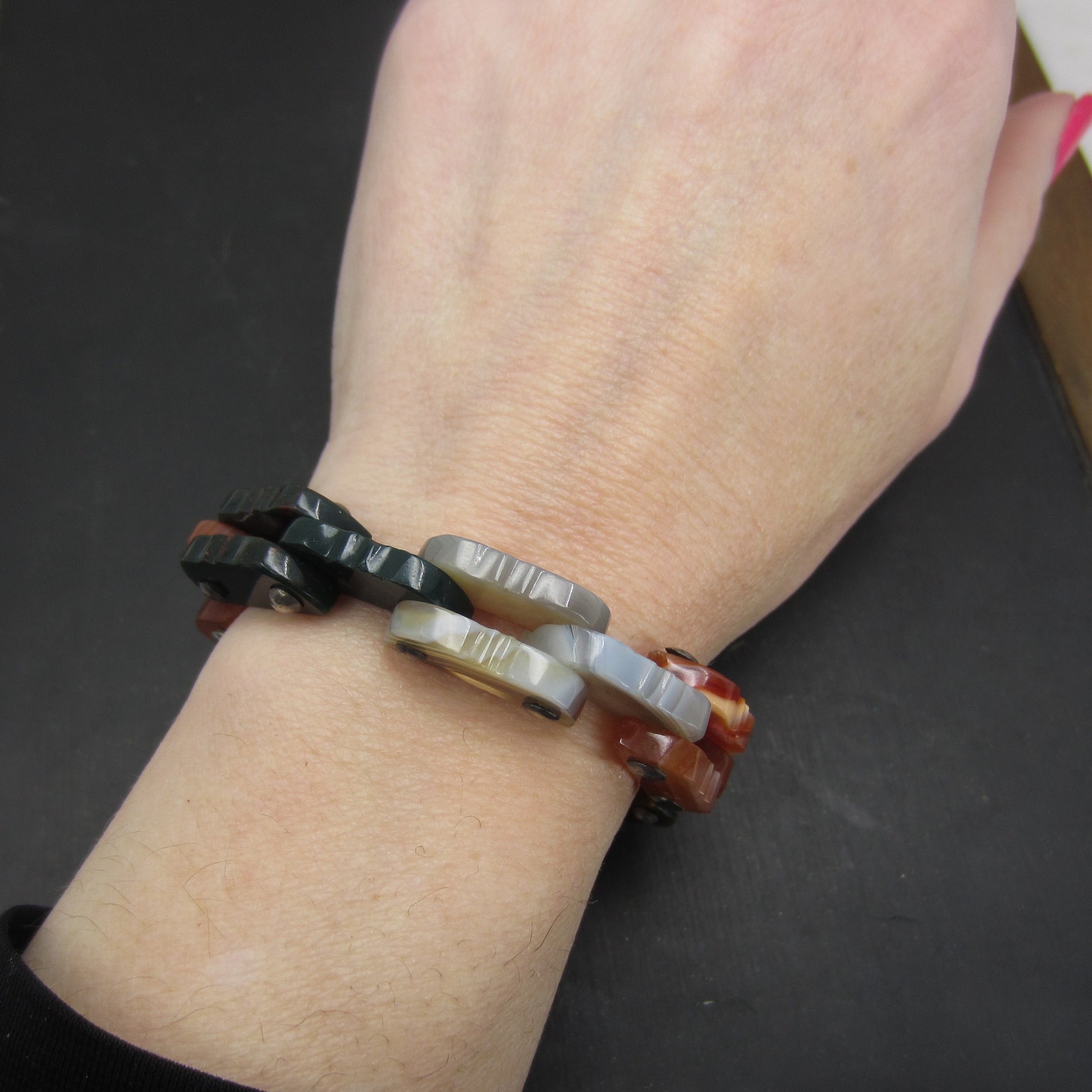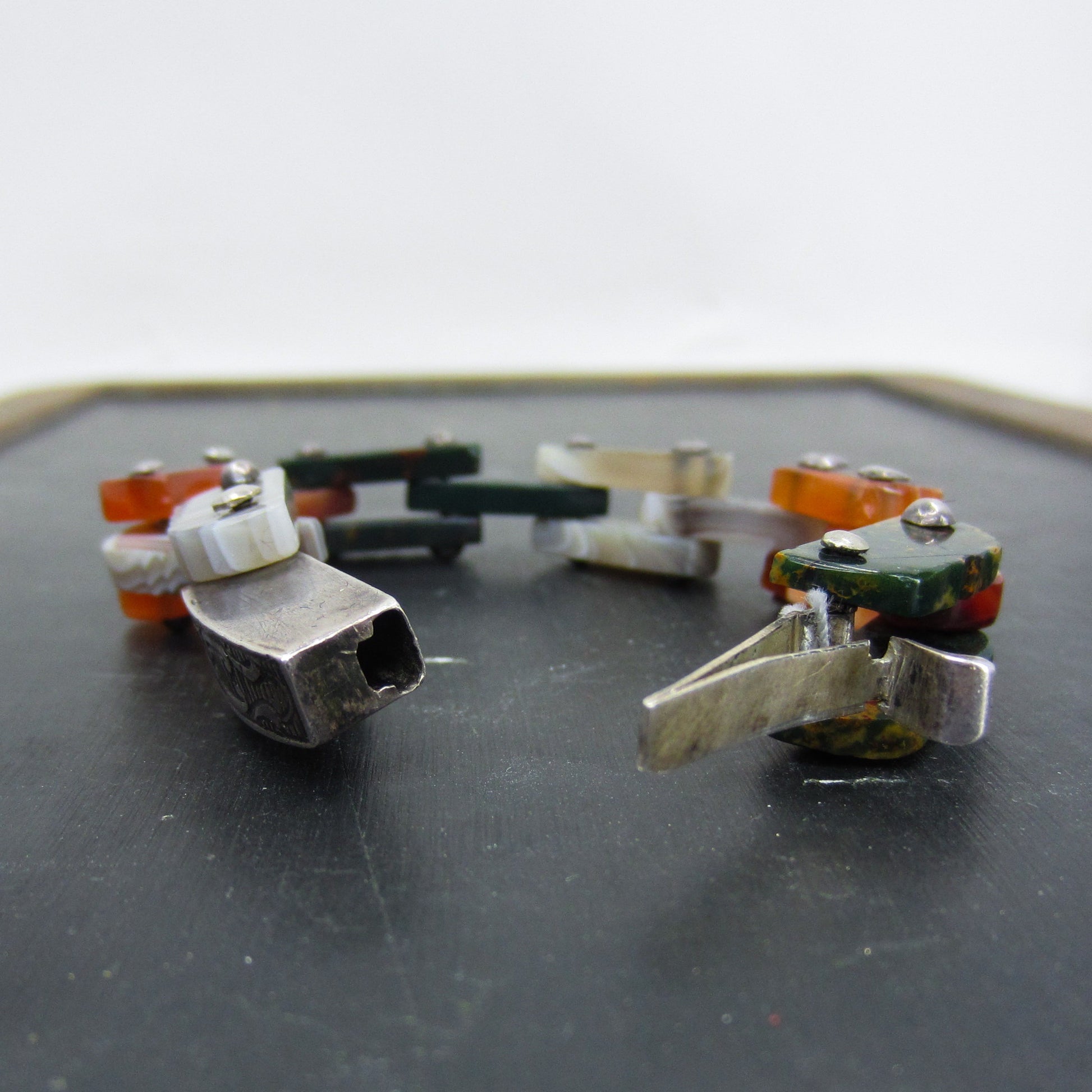 This is another fantastic piece of Scottish agate jewelry from the late 1800's, popularized at the time by Queen Victoria's love of Scotland and Scottish jewelry. Made circa 1880, this bracelet's links are made of the agate themselves, with carnelian, jasper, banded agate and bloodstone riveted together to form a flexible piece full of color and beauty. The sterling silver clasp has Celtic motif engraving. In incredible antique condition!
