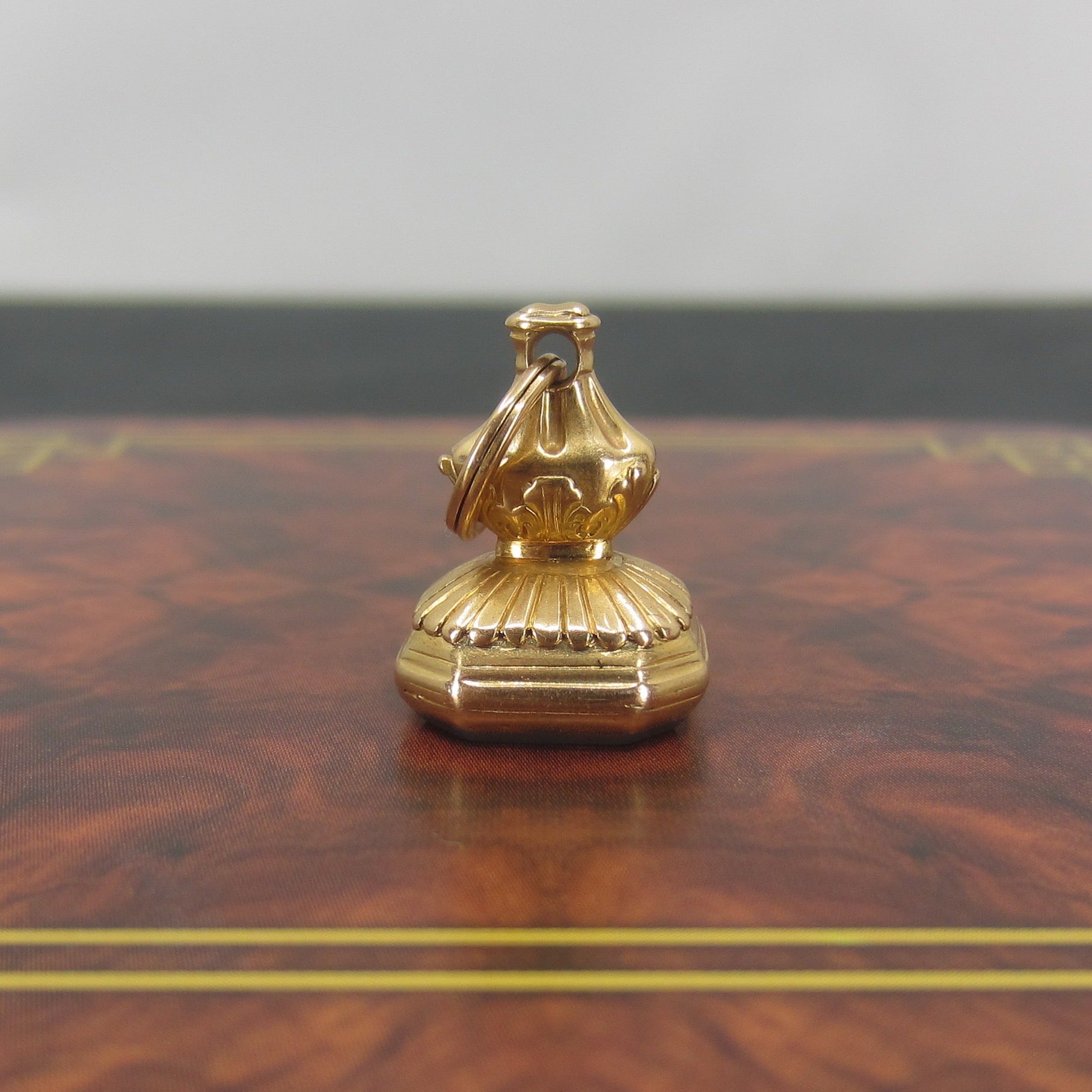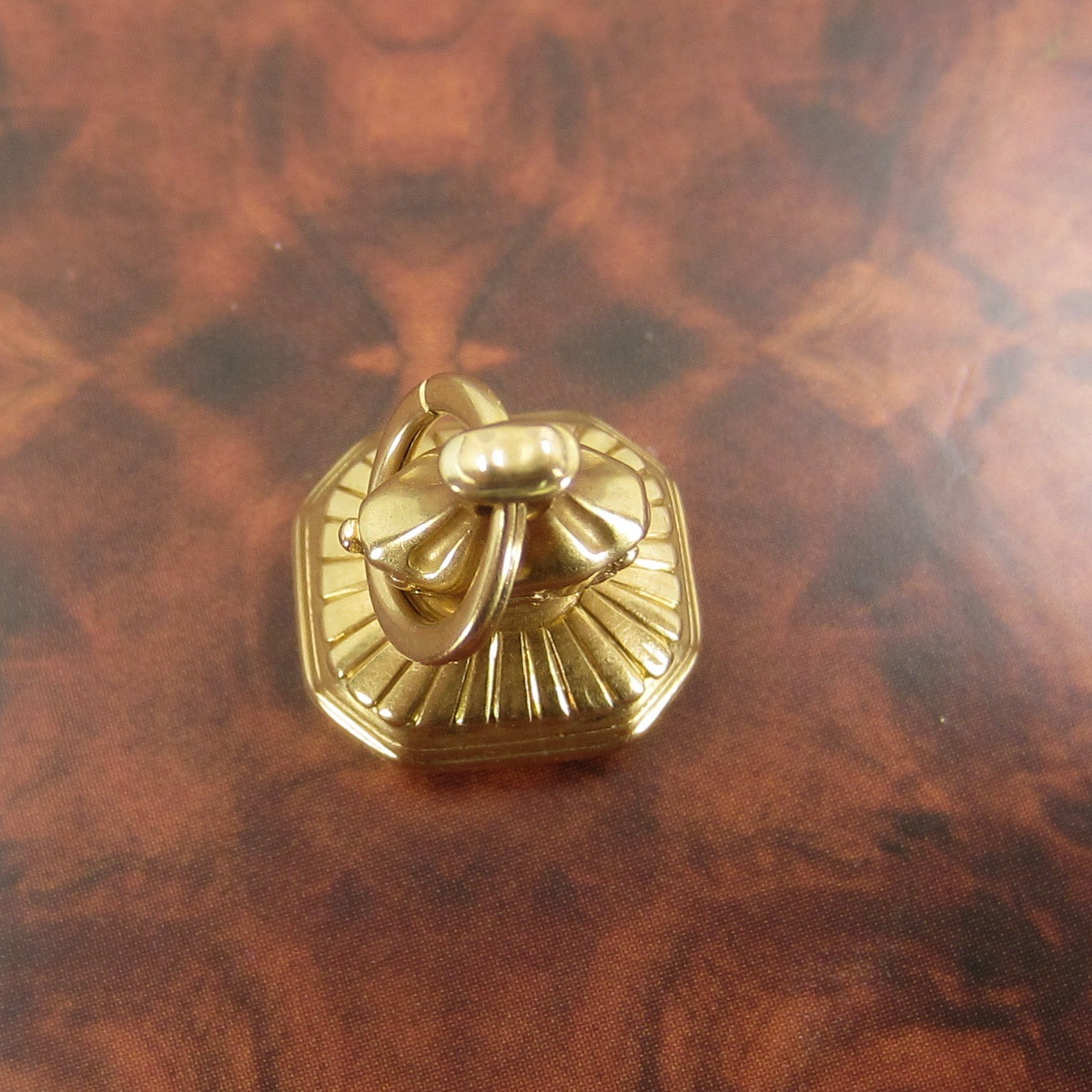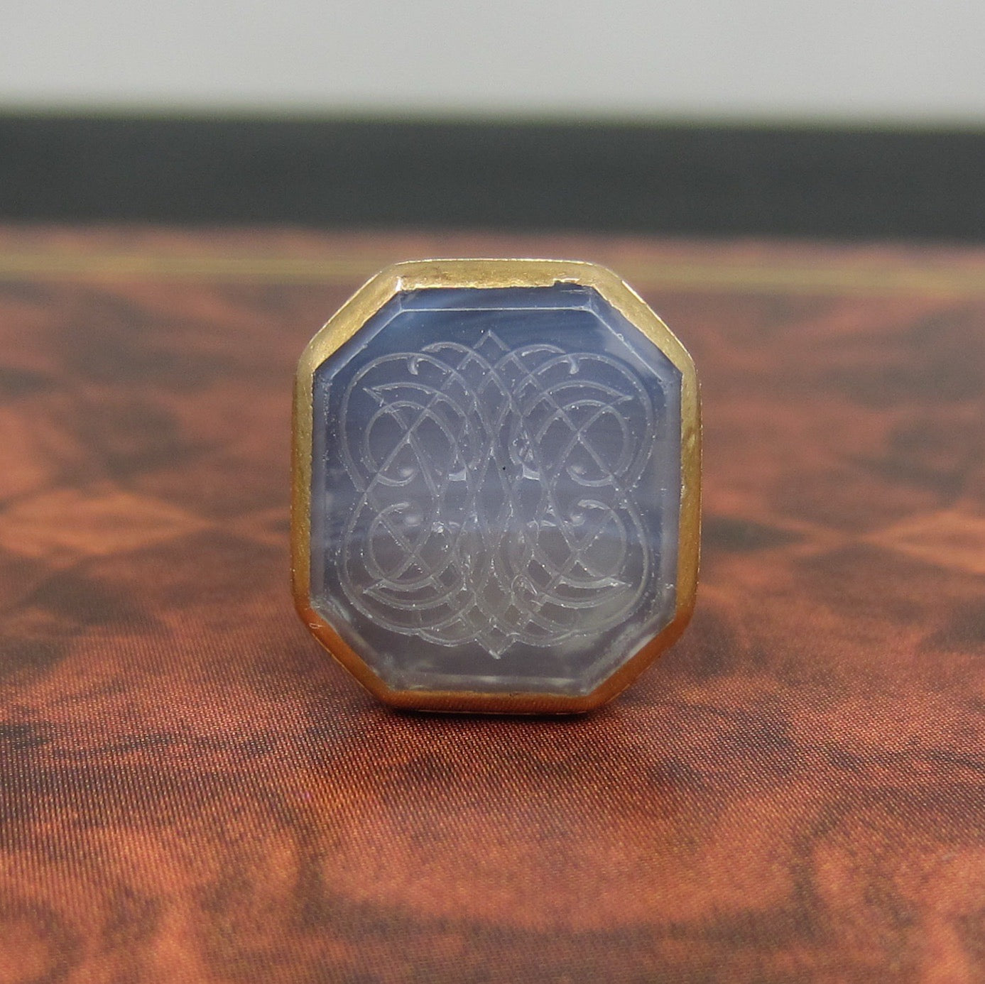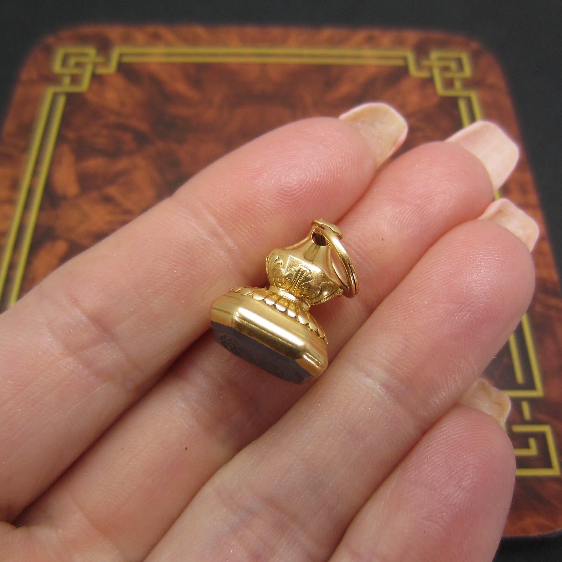 A tiny and perfect early Victorian seal fob pendant in 22k circa 1850's, with a carved chalcedony intaglio with a love knot design. With original antique jump ring.