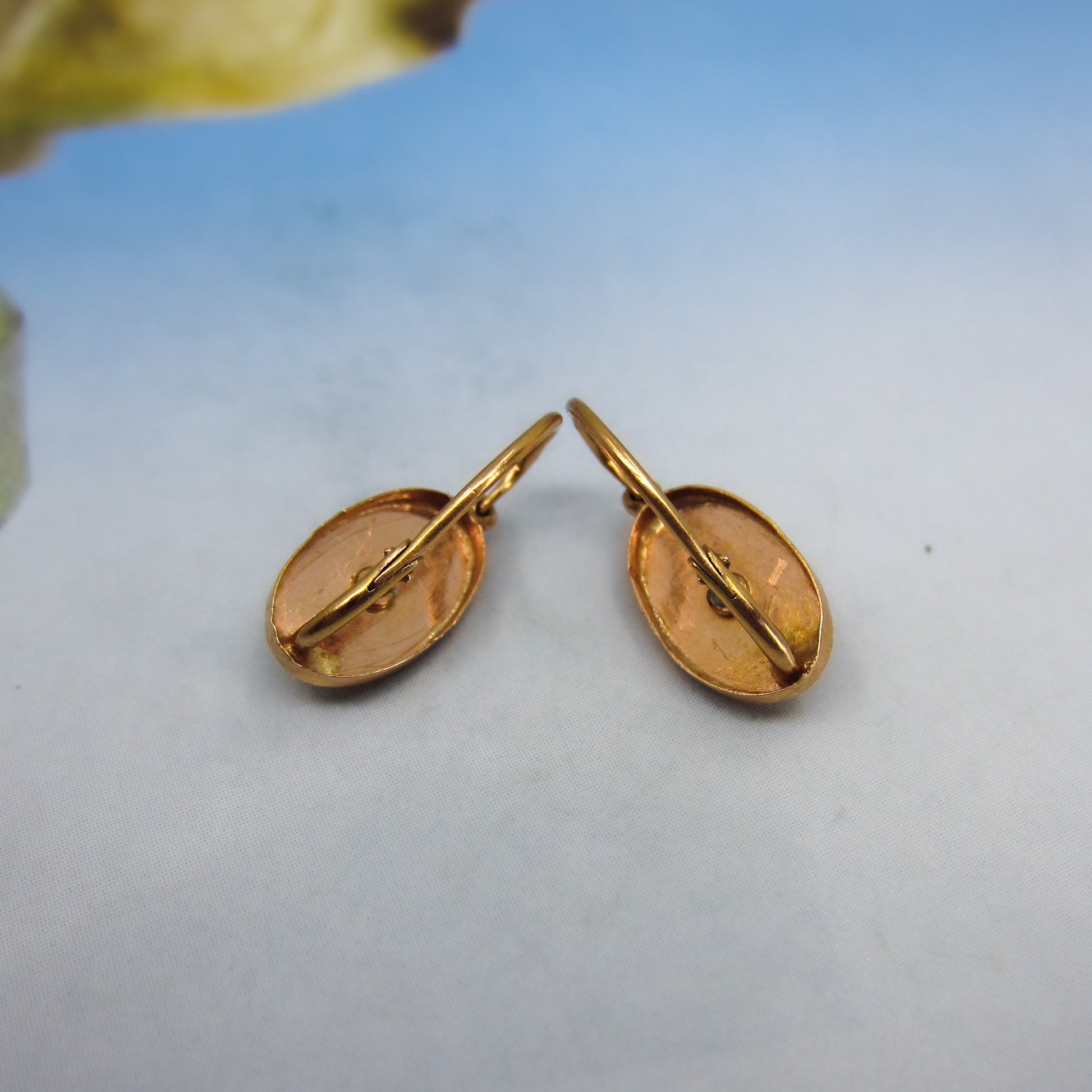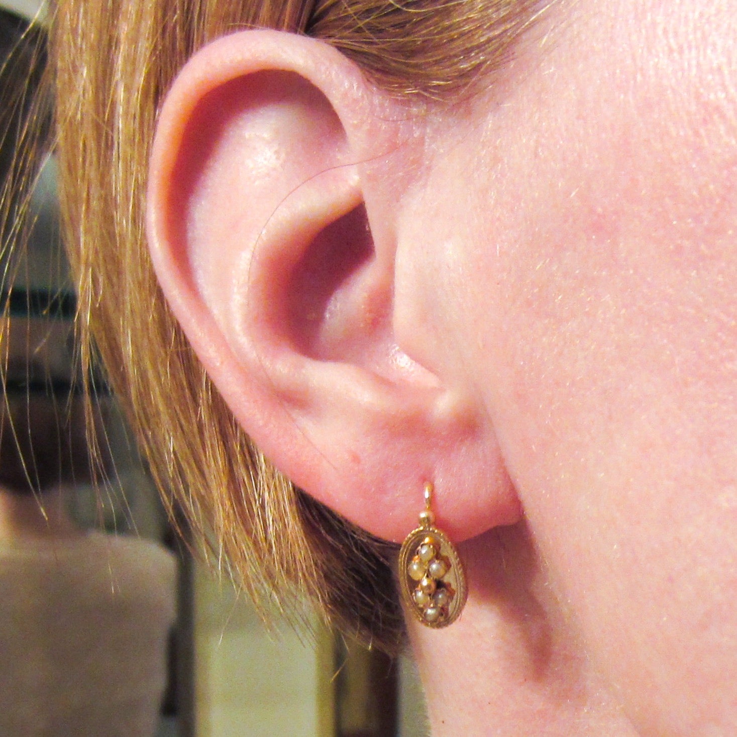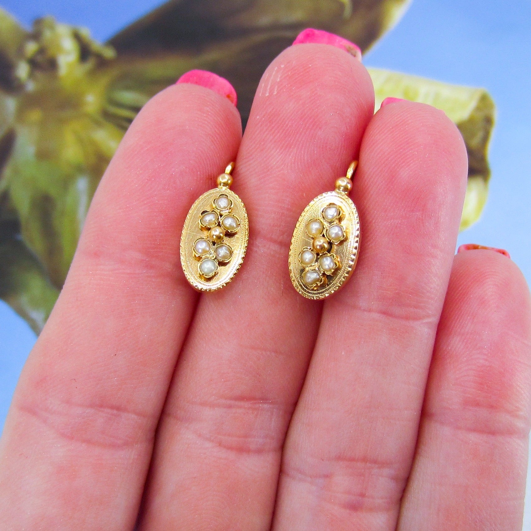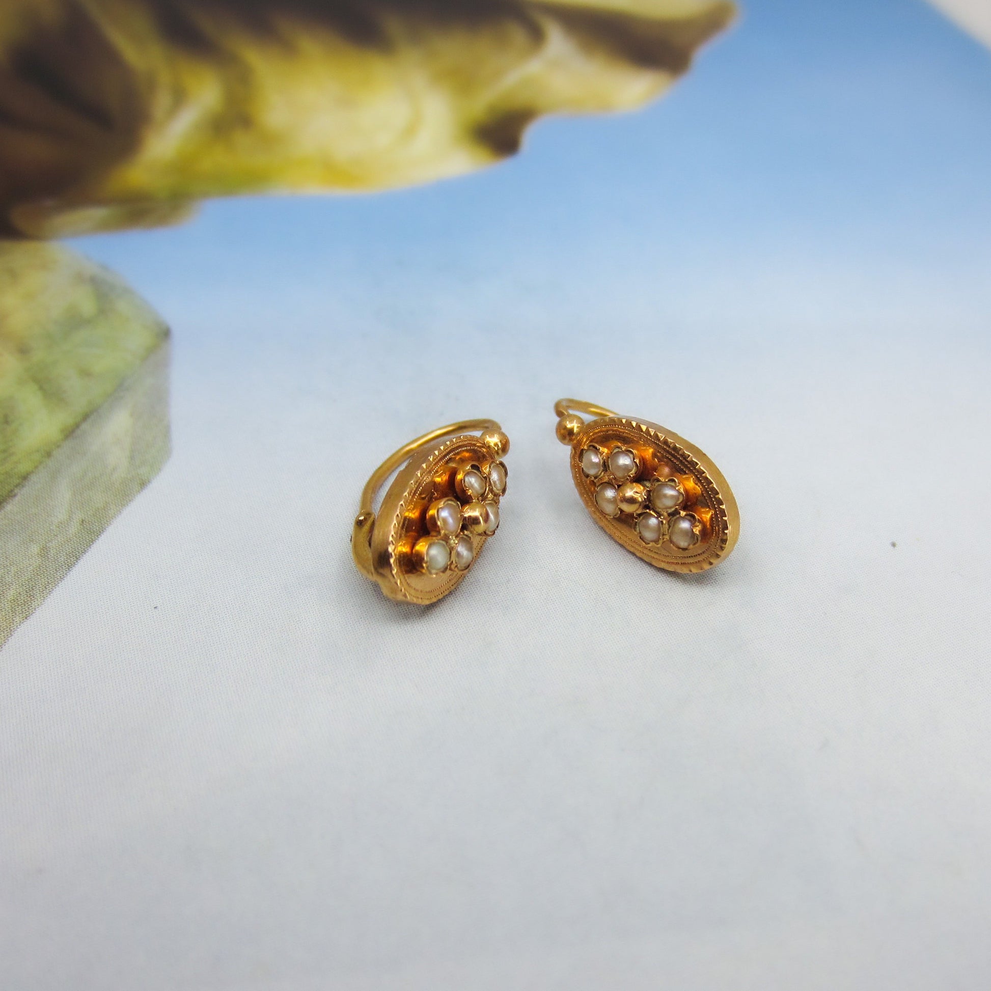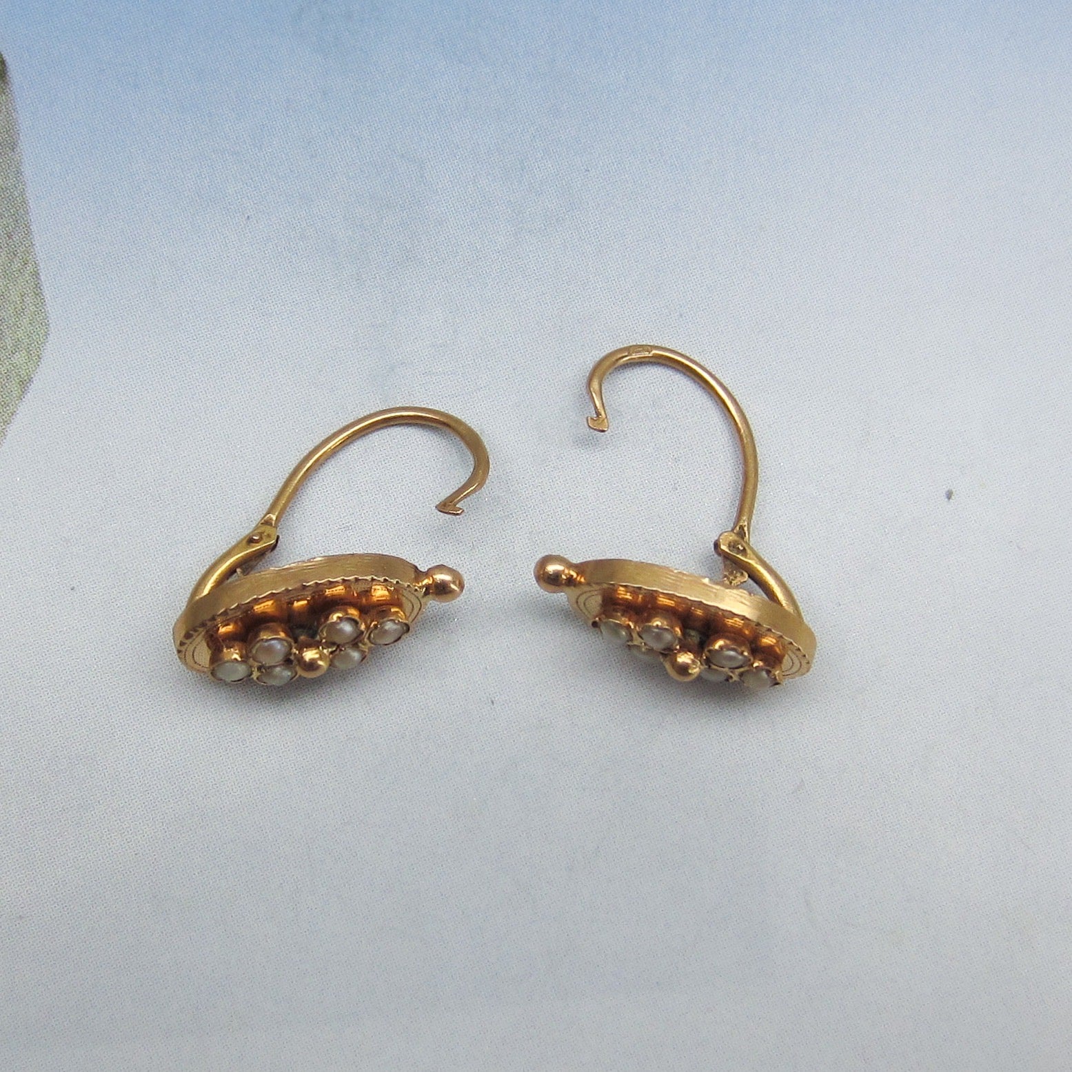 A pretty and every day wearable pair of antique French earrings, made in the late 1800's in 18k gold and sprinkled with seed pearls. As these are French, these earrings go backwards through the ear so if you haven't seen this before and are thinking of purchasing, please contact us and I can explain how to put them on!