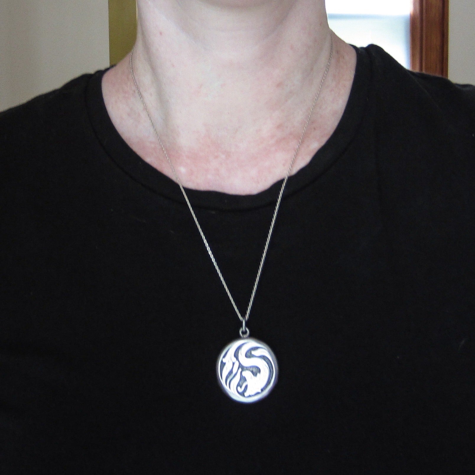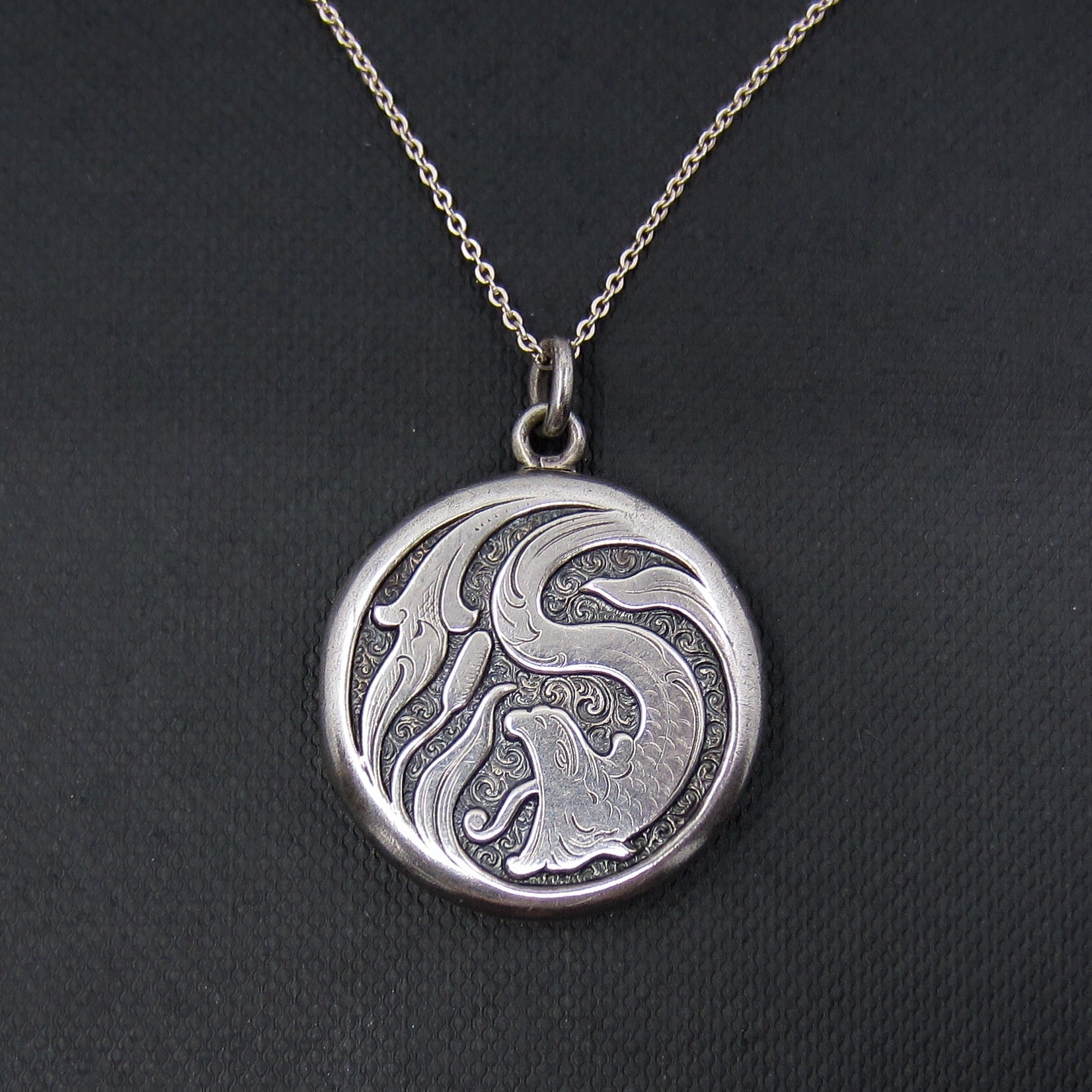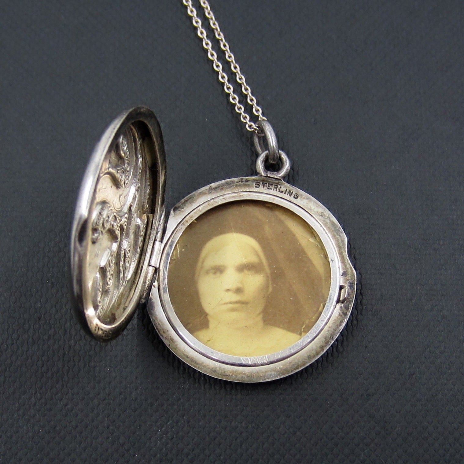 This gorgeously designed antique locket was made in the late 1800's and depicts and snake or serpent amongst the reeds. The style is a bit Celtic, a bit Art Nouveau, a bit Scandinavian so its origin is unknown but what I do know is that it's fabulous. And maybe a little haunted? Inside there is a photo of a VERY INTENSE NUN. I'm sure she was a very nice person! Made in sterling silver and in great condition!