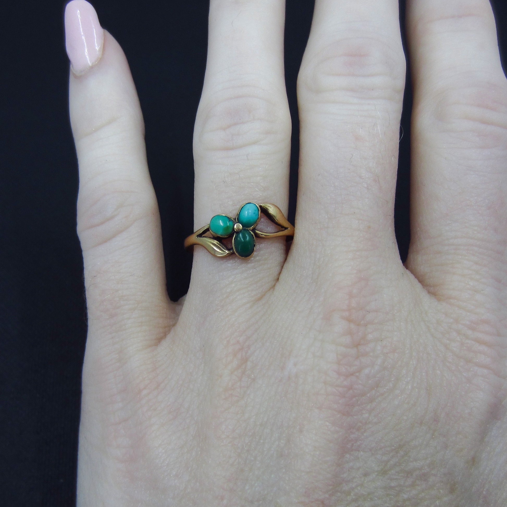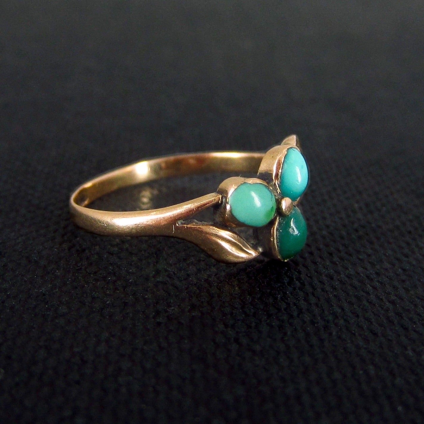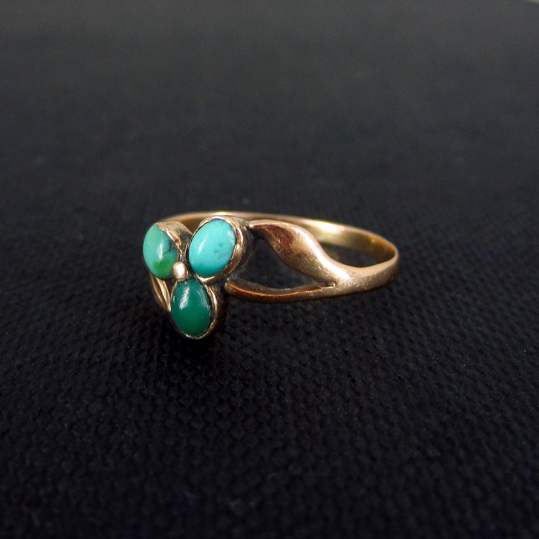 A dainty and very pretty Victorian ring cIrca 1890 featuring three turquoise cabochons set as petals in a flower in 14k.