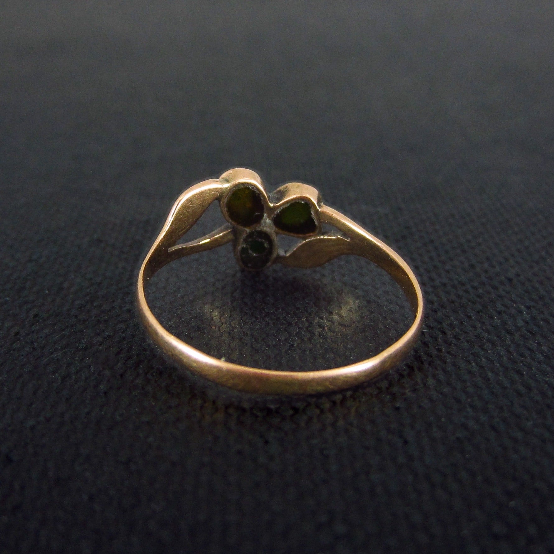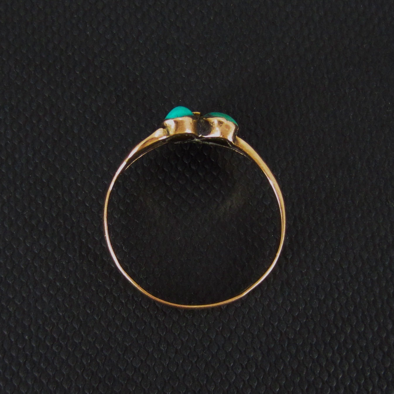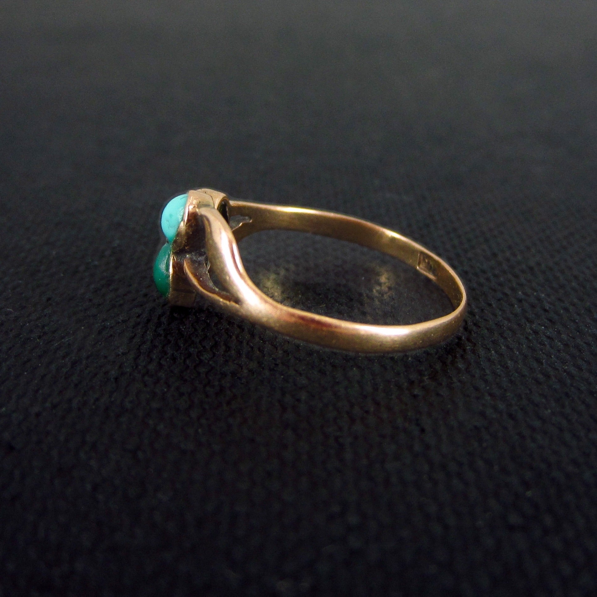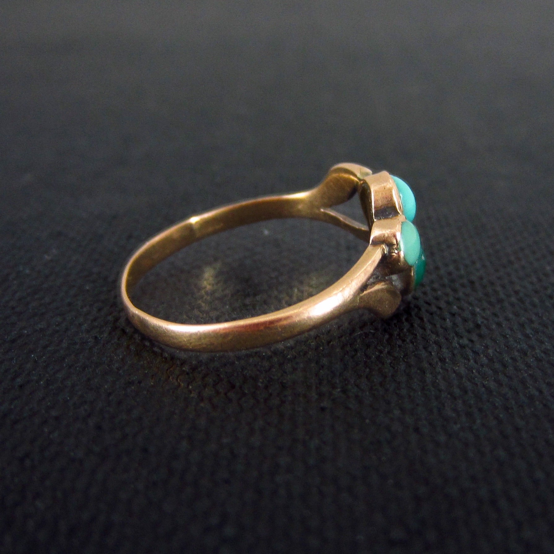 A dainty and very pretty Victorian ring cIrca 1890 featuring three turquoise cabochons set as petals in a flower in 14k.