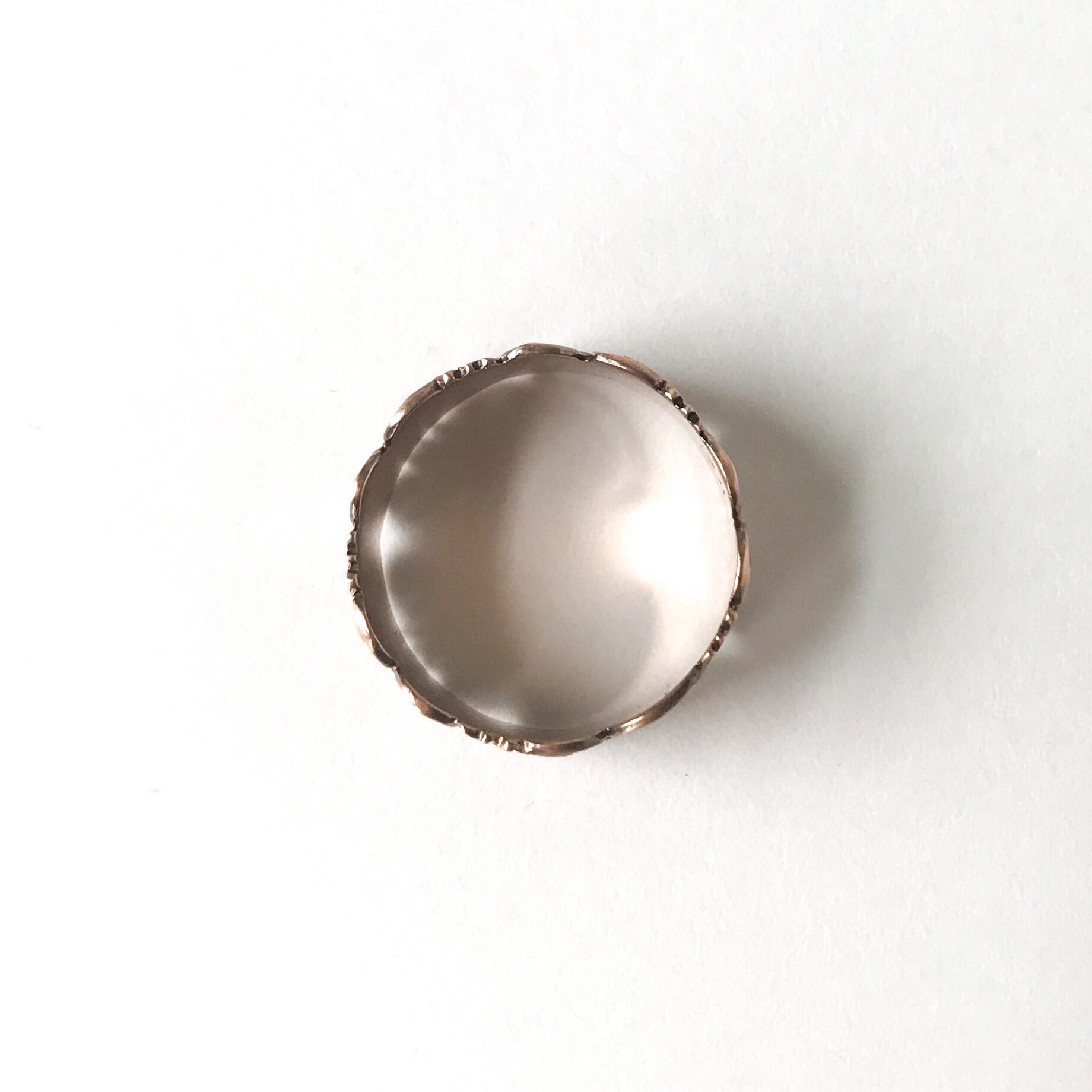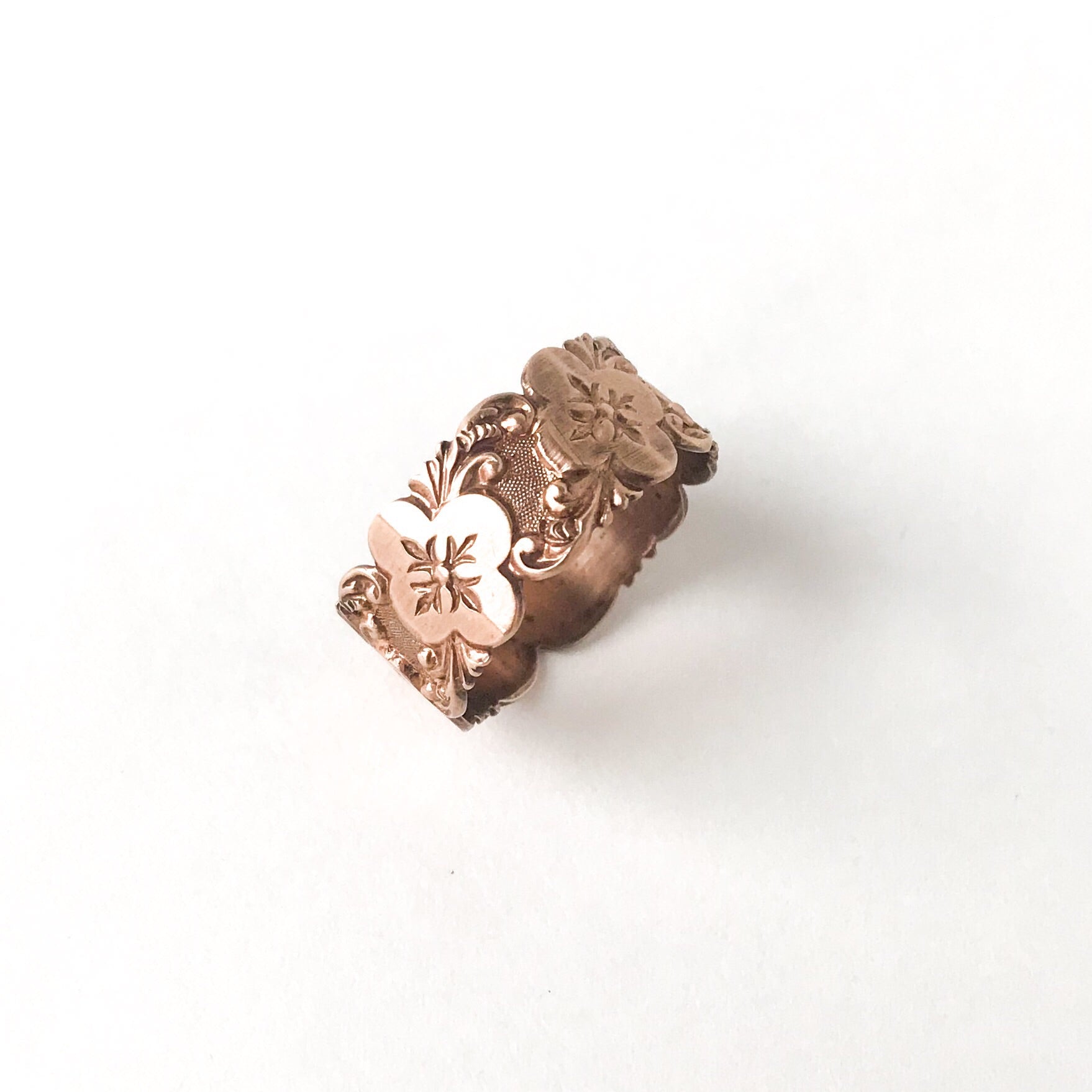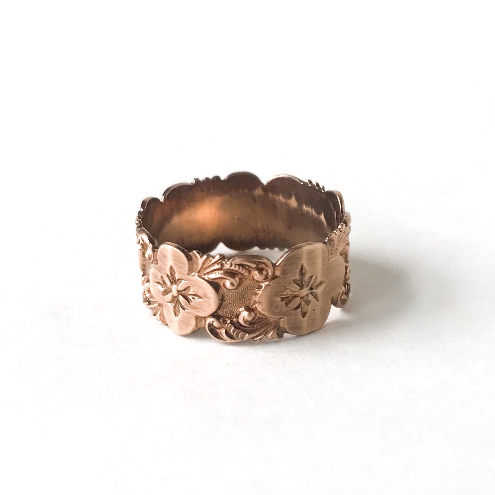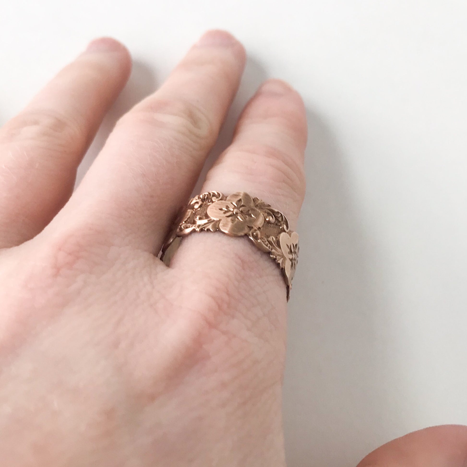 This beautifully patterned Victorian band was made in 14k rose gold circa 1880 and has a graceful floral and scroll pattern throughout. This band is a size 10.5 and it is very rare to see these Victorian bands in the larger sizes, so if you've been looking for one and this is your size, snatch this up, it is gorgeous!
