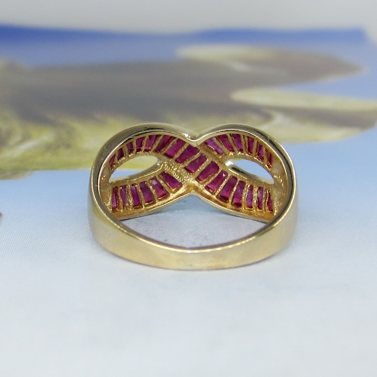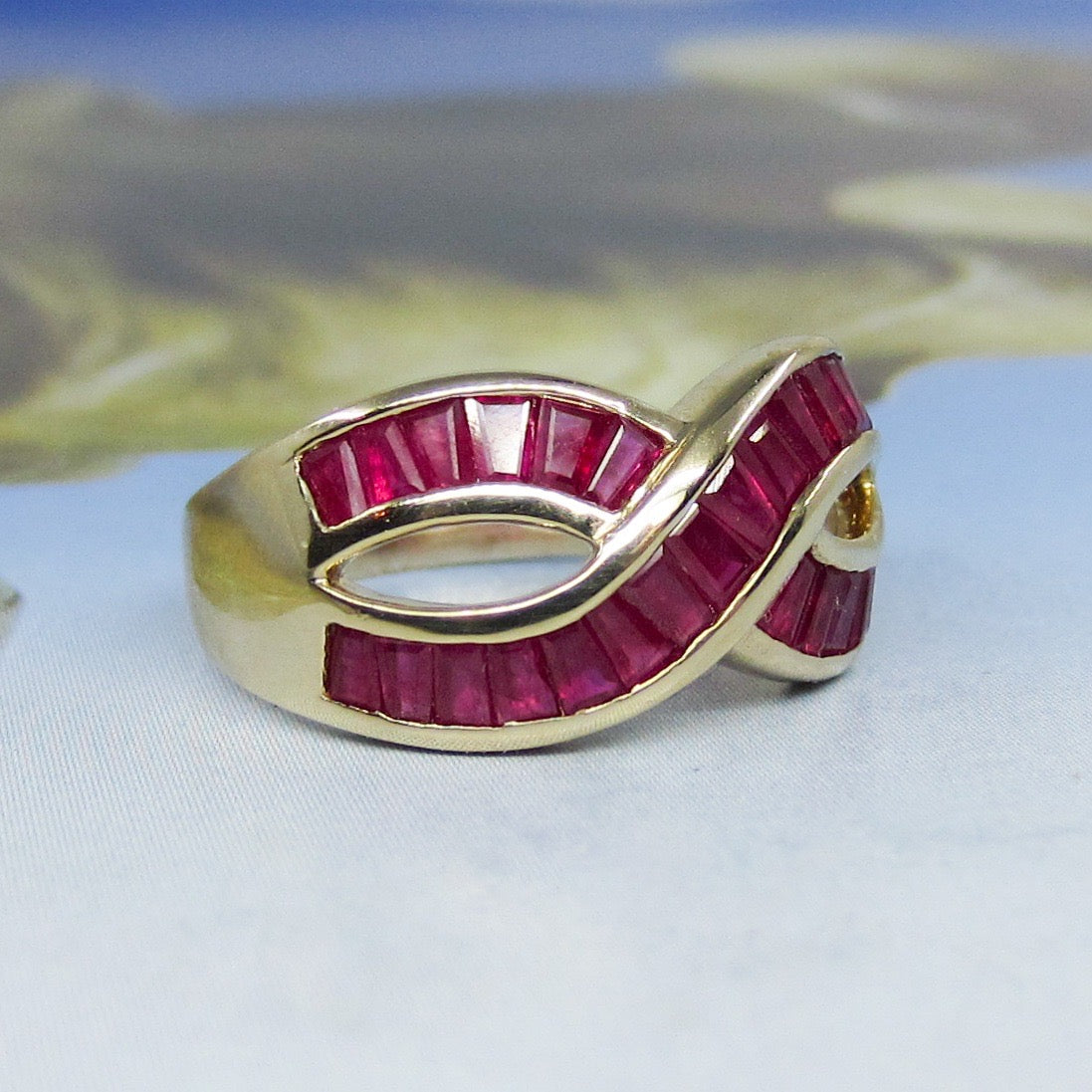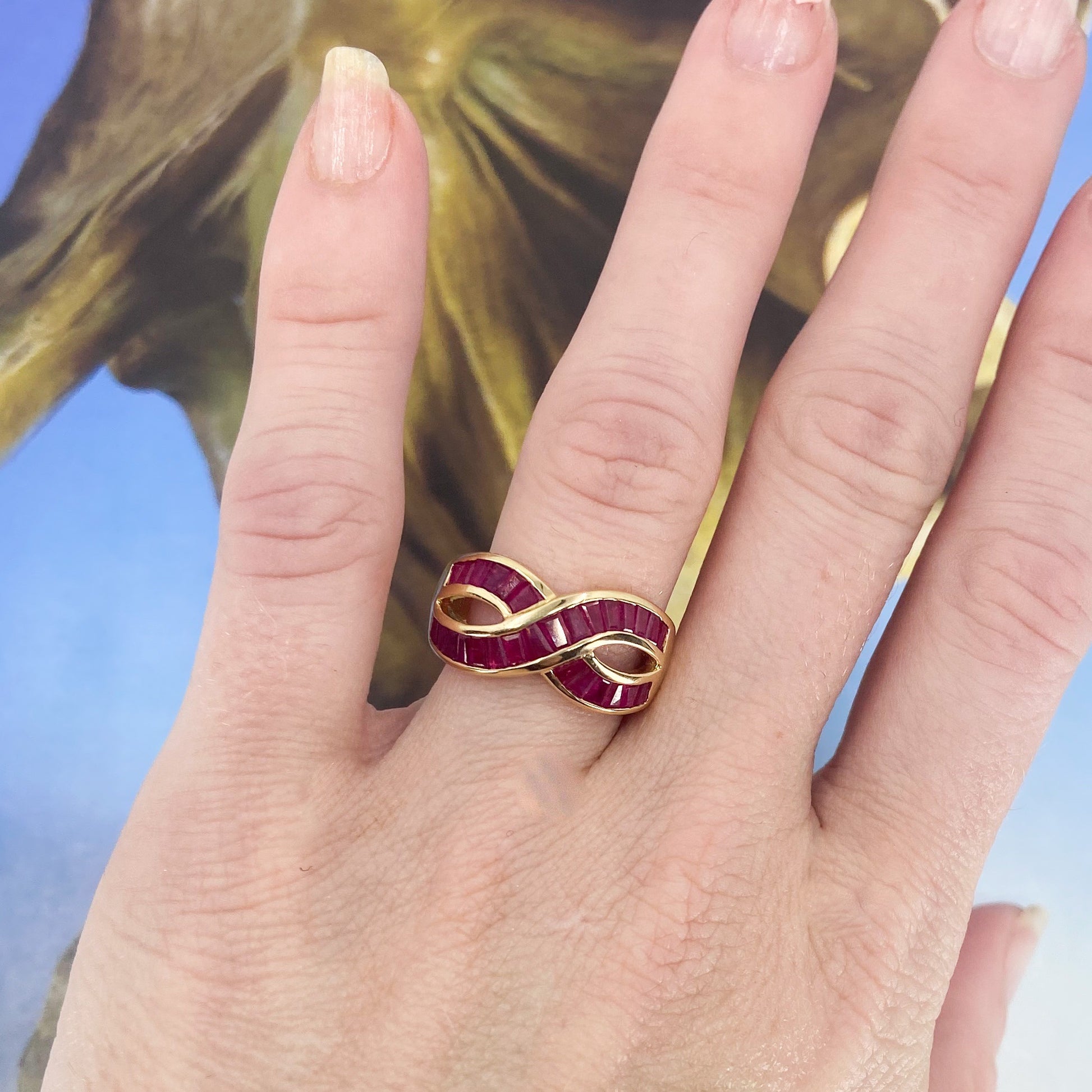 SOLD--Vintage 90’s Ruby Baguette Infinity Ring 14k c. 1995