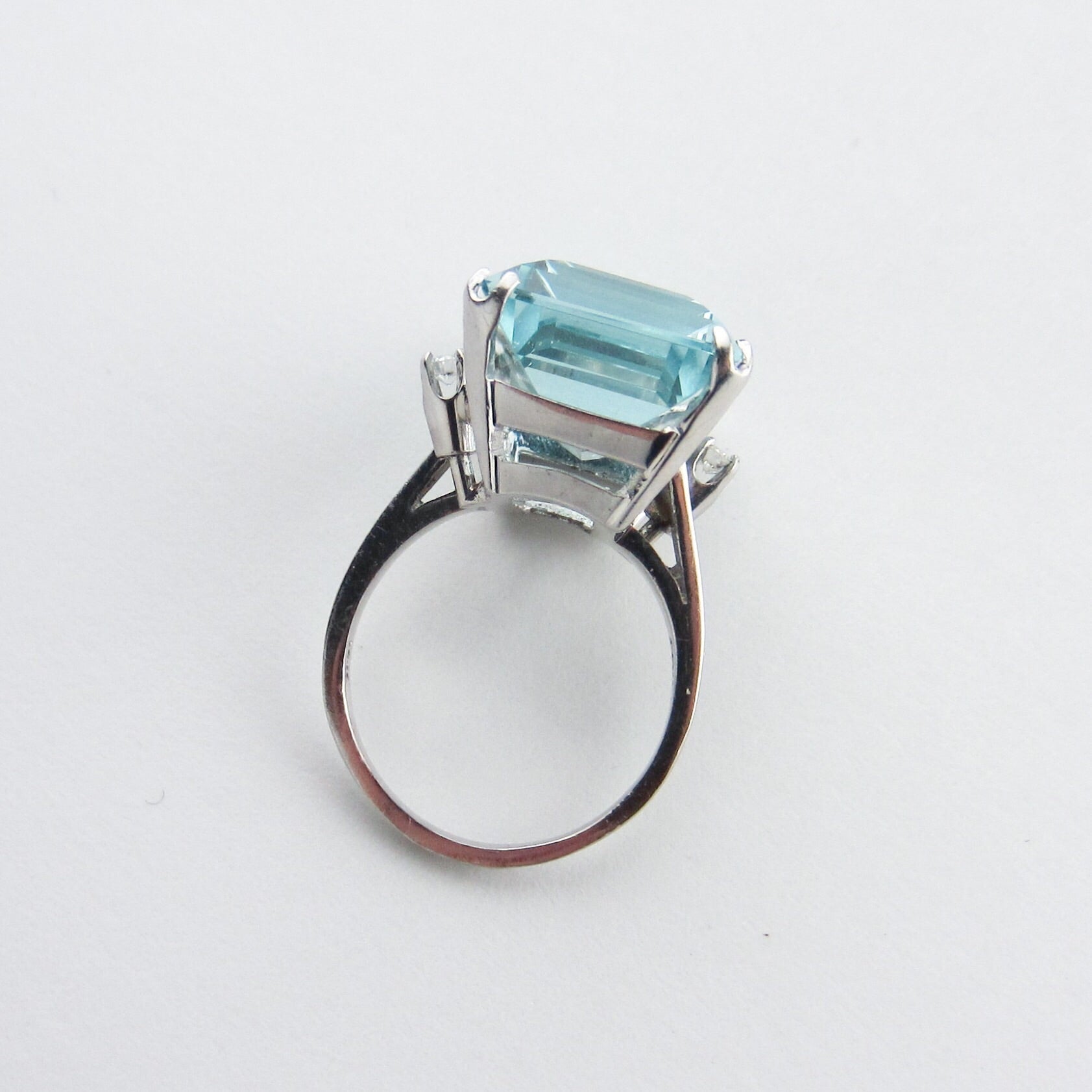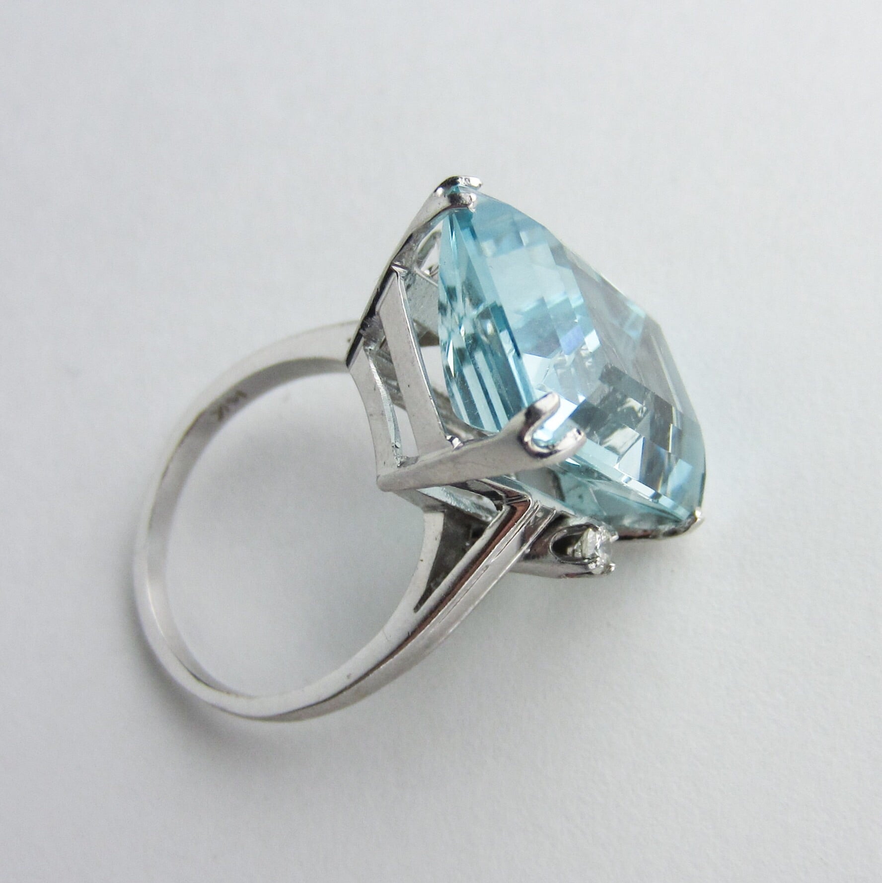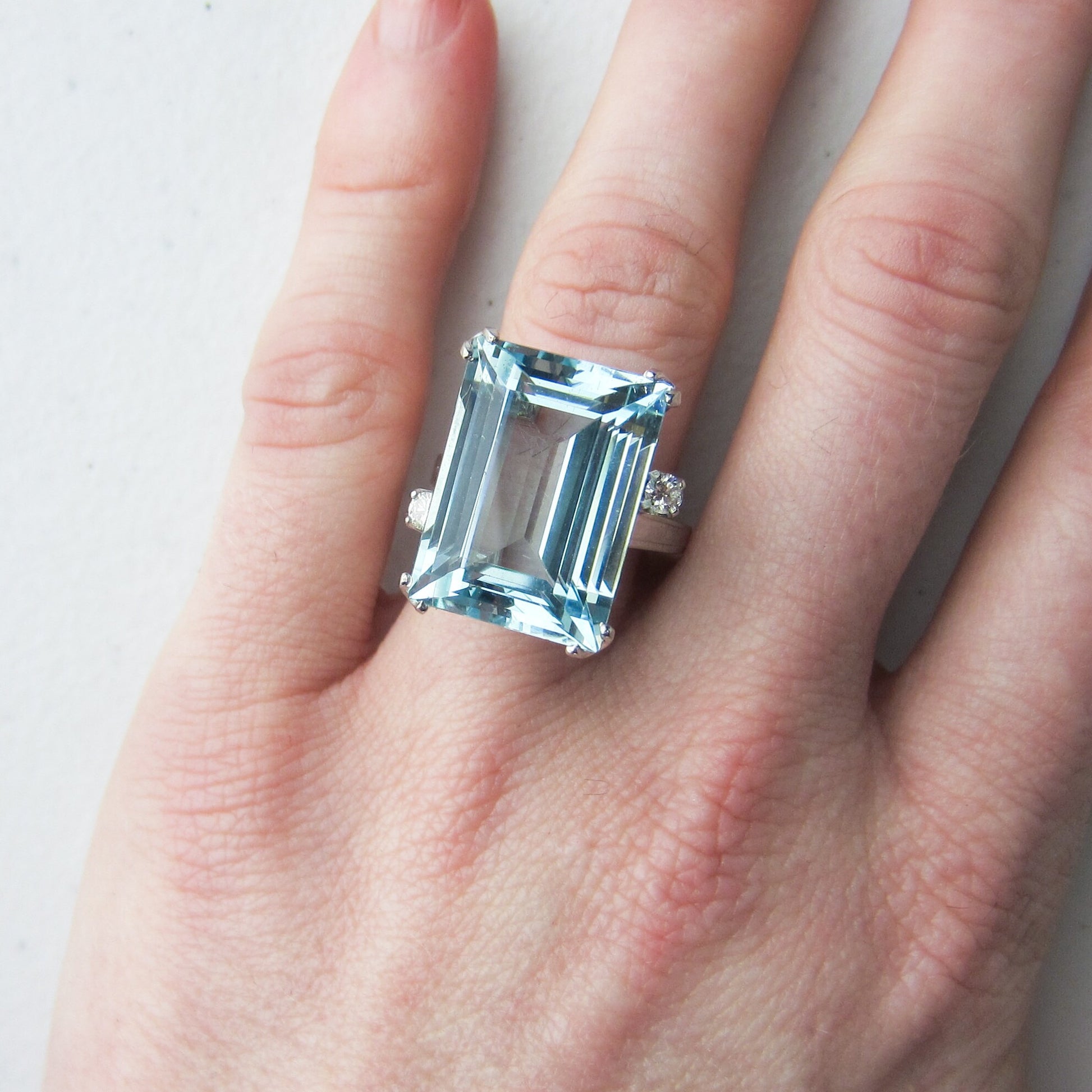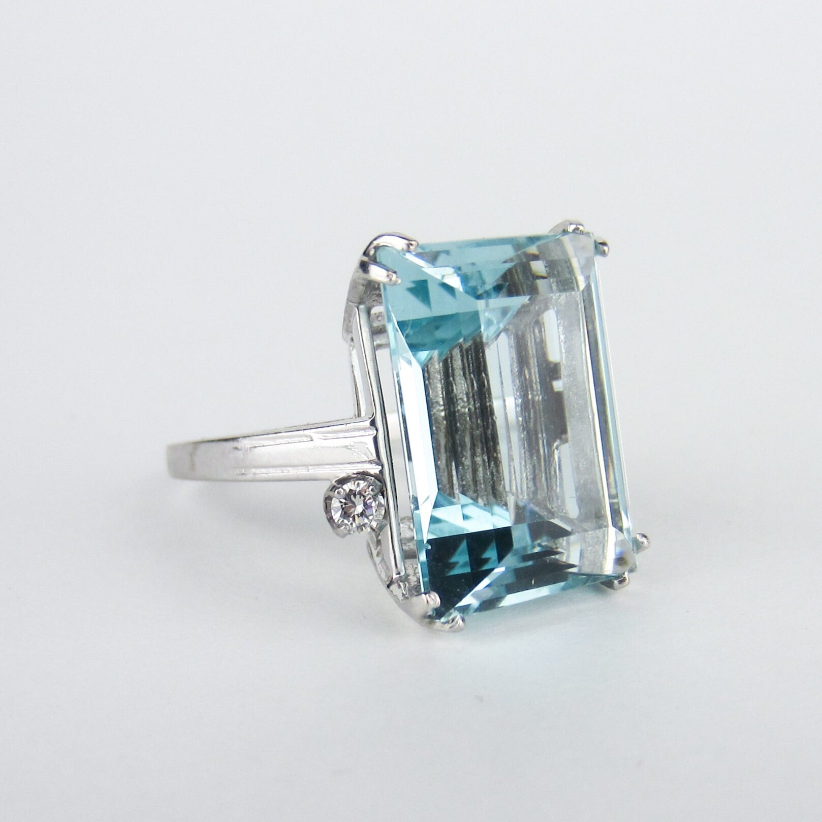 A stunner of a cocktail ring from the Mid-Century period, this ring holds a 15ct natural aquamarine that has just gorgeous cut and color. It is dotted by two .07ct natural diamonds that offer a bit of extra sparkle! It is FANTASTIC on, everyone who has tried this ring loves it and I love it too. The stone is big and the ring has great presence, but it's not so big that you can't really wear it and I adore the whimsical and very Mid-Century asymmetry of the diamonds. If you're looking for a beautiful, high quality aquamarine ring with classic, elegant design don't pass this beauty by!