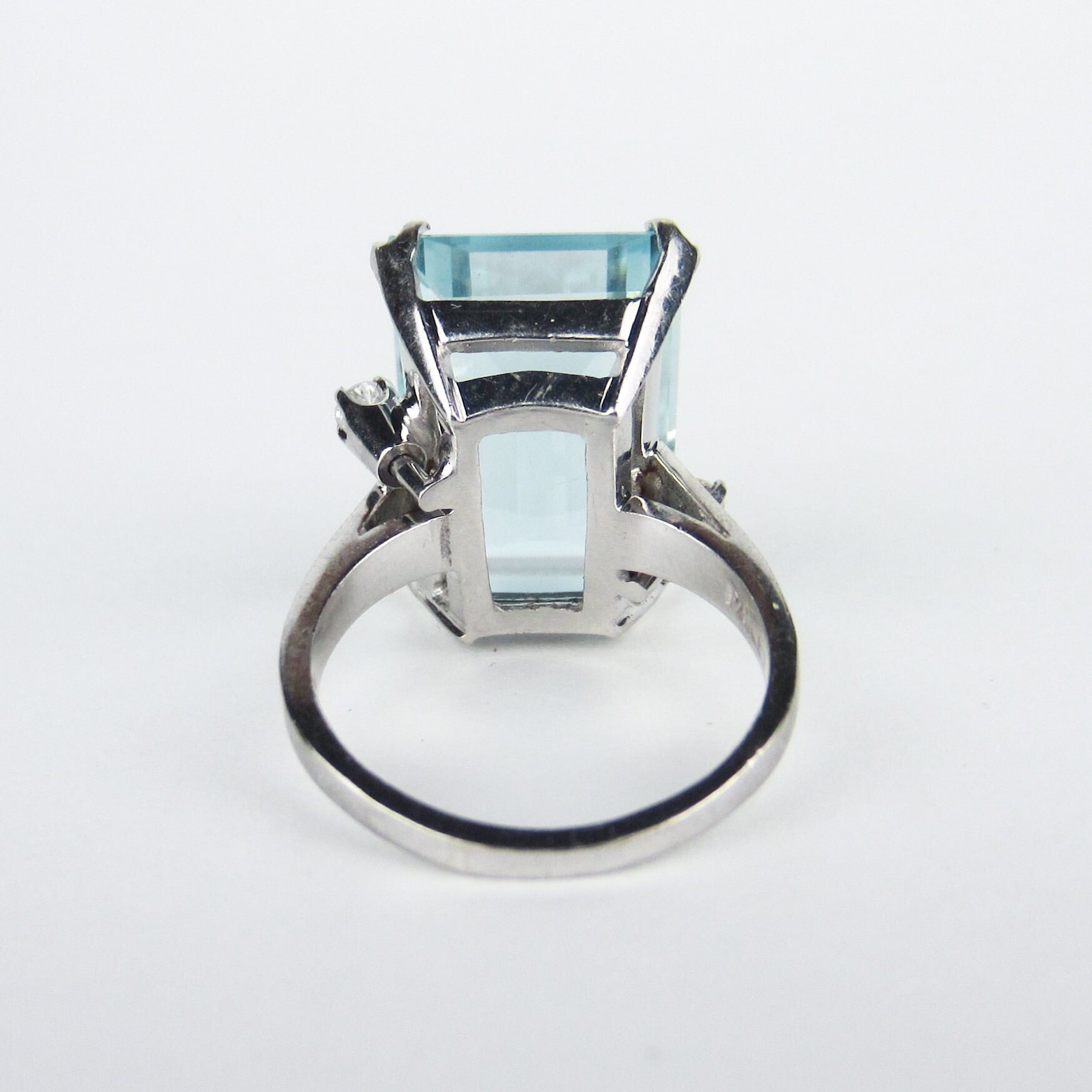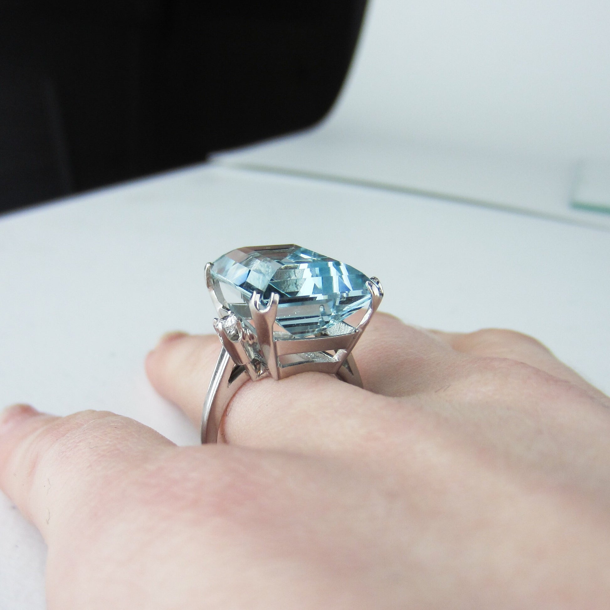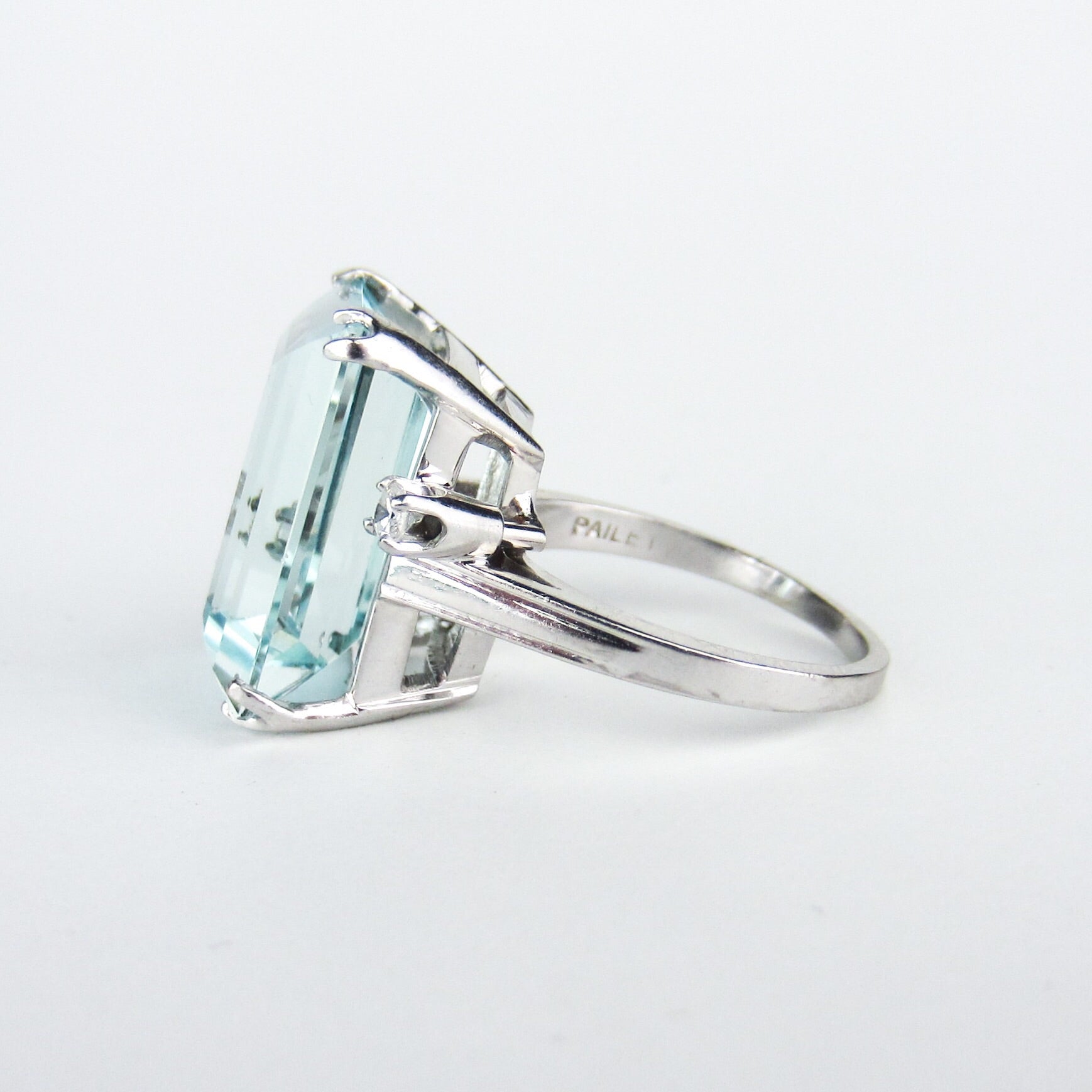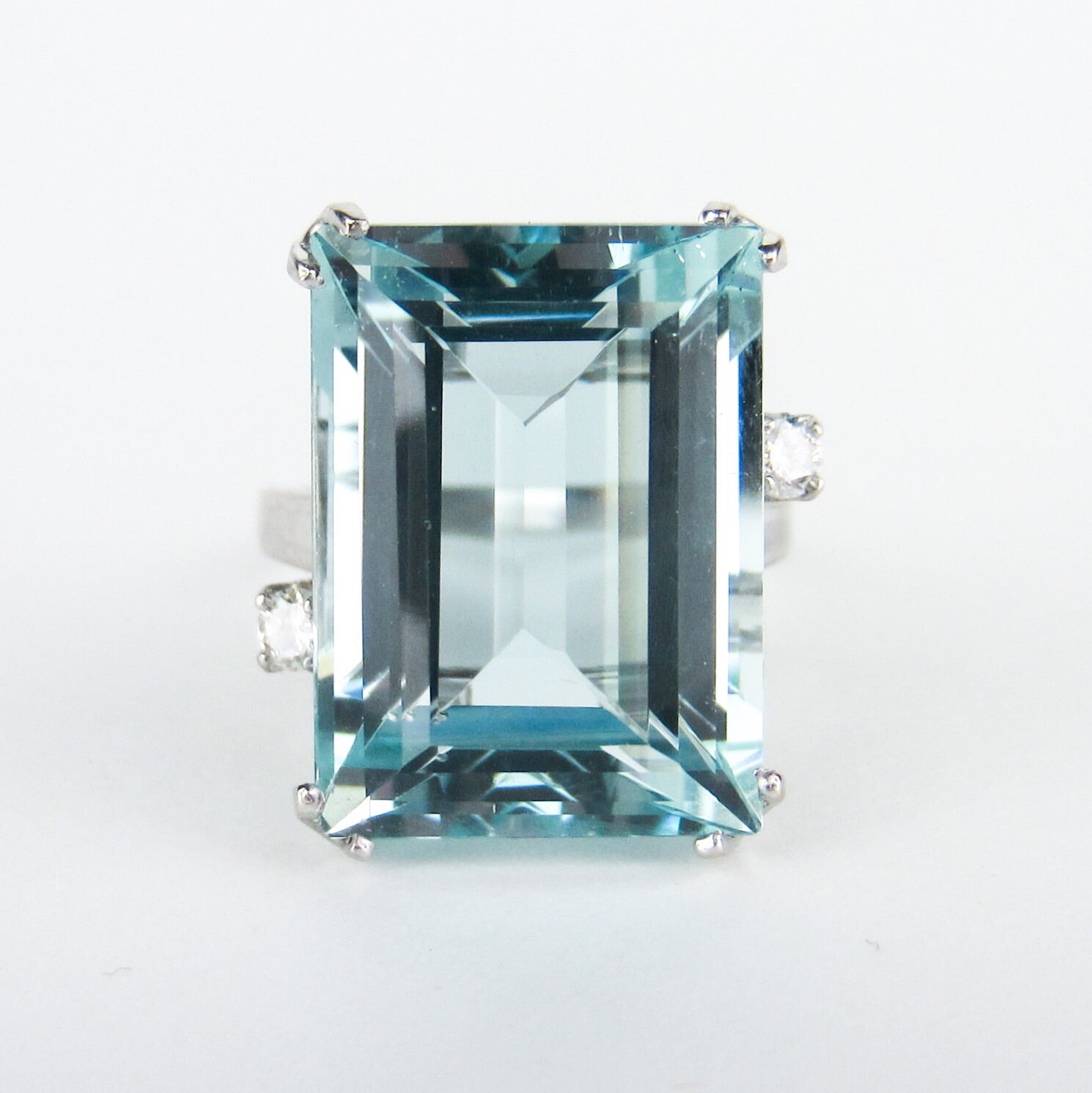 A stunner of a cocktail ring from the Mid-Century period, this ring holds a 15ct natural aquamarine that has just gorgeous cut and color. It is dotted by two .07ct natural diamonds that offer a bit of extra sparkle! It is FANTASTIC on, everyone who has tried this ring loves it and I love it too. The stone is big and the ring has great presence, but it's not so big that you can't really wear it and I adore the whimsical and very Mid-Century asymmetry of the diamonds. If you're looking for a beautiful, high quality aquamarine ring with classic, elegant design don't pass this beauty by!