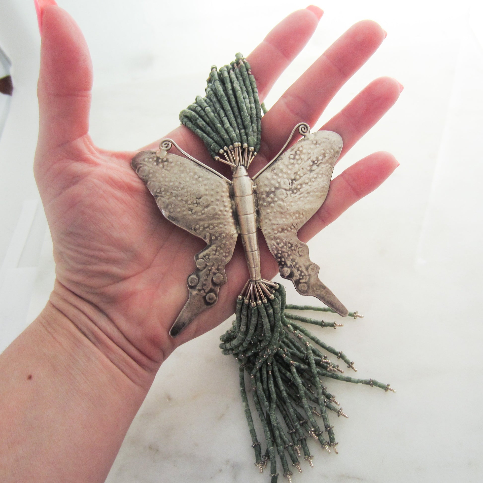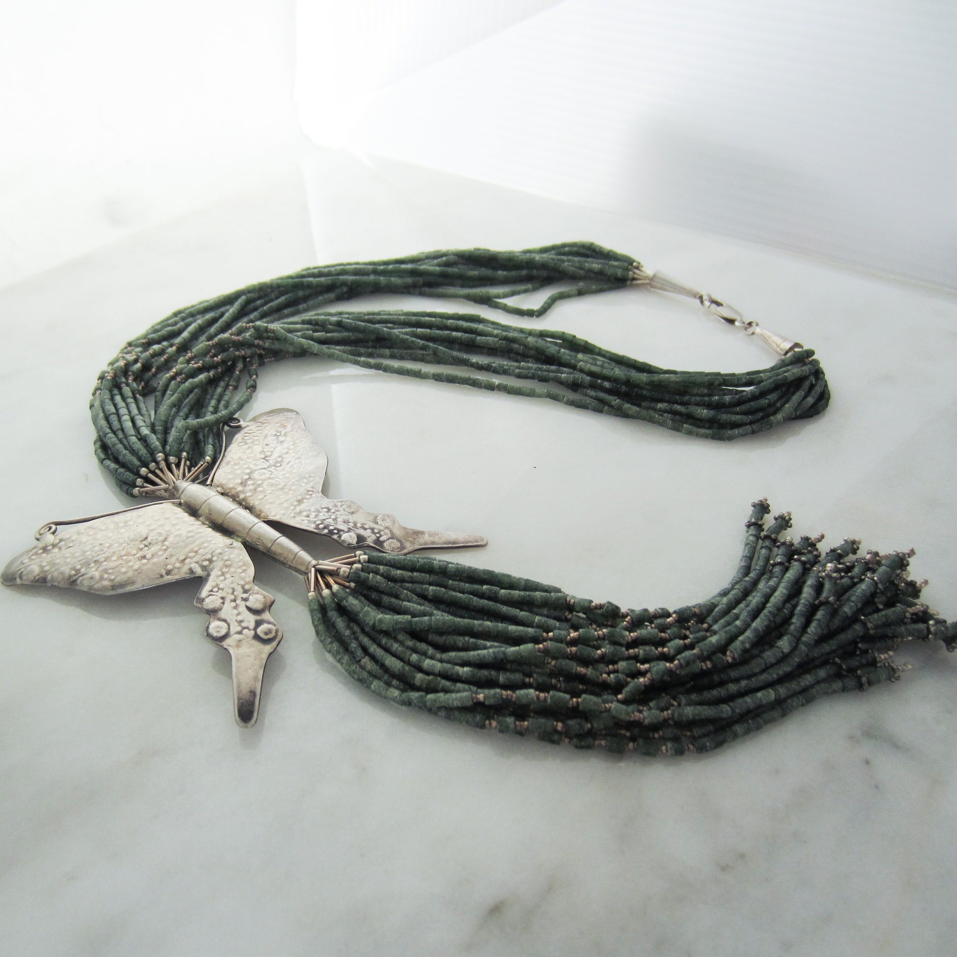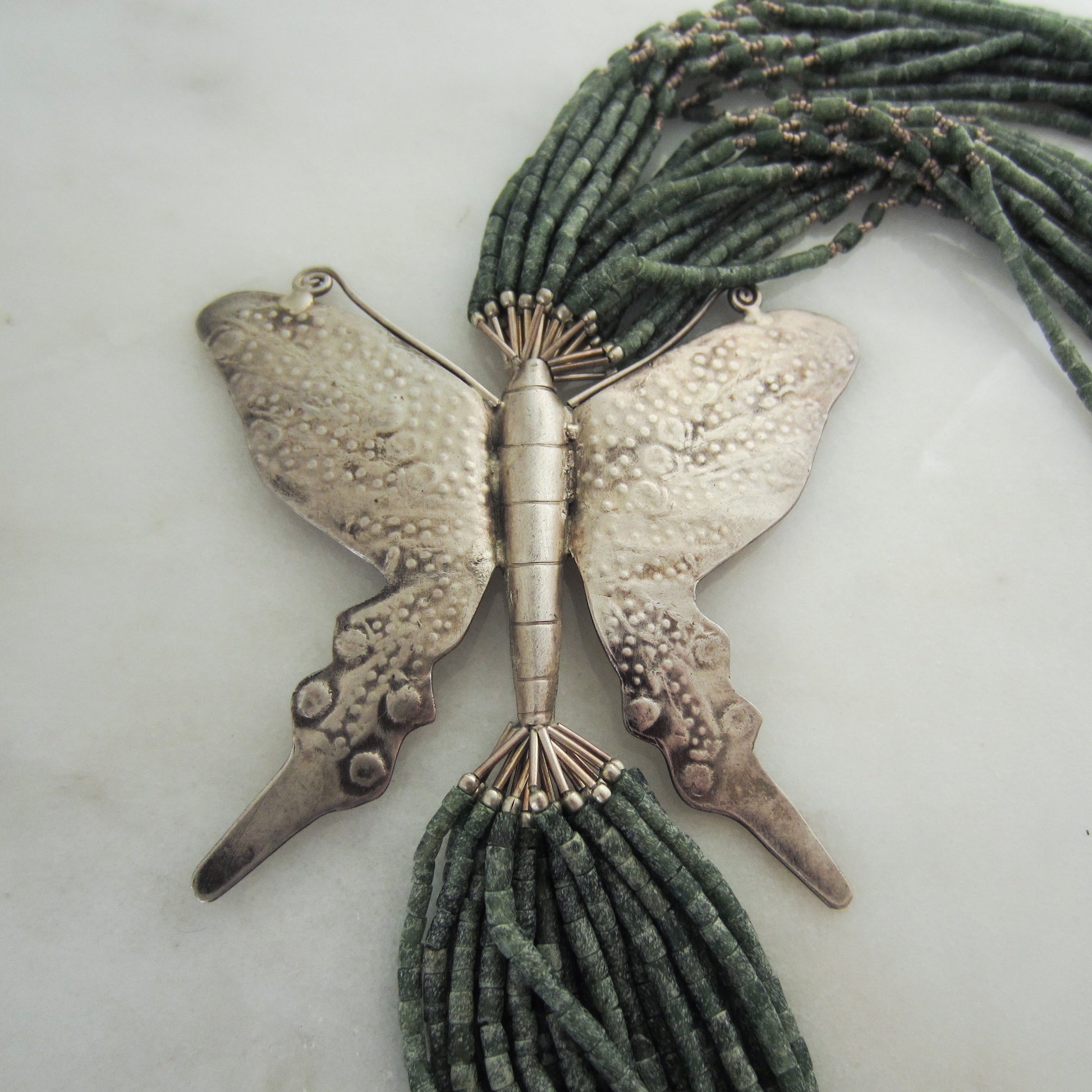 This Vintage Artisan Huge Butterfly Necklace is crafted in sterling silver and features multiple strands of dark green glass and silver beads, with a central handmade butterfly medallion for a truly unique look. Its bold size and style make it the perfect accessory for an evening out! Circa 1990s.