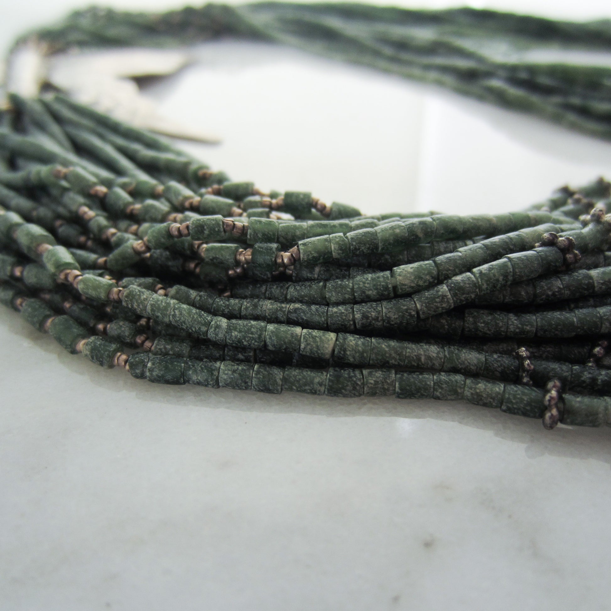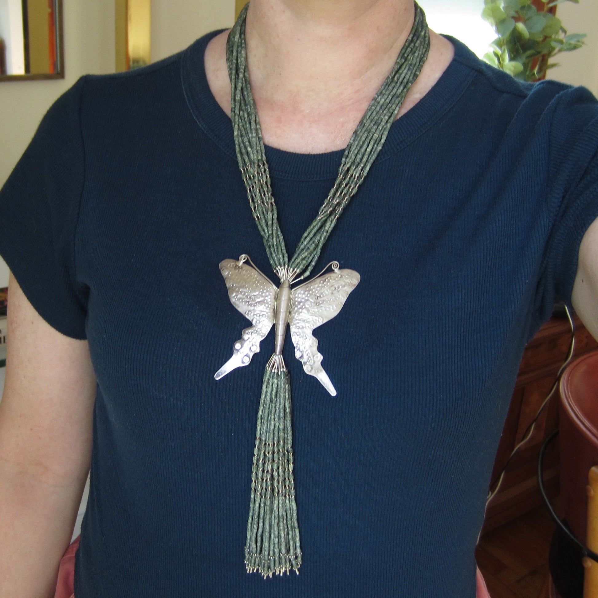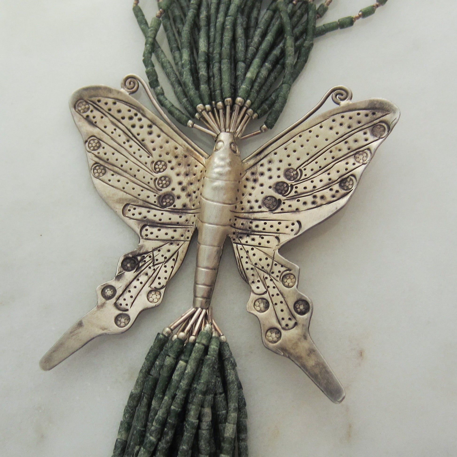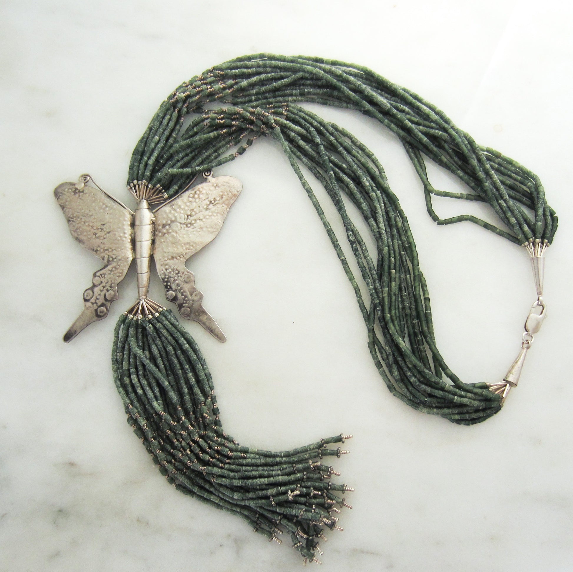 This Vintage Artisan Huge Butterfly Necklace is crafted in sterling silver and features multiple strands of dark green glass and silver beads, with a central handmade butterfly medallion for a truly unique look. Its bold size and style make it the perfect accessory for an evening out! Circa 1990s.