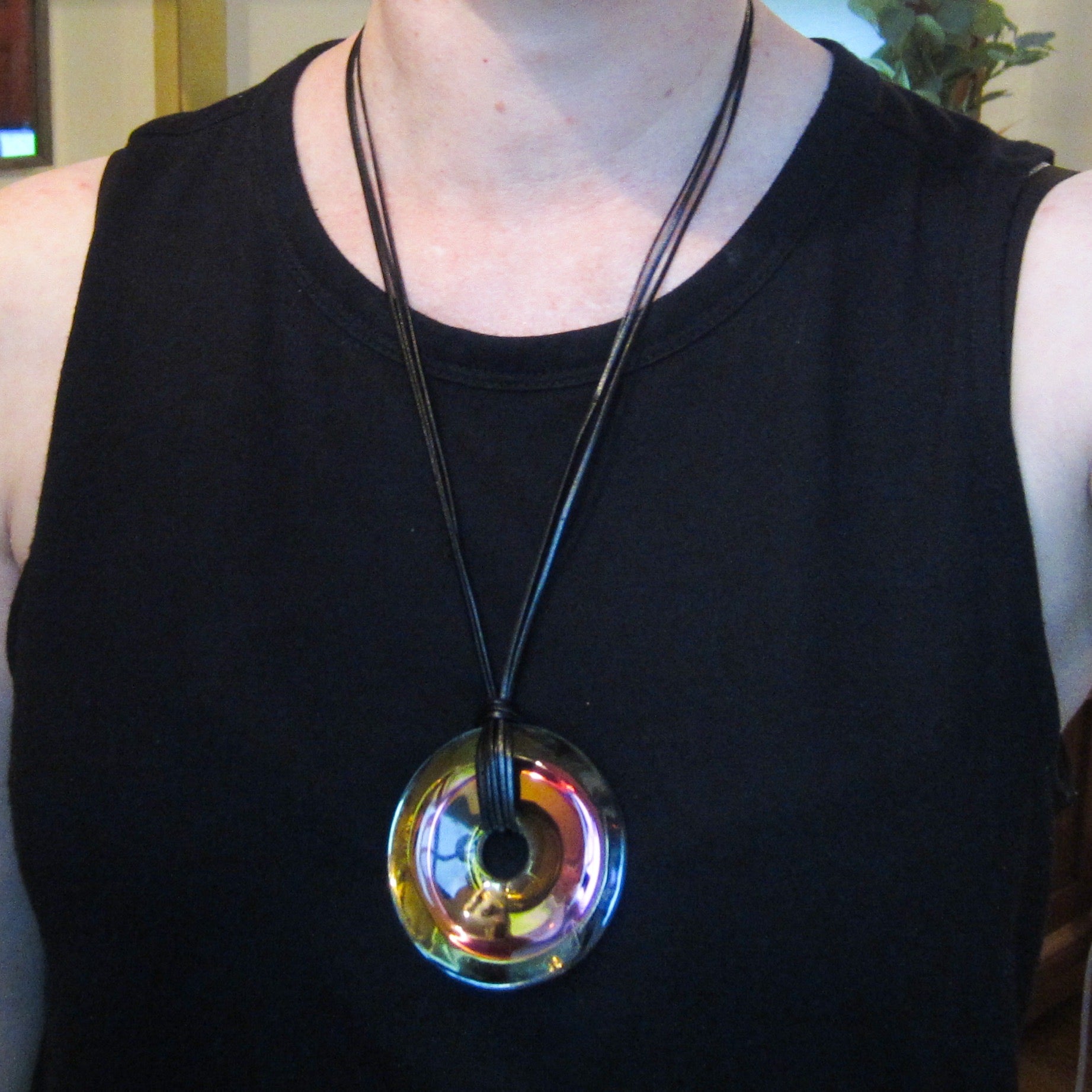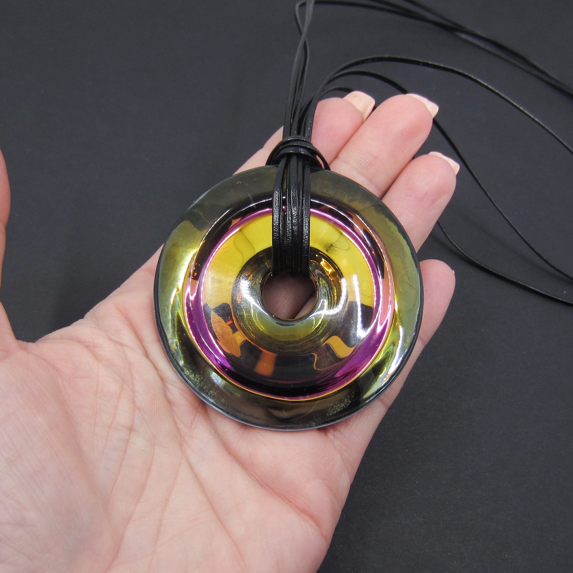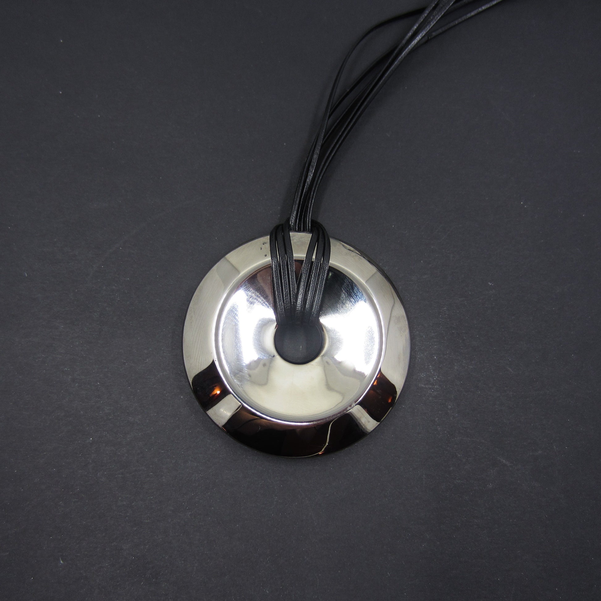 Disc measures 2 3/8" diameter. Necklace measures 22" length.