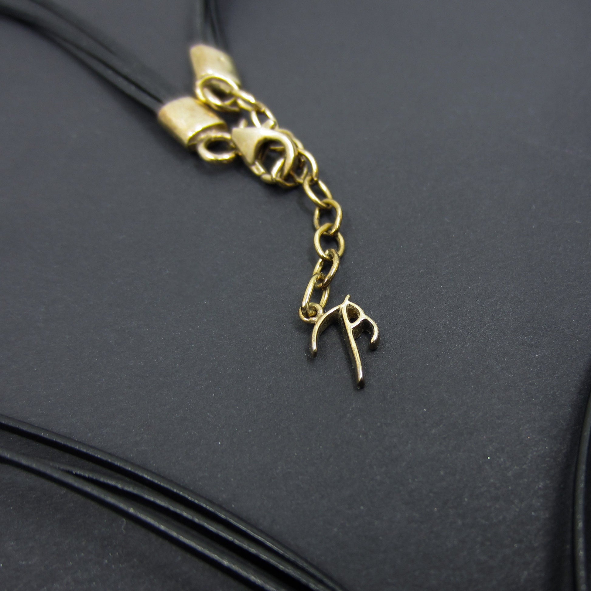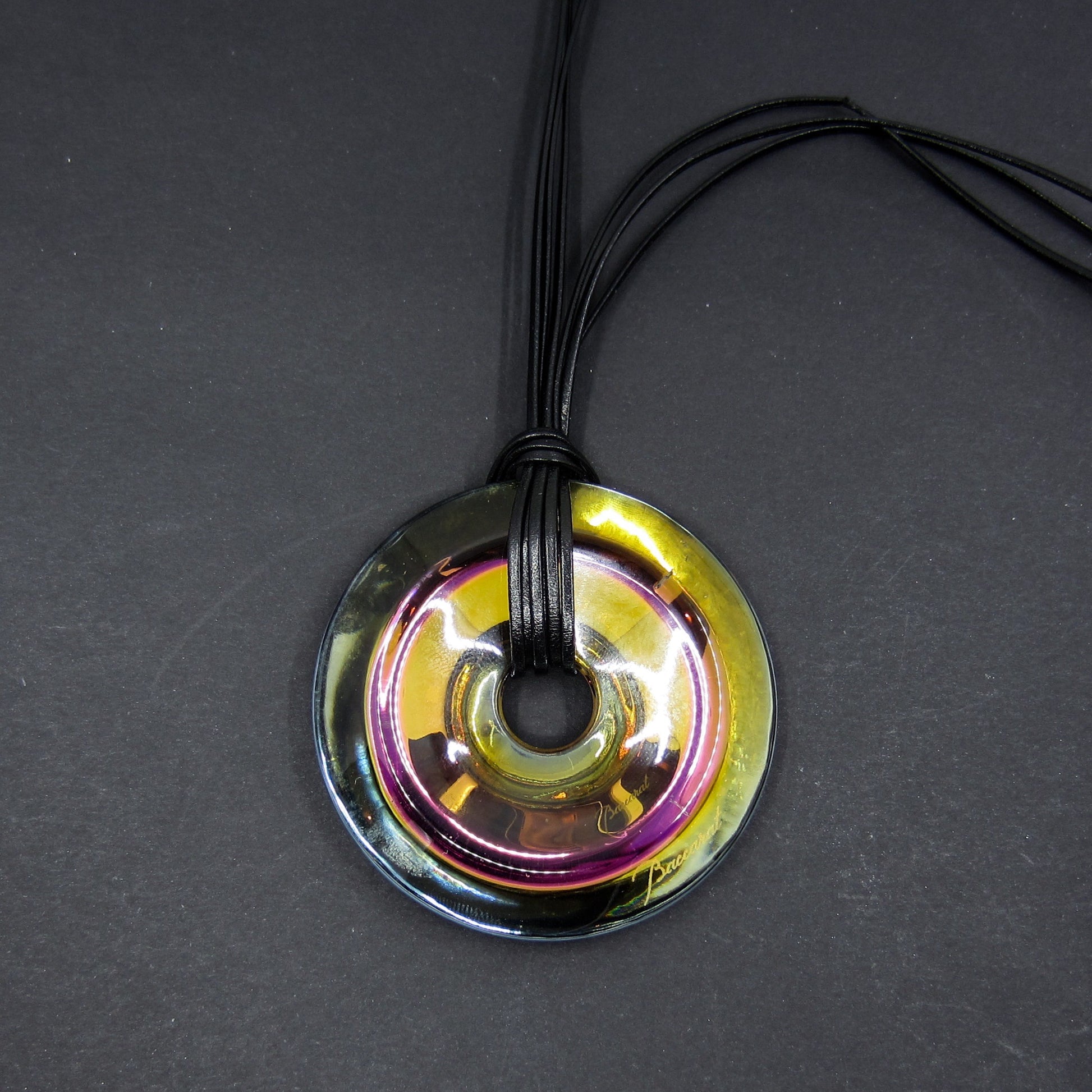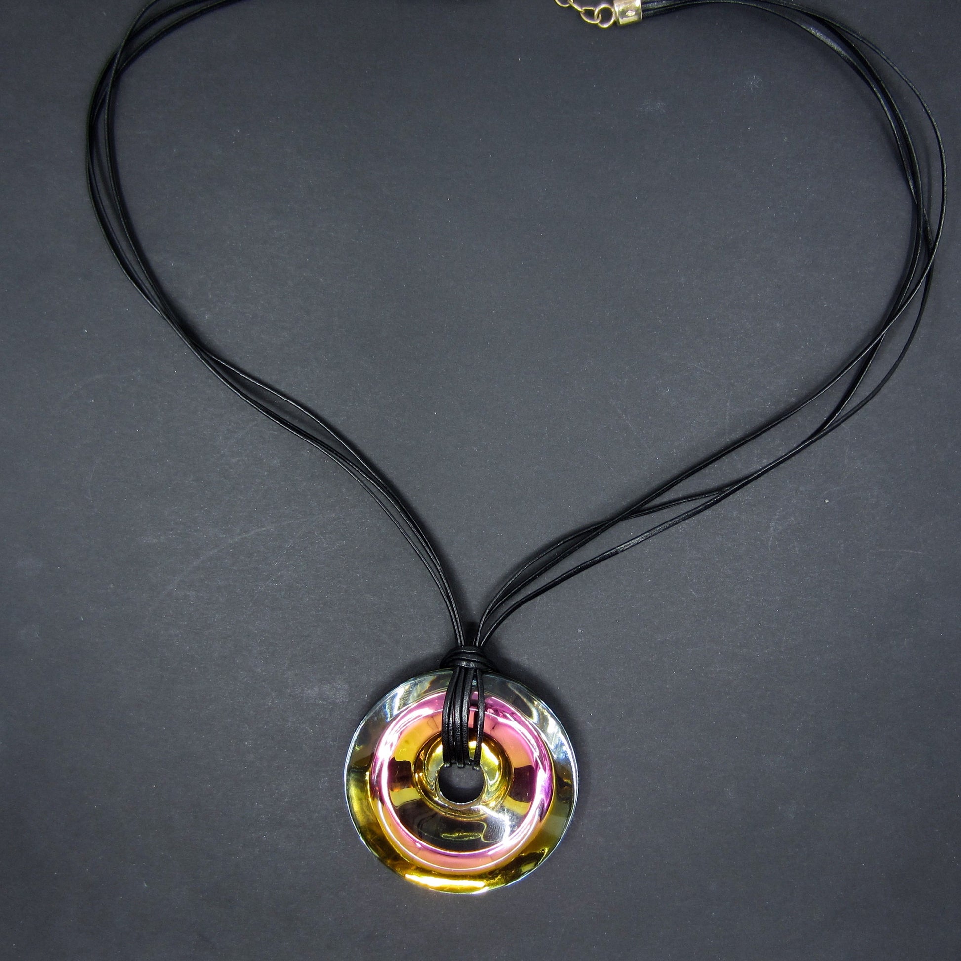 This ultra chic and rare necklace was made by Baccarat for their B Spirit collection. It features a large reflective-backed crystal disc suspended from multiple leather strands. This piece flashes yellows, pinks and blues and it is captivating! Sterling silver clasp and findings and fully signed.
