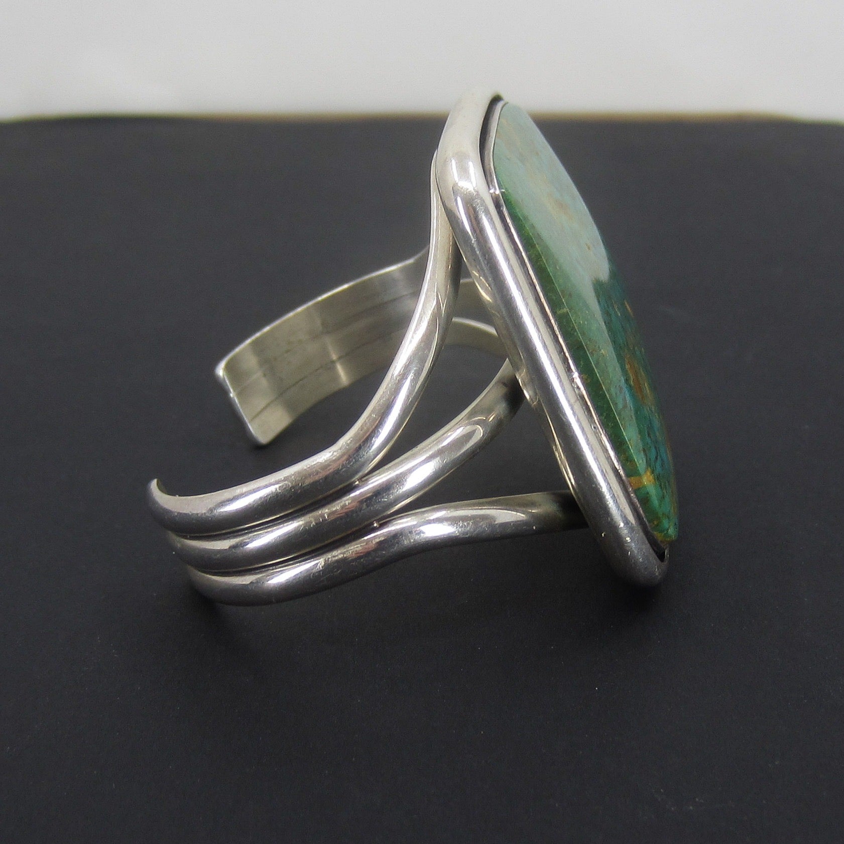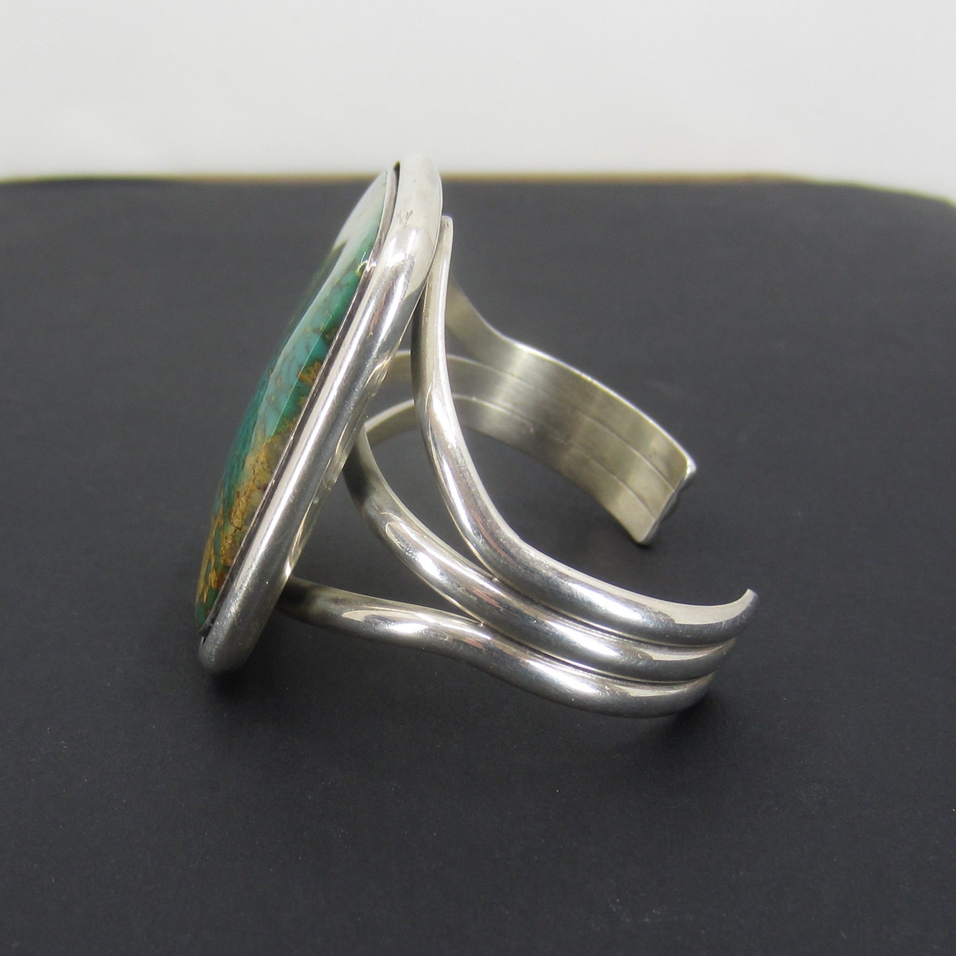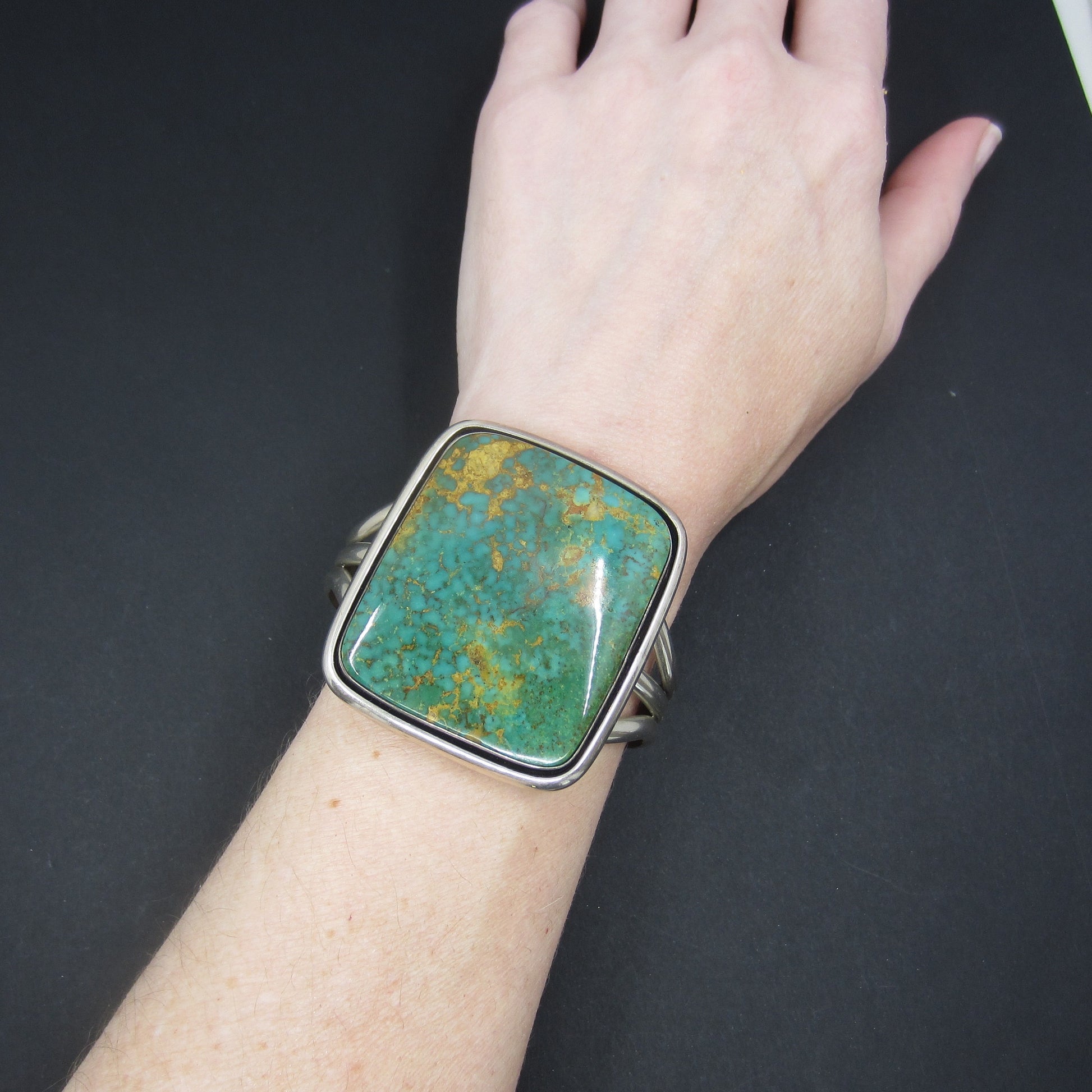 Look at this beauty, she is the most gorgeous blue green color and big, big, BIG!! Made circa 1970's, this Navajo cuff holds the most gorgeous piece of turquoise with the matrix (host rock) set in sterling silver. As you can see in the photo, it looks INCREDIBLE on! This cuff fits best on a small to medium women's wrist and can be adjusted.