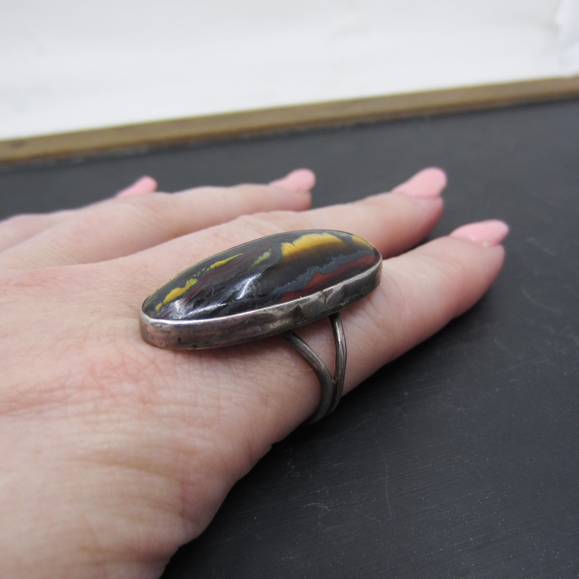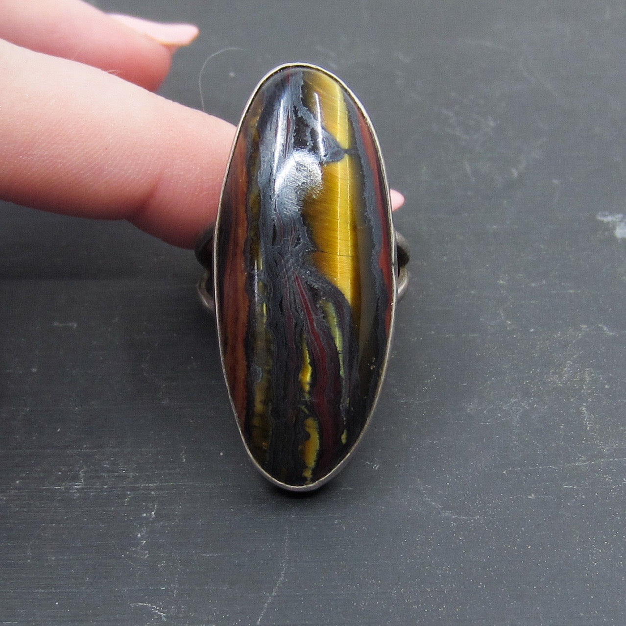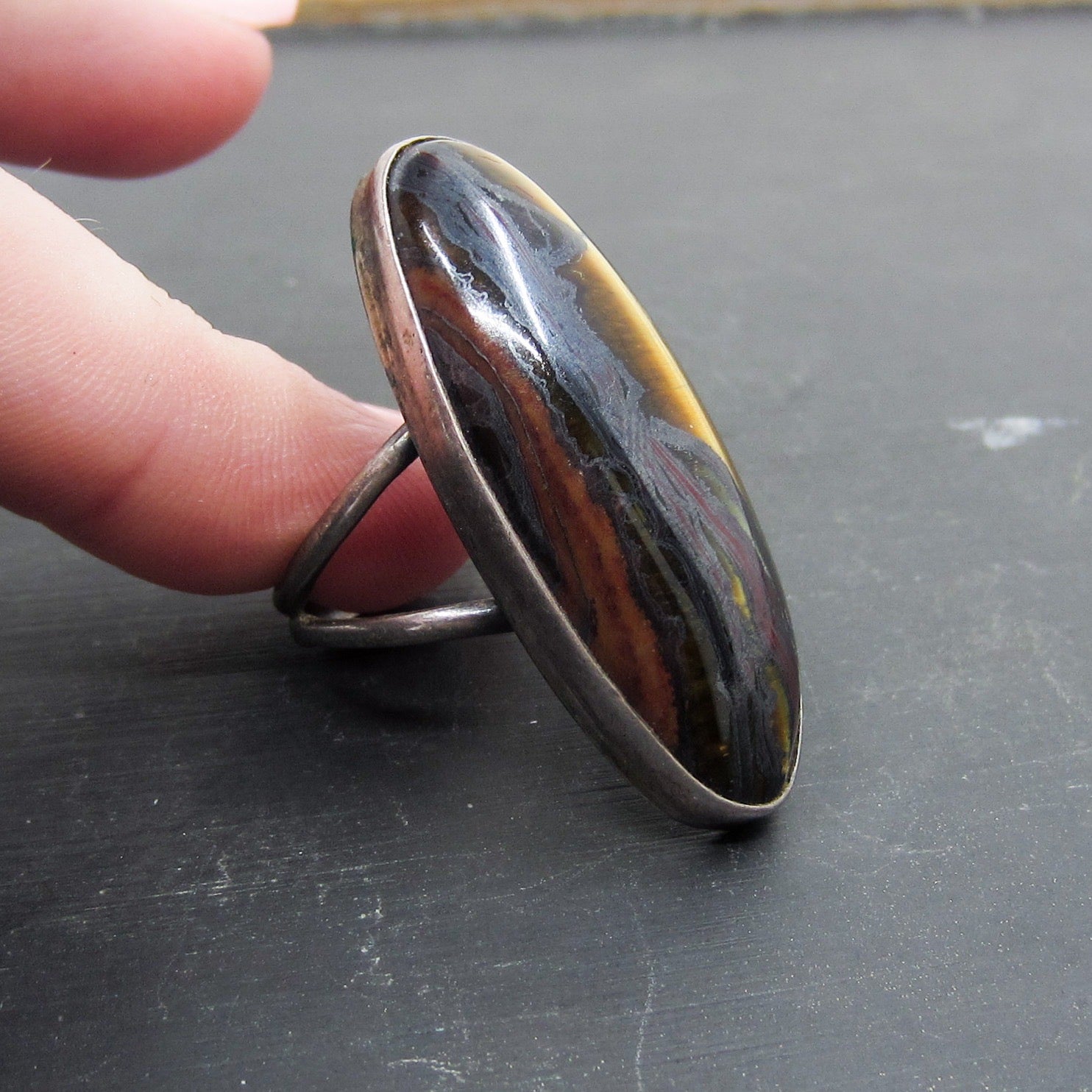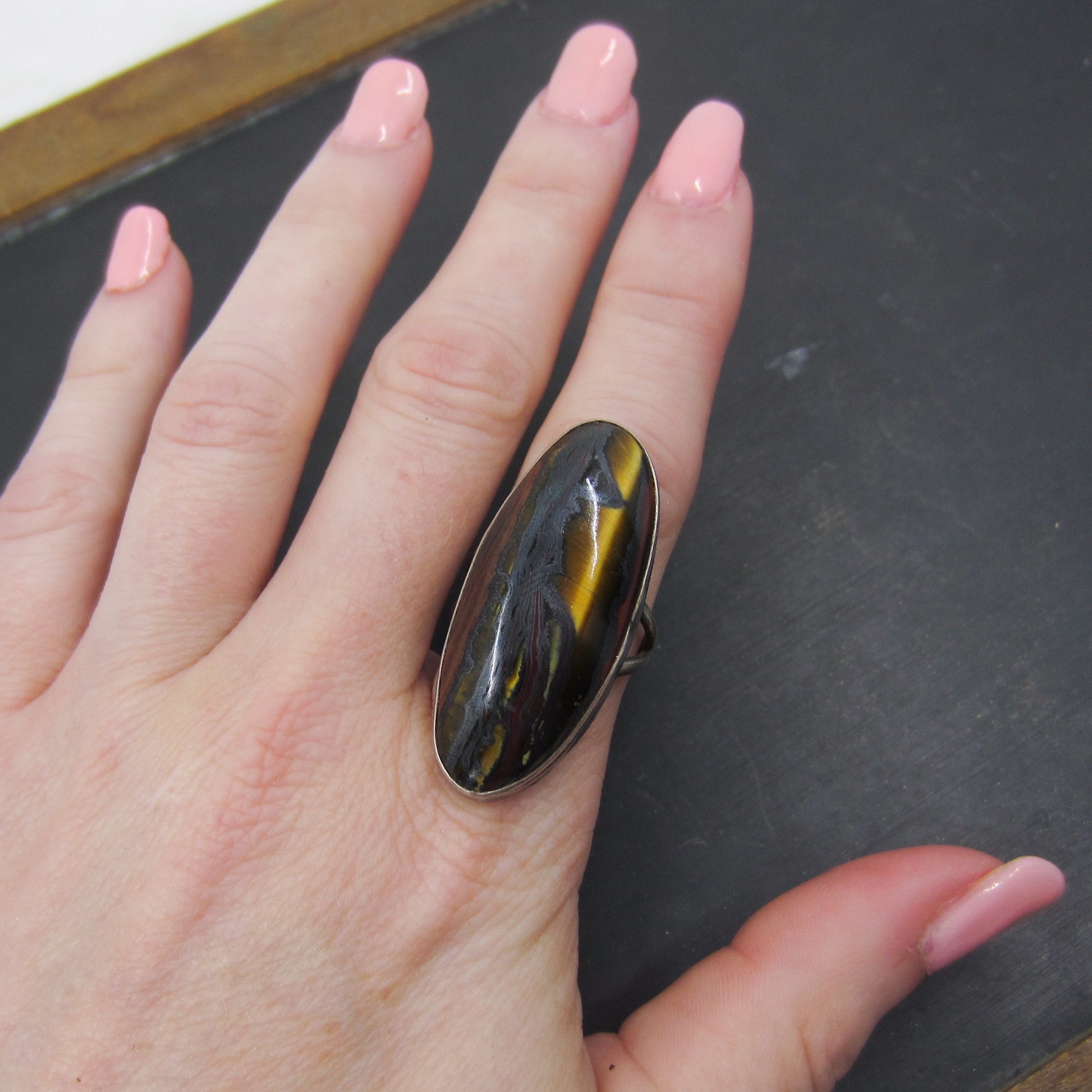 This striking vintage ring features a large oblong tiger's eye stone bezel set in sterling silver circa 1960. It can be worn on any finger but it looks extra amazing on the pointer finger!