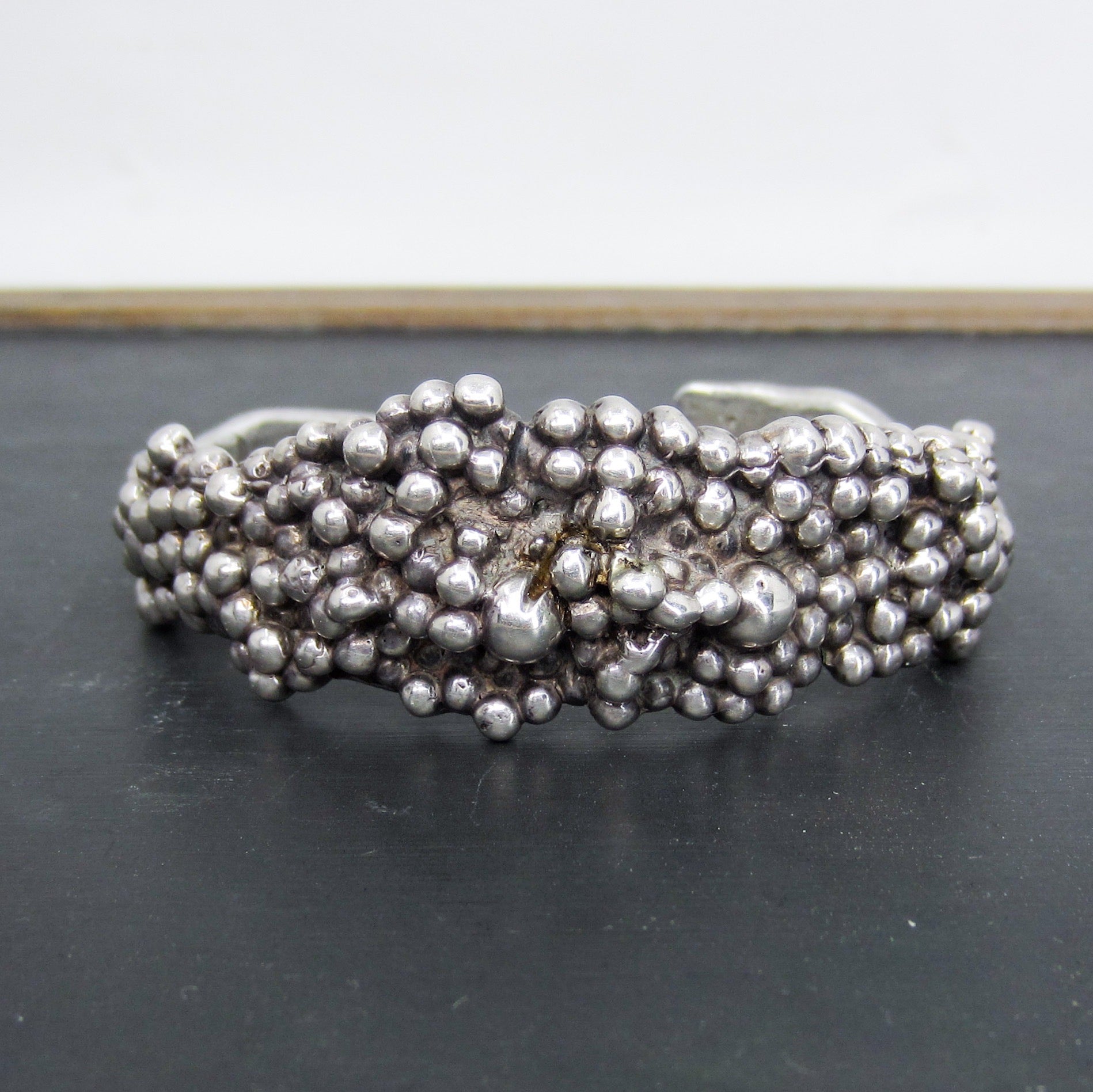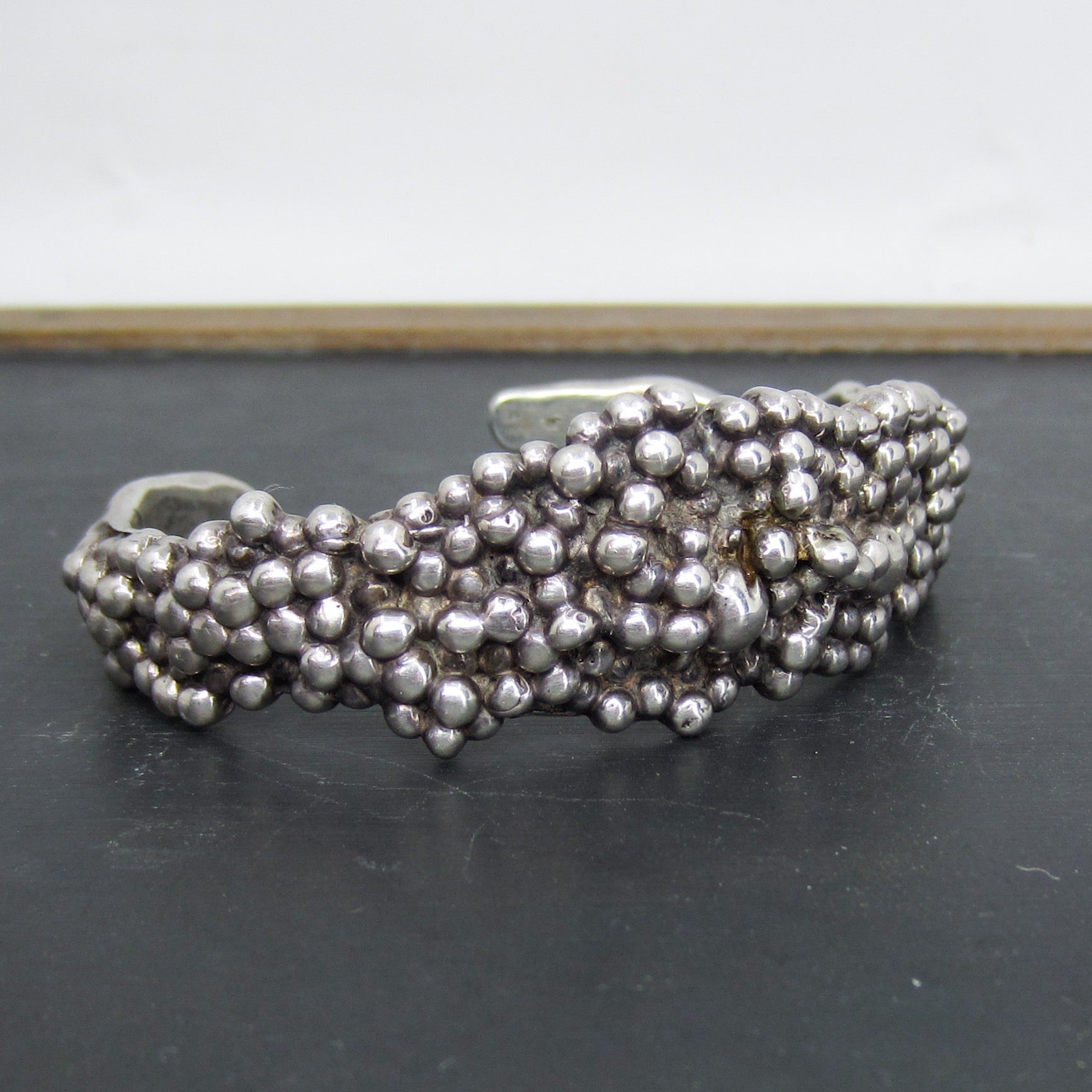 This vintage Heavy Brutalist Granulated Cuff is made of sterling silver (c.1970). It is exceptionally well crafted with a hefty weight and granulation detail, making it a fantastic and unusual piece. The cuff is designed to fit a medium wrist (man or woman).