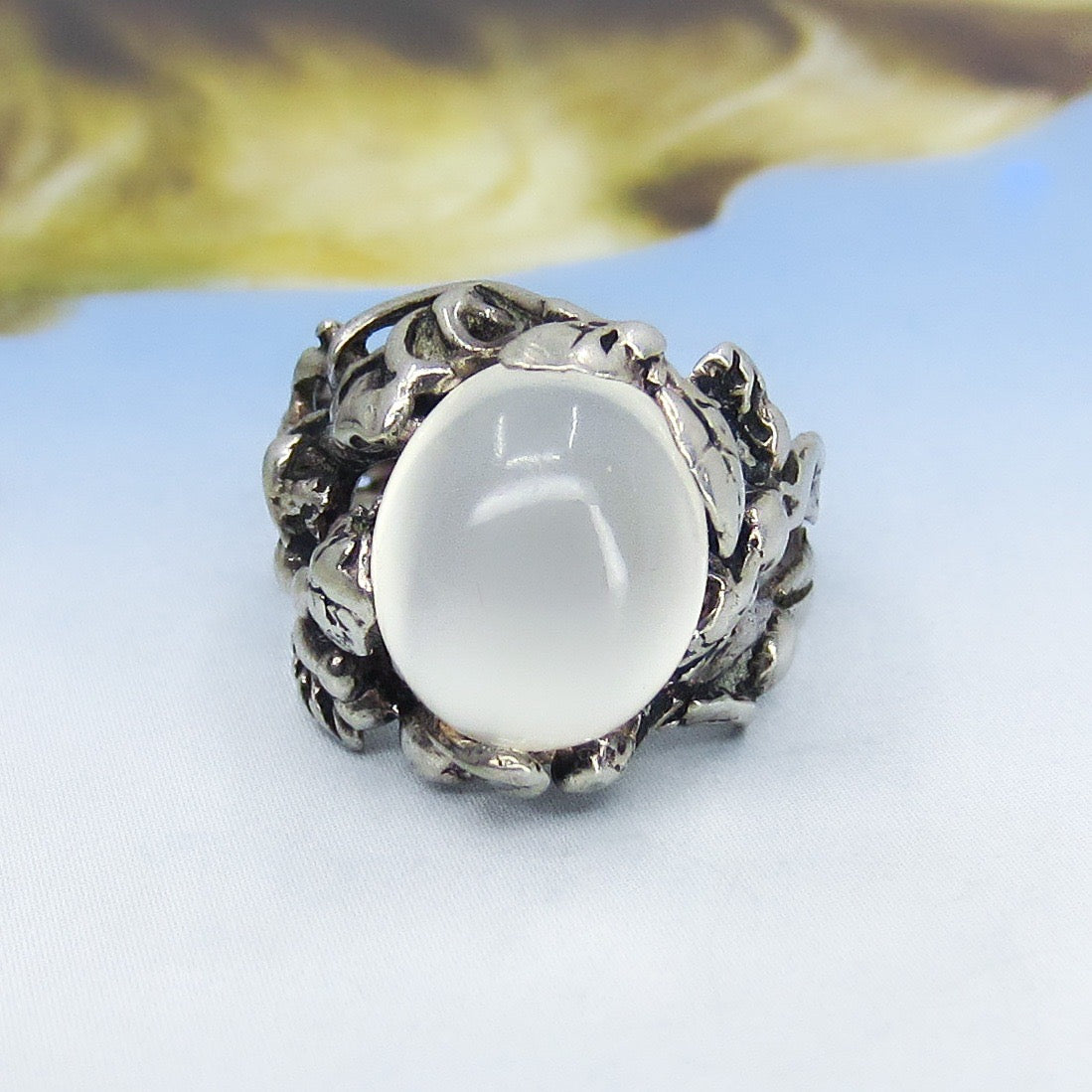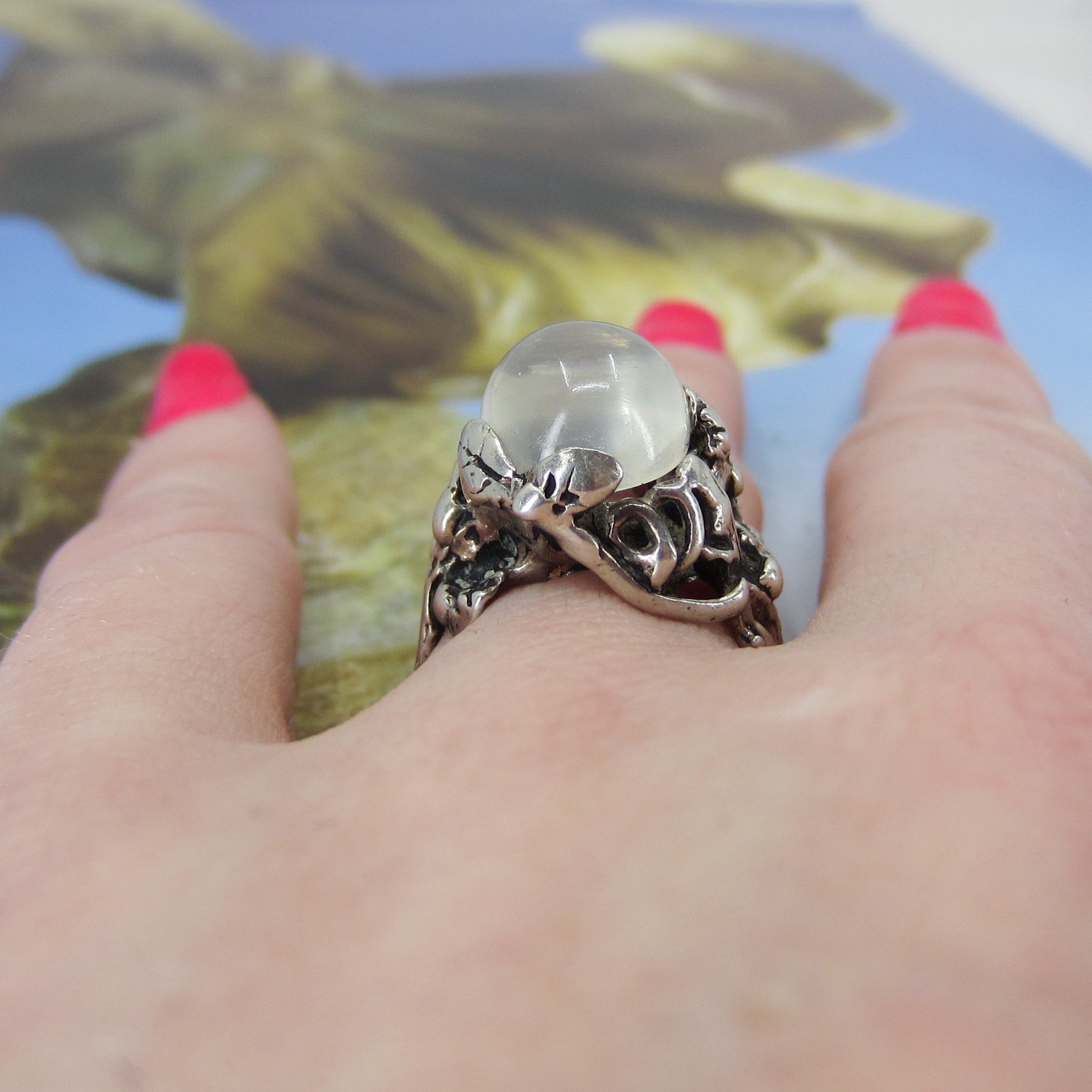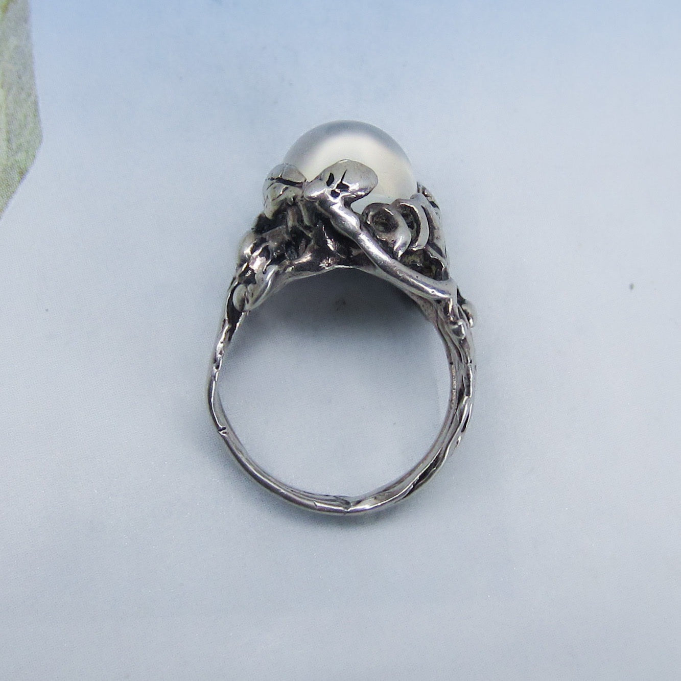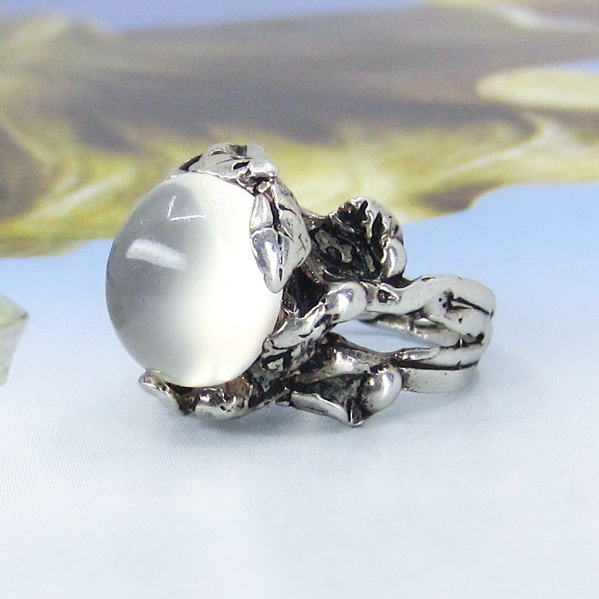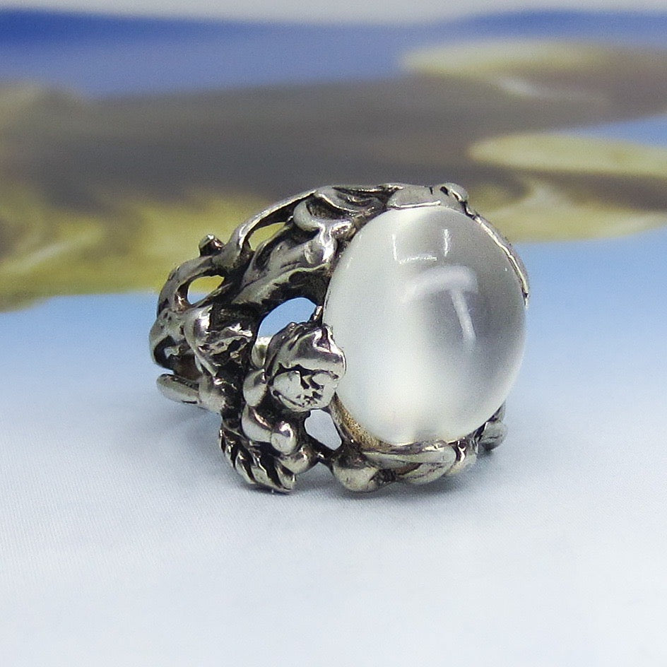 A 1970's Brutalist ring with a shimmering grey moonstone cabochon set in a sterling silver organic leaf motif setting.