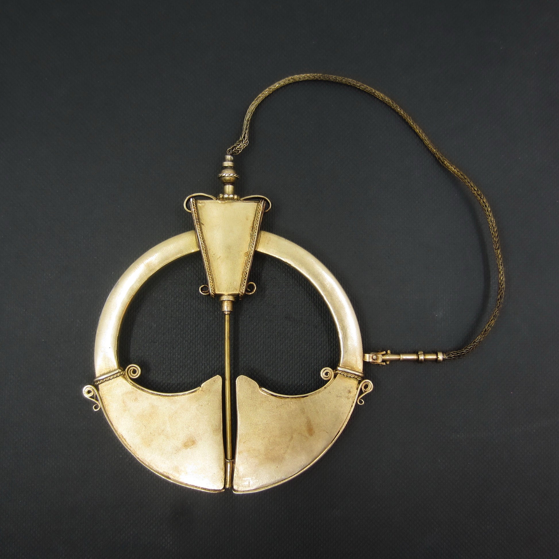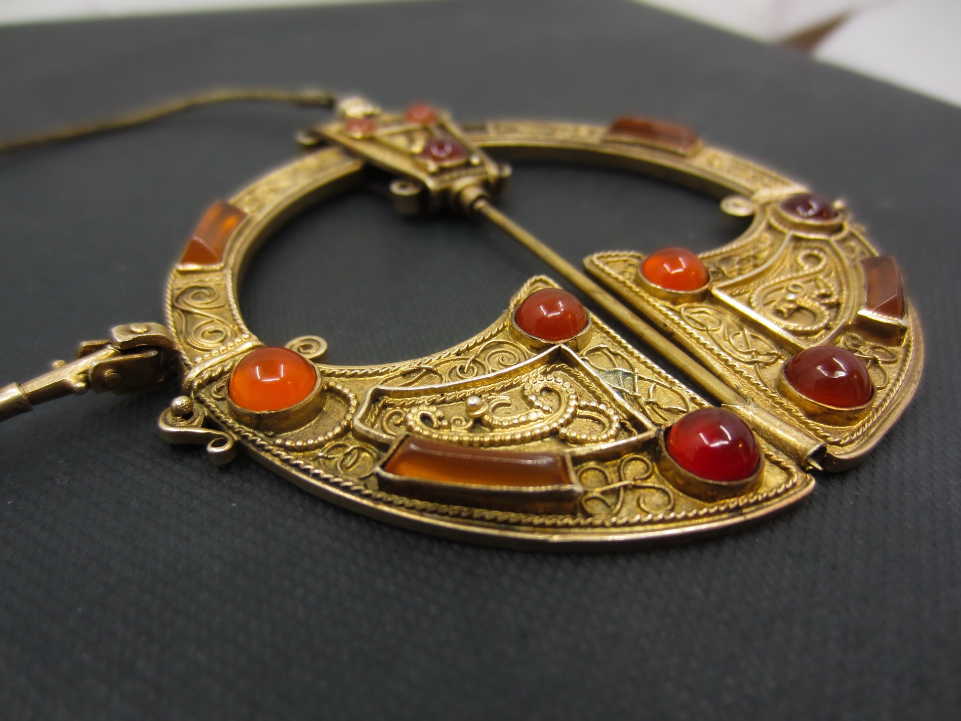This is a very cool piece, made in a very old style of brooch called a penannular which is typically seen in Celtic medieval brooches but have been used as far back as the Roman era. The origin of this particular piece is unknown, it may be a museum reproduction of some kind and is very similar in style to the Hunterston Brooch but is not an exact replica. It is very finely made of heavy gilt silver and carnelian cabochons, with wirework throughout. It is also very large as you can see by the pic in my hand! This brooch would work best with a loose knit sweater or scarf. Whatever you wear it with it will get noticed and you will get questions, as it has been a very popular piece in the store and everyone is always curious!
