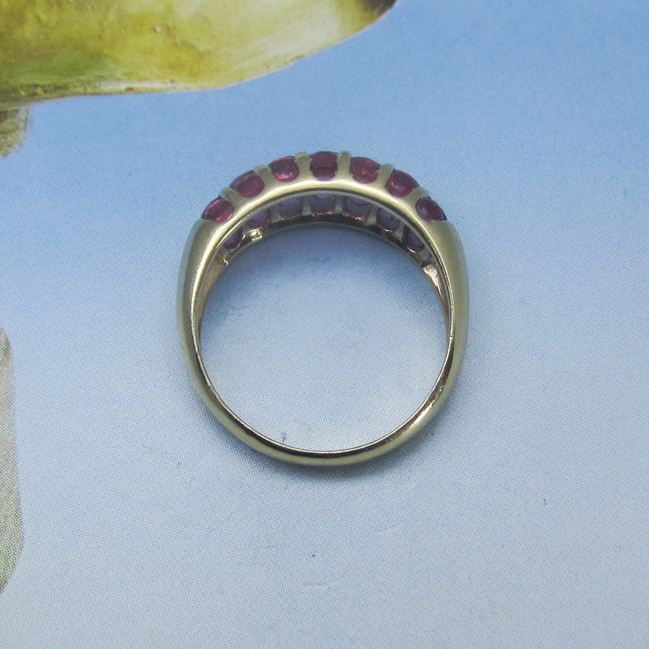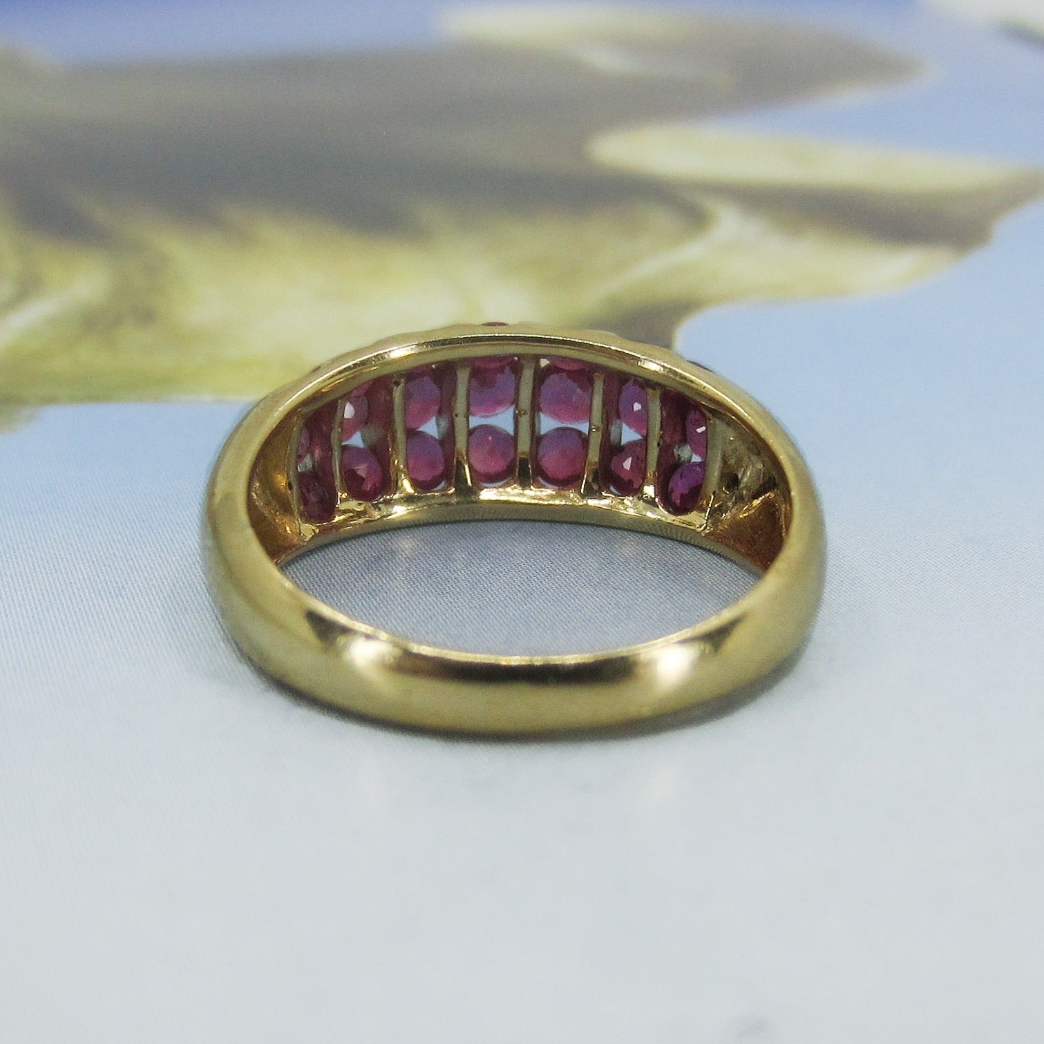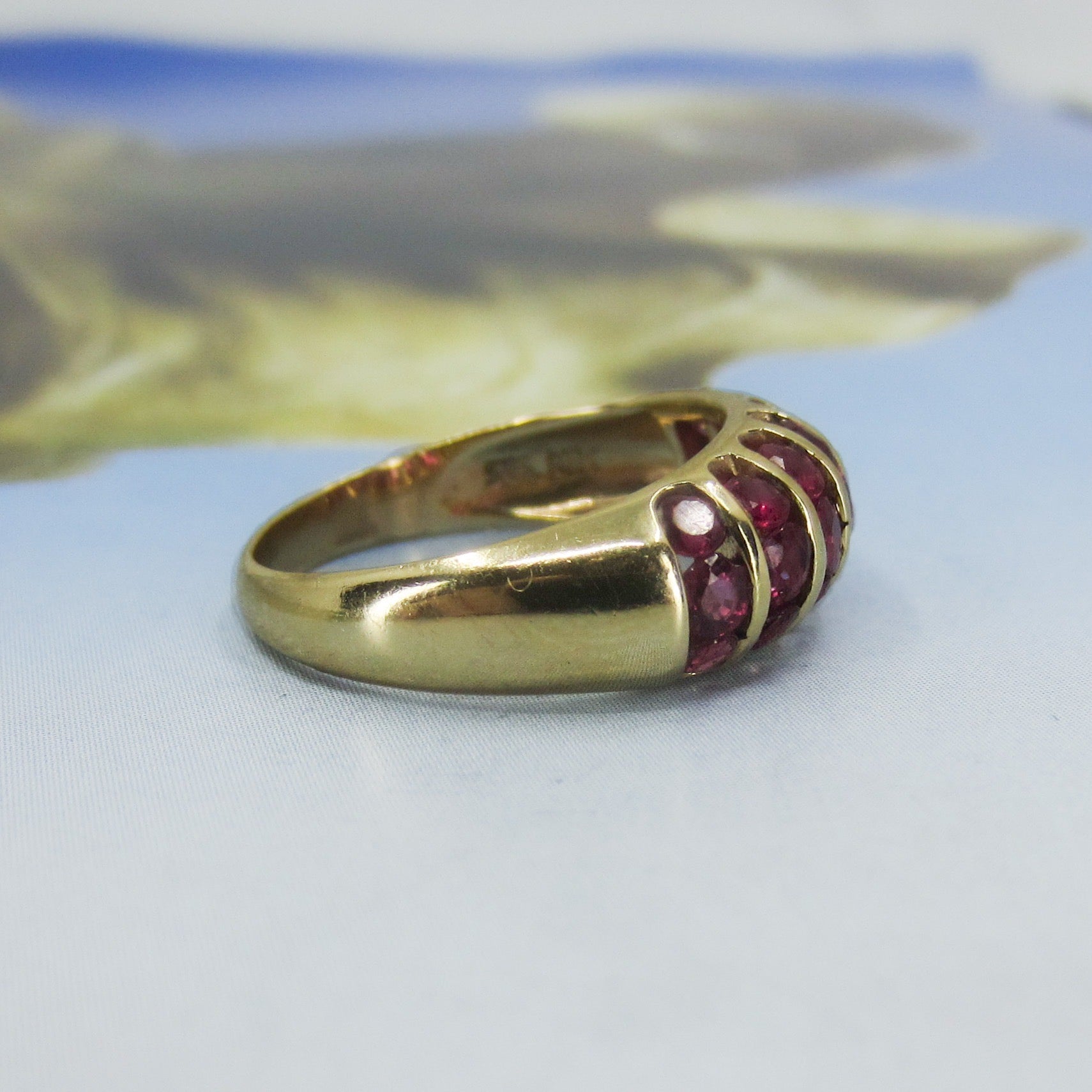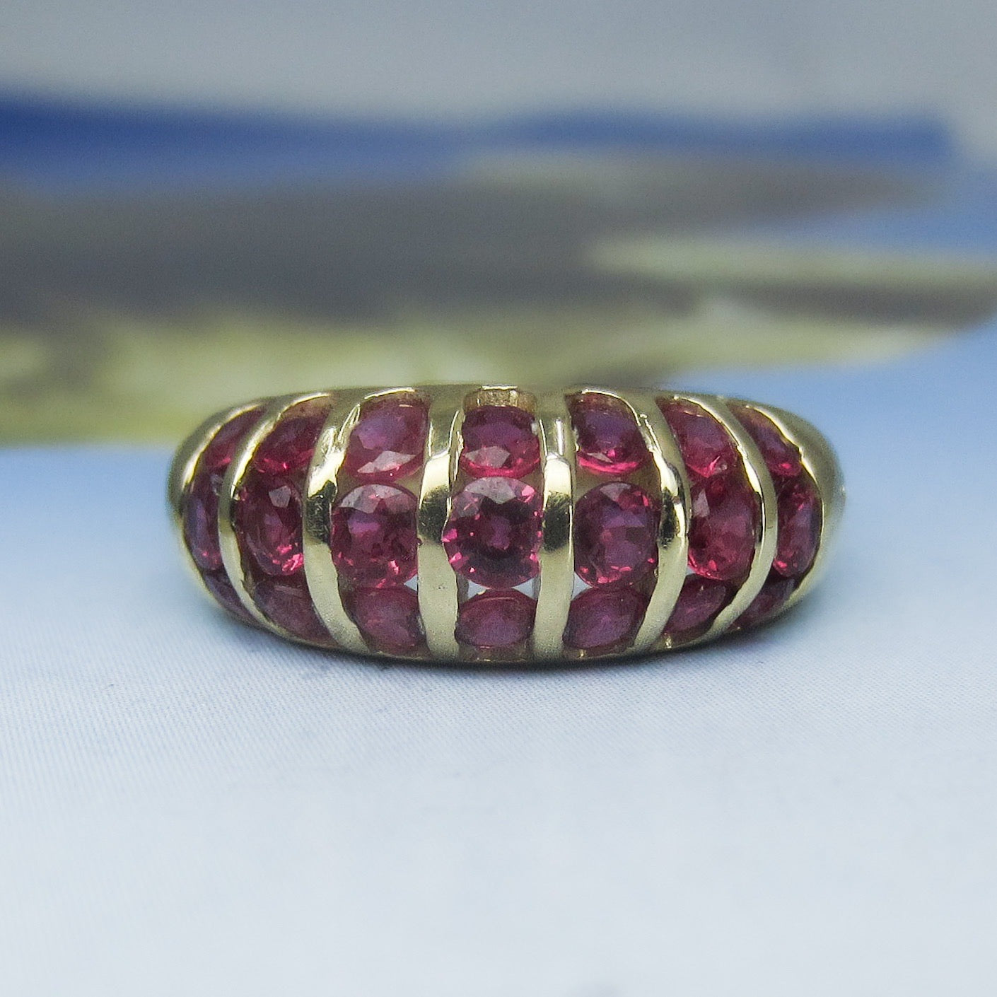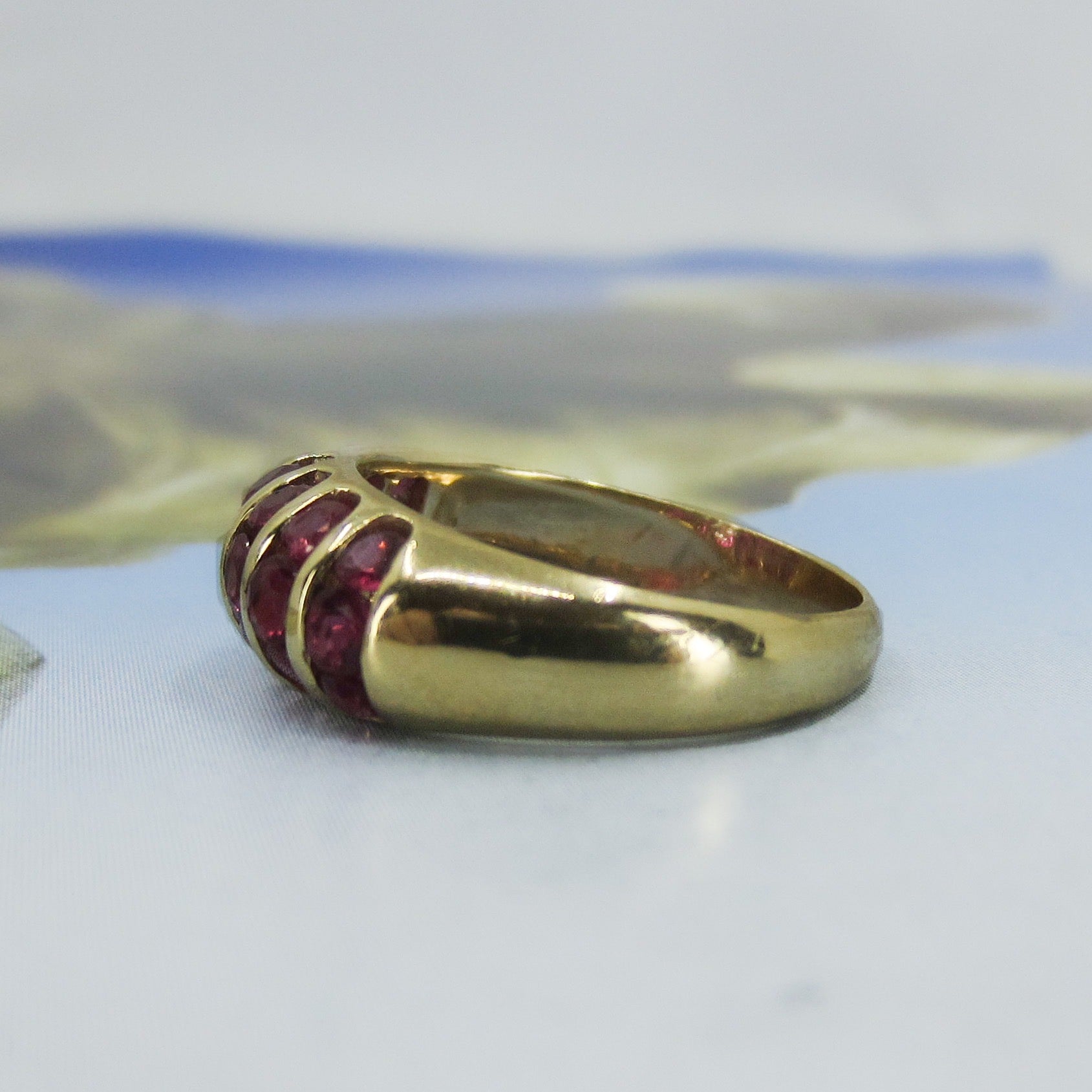 This is a vibrant Post-Modern ring, made circa the 1980's and set with bright, sparkling round cut rubies of graduating size channel set in seven rows. It is a very nicely made piece with well-chosen stones, the color of these rubies is more of a reddish pink and their clarity is high so you gets lots of light return and color! This ring works great on its own and also stacks well with other rings so there are many possible ways to wear it.
