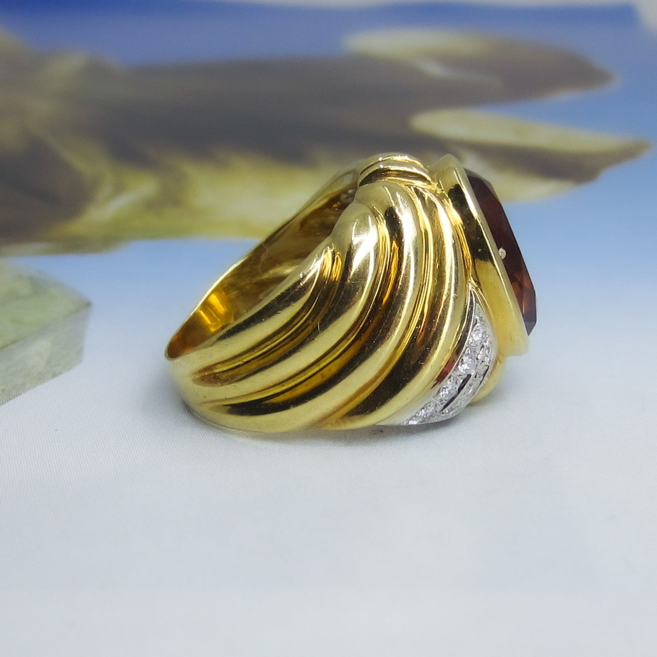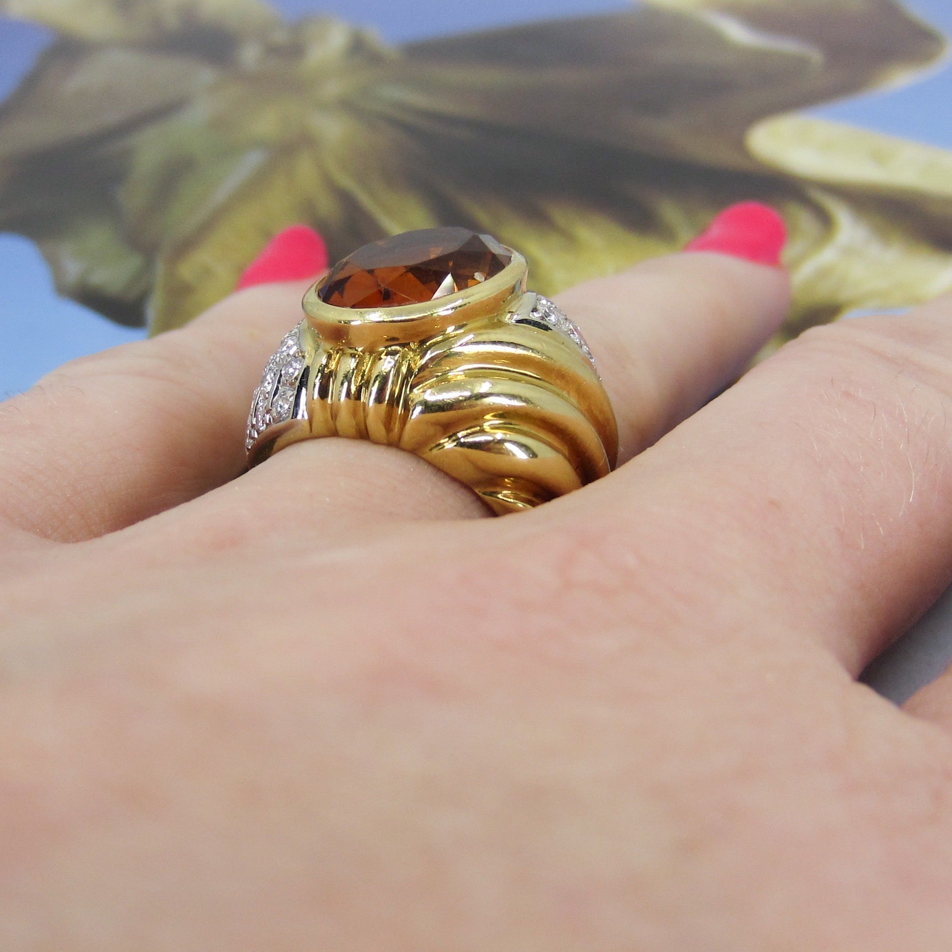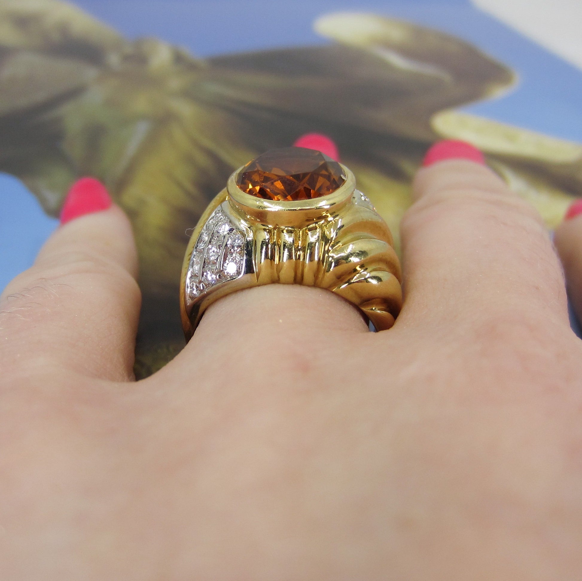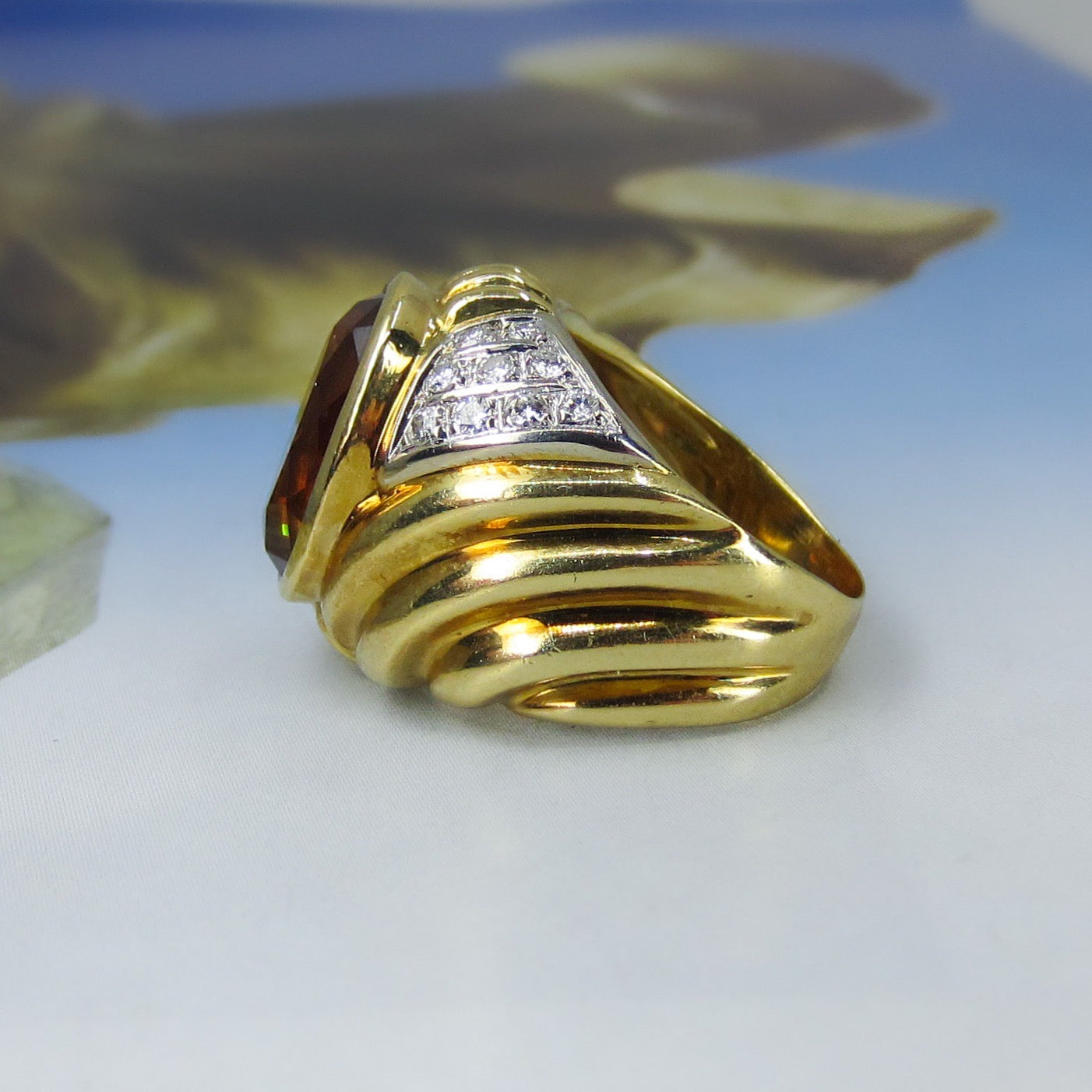This eye-catching vintage Citrine and Diamond Ring is set in 18k gold and is sure to make a statement. The bright citrine stone is complemented by the contrasting shimmer and sparkle of the diamonds. The bold design and exquisite craftsmanship makes for an elegant and memorable piece! Circa 1990.