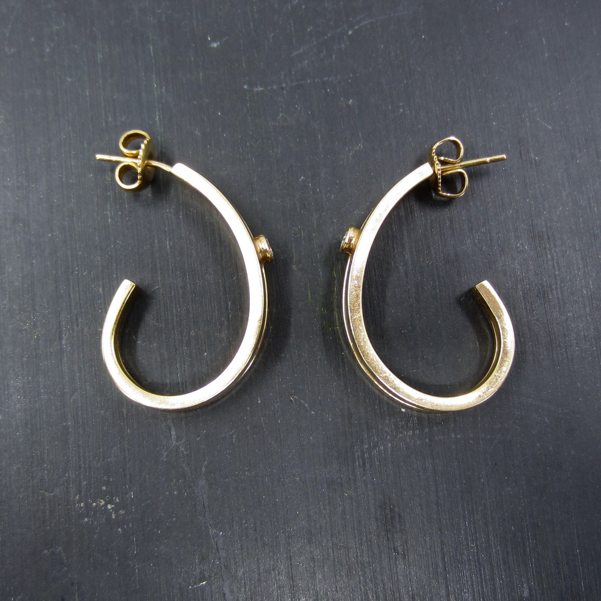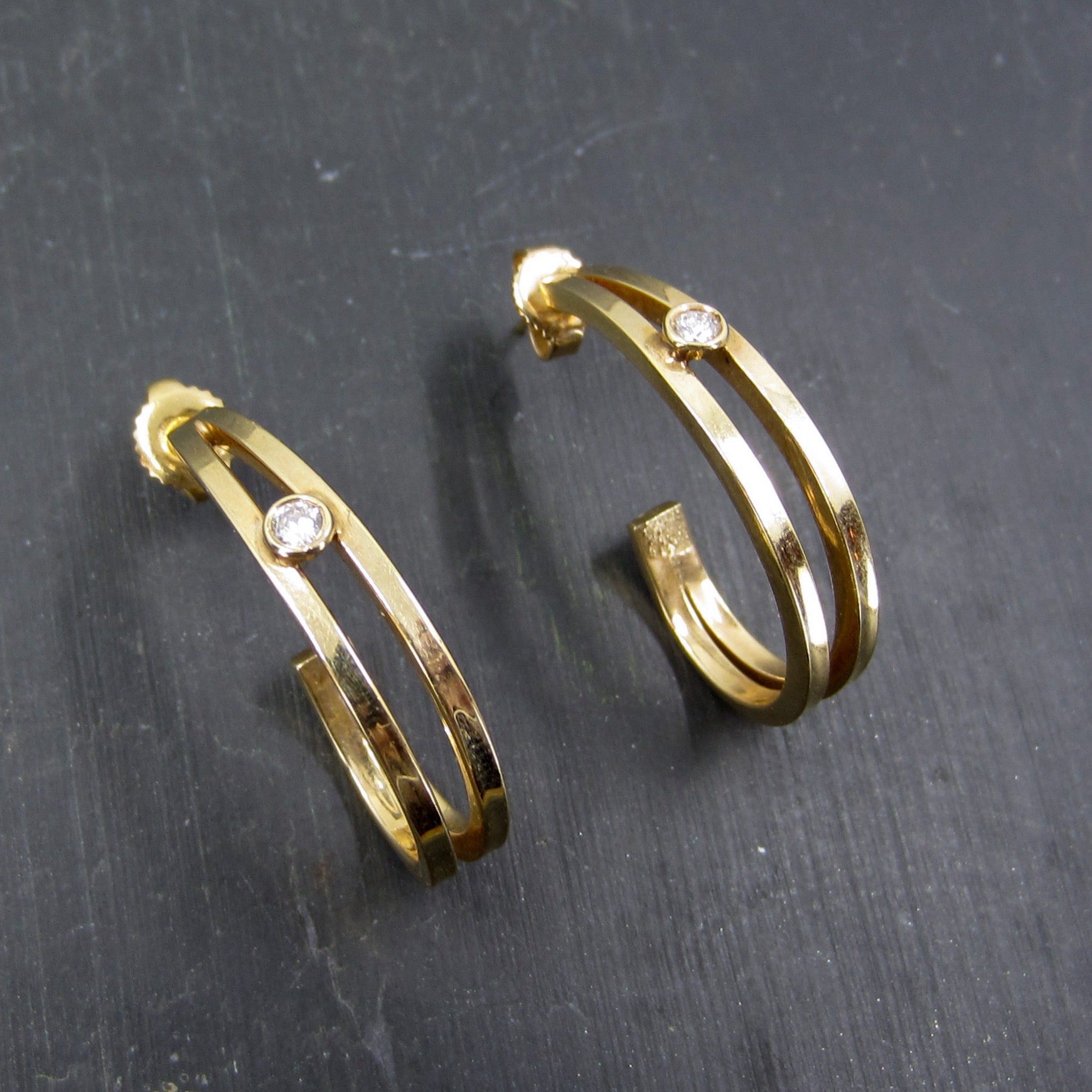 These earrings are so chic, clean in design and wearable with anything! Made circa 1990's, these earrings feature a split hoop with a bezel set natural diamond in 14k yellow gold.