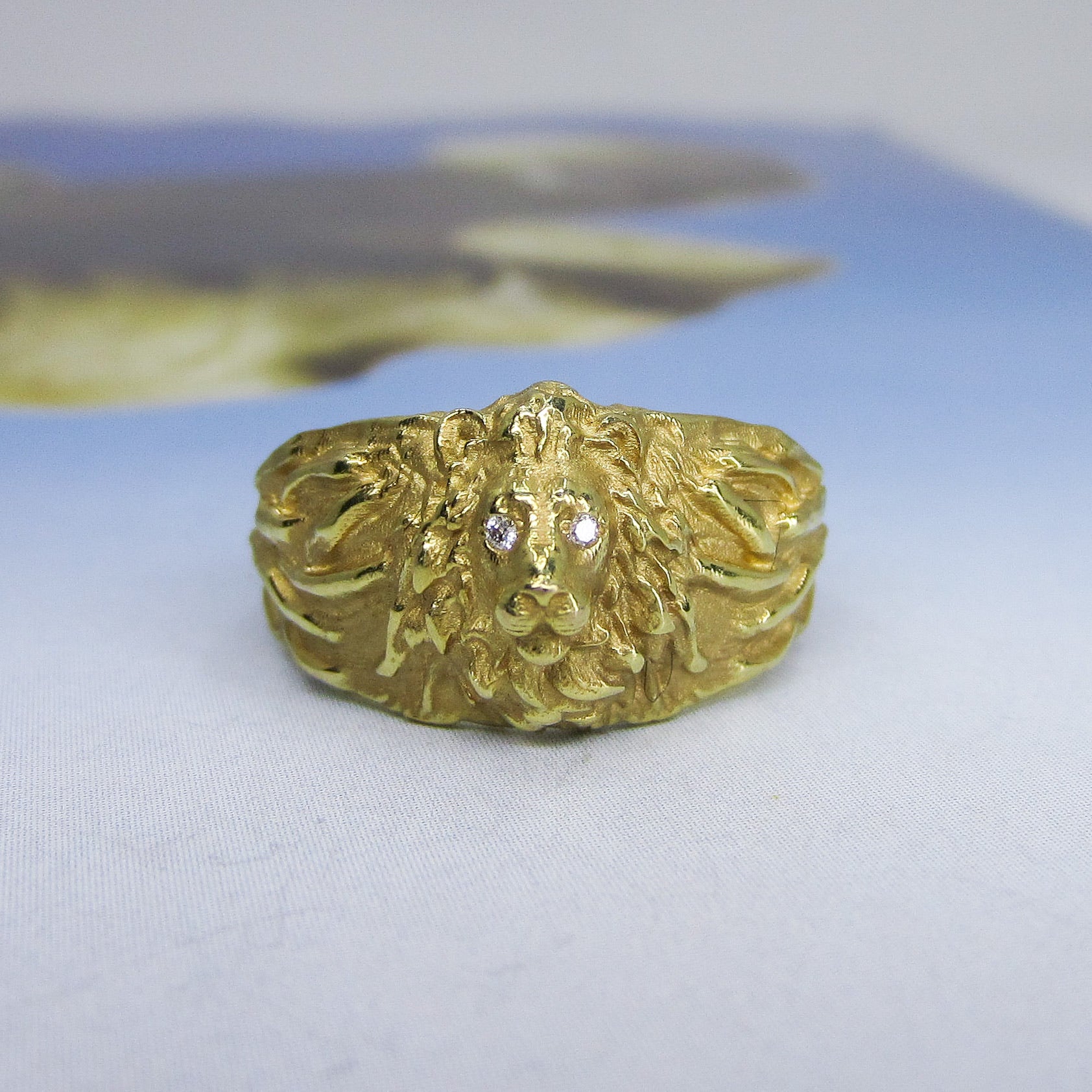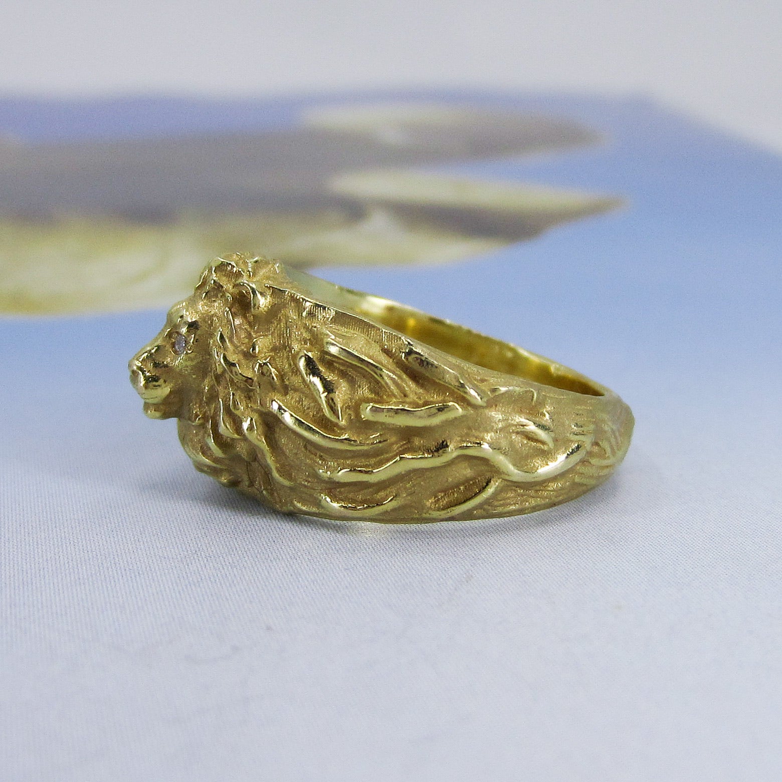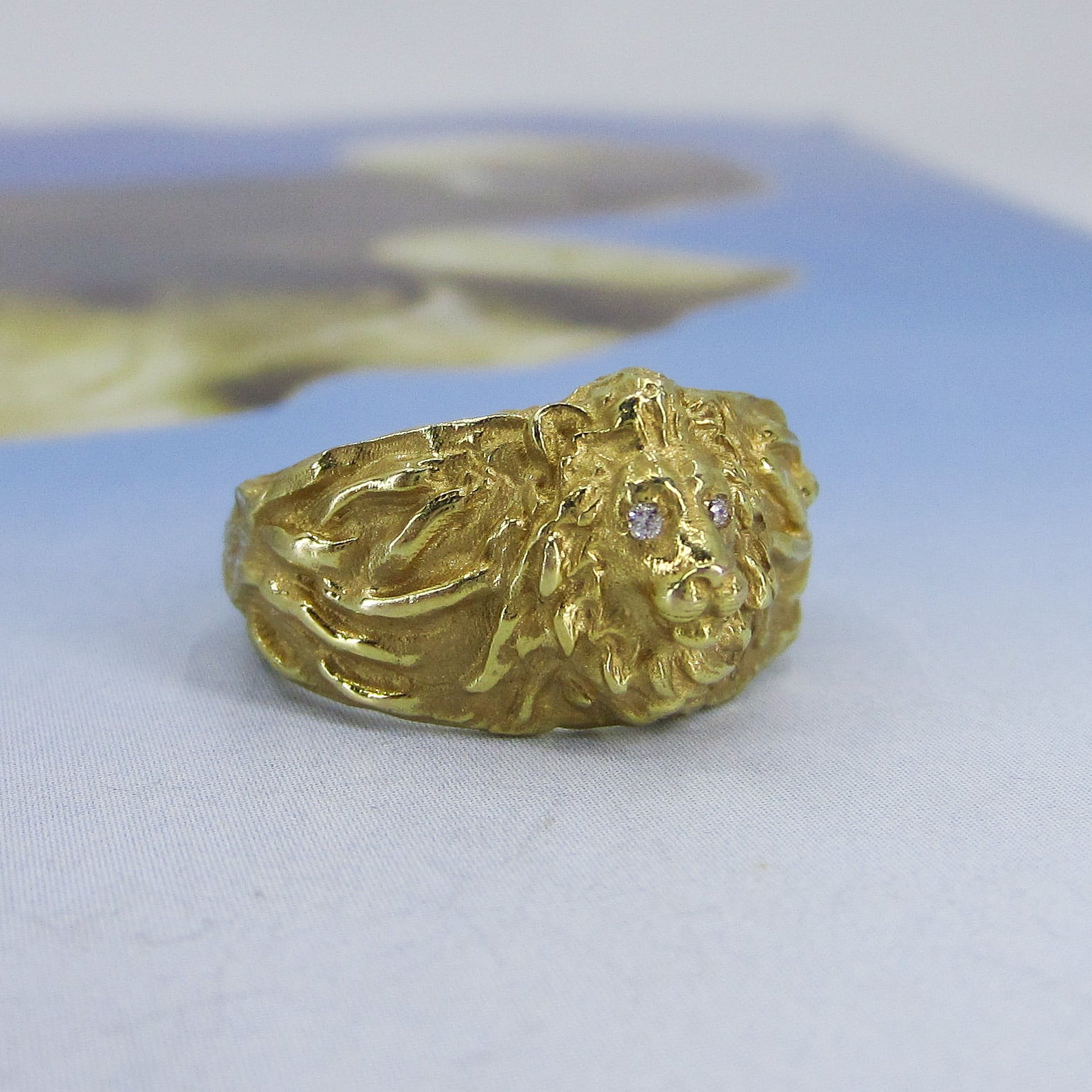 There's so much to say about this great vintage lion ring! The first thing you notice is that there is a LOT of detail packed onto this ring and it is unusual in its design, with the lion's face quite small and leaving room for his mane. While the face may be small, it is very beautifully detailed and kind of cute! This is a friendly lion and that's okay, they don't all have to be fierce! You can see in the photos this ring has a very sculptural, three dimensional quality. I haven't seen one exactly like this before so I'm putting it at Mid-Century based on the diamond cuts and the construction. Nice and heavy and made in 14k gold that is polished on the high relief areas and matte in the recessed areas. Would make a great ring for a LEO, wedding band for an adventurous person or collection addition if you're like me and love all things figural!