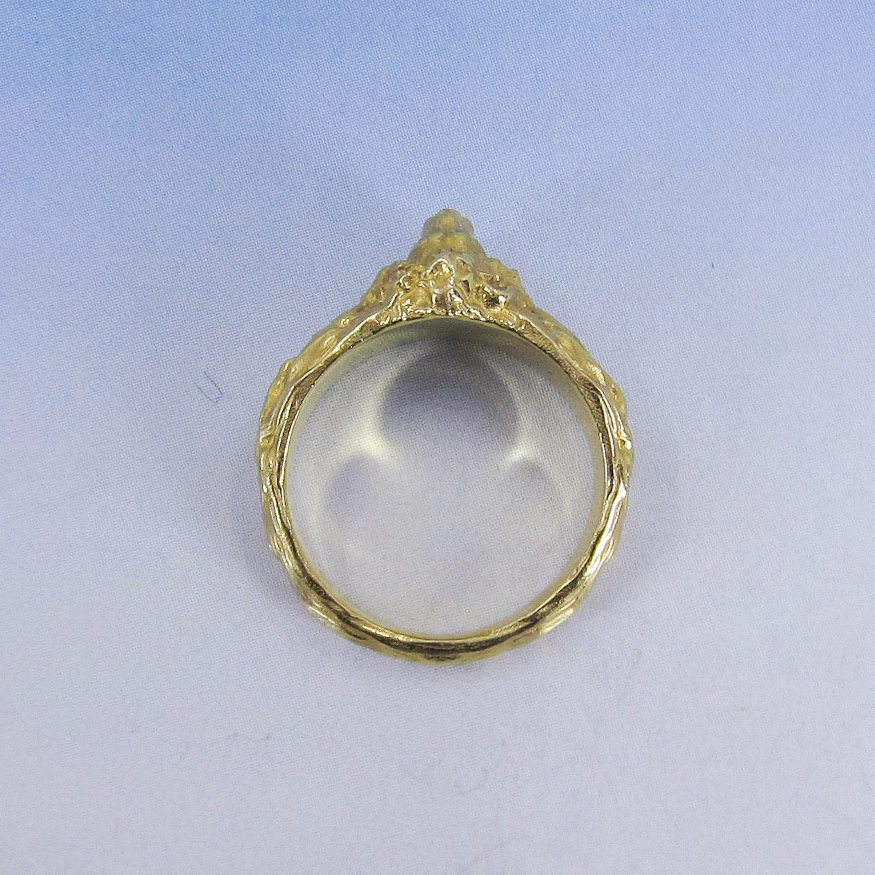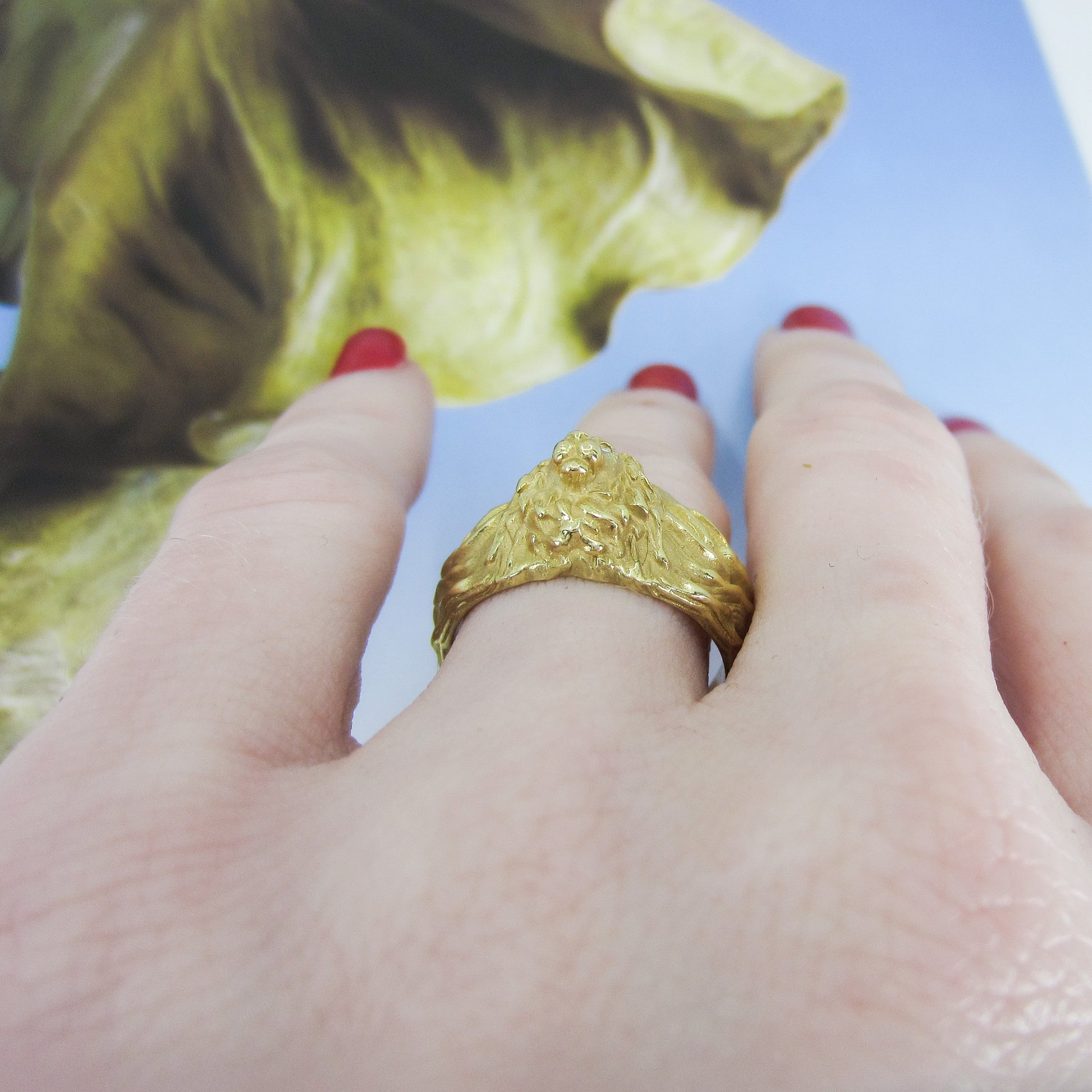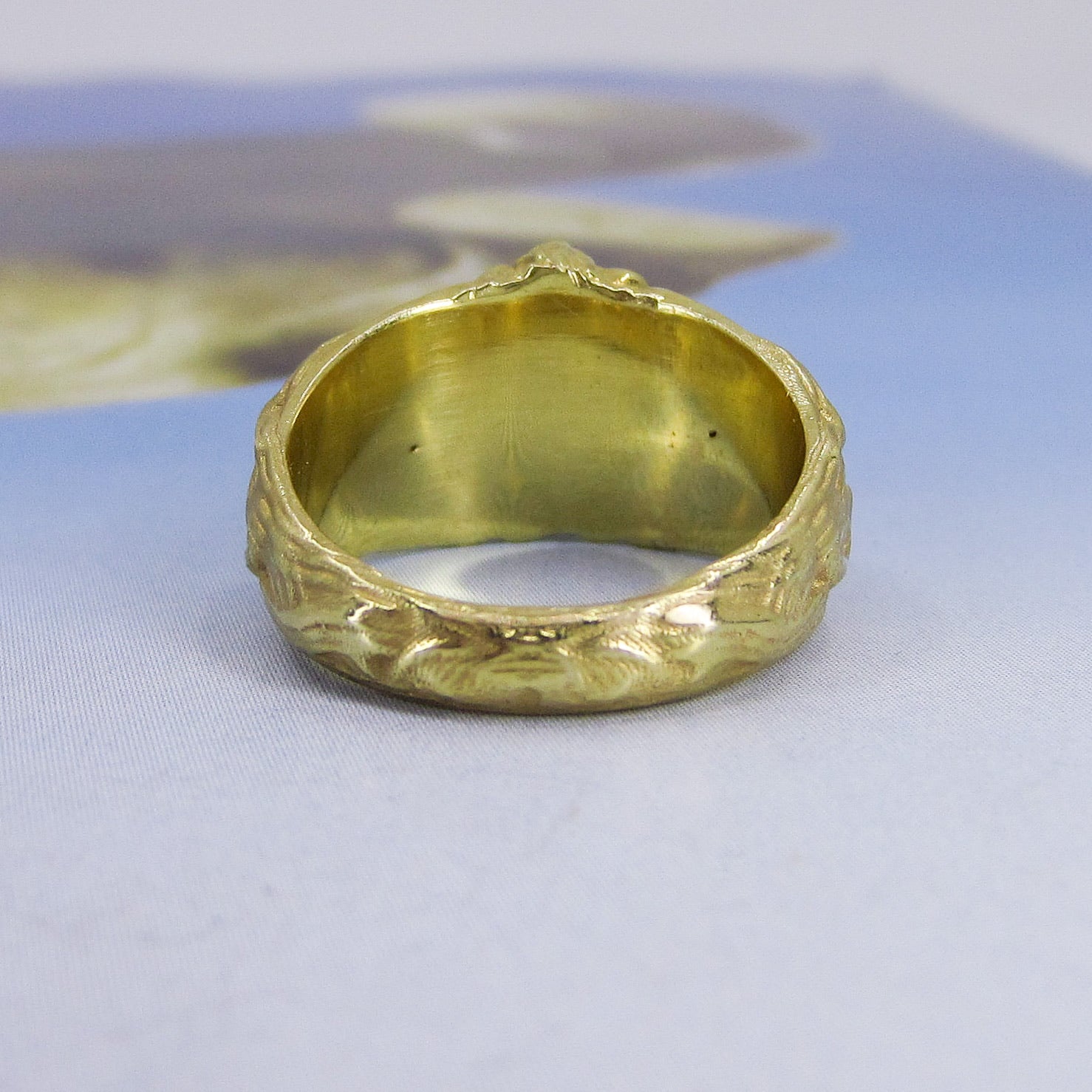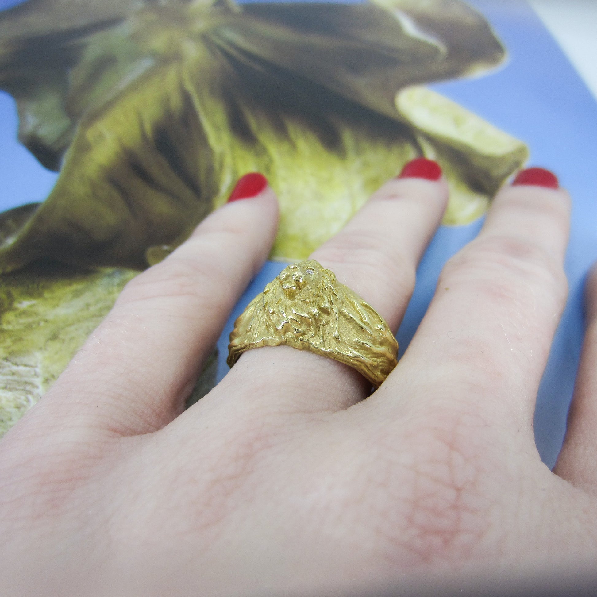 There's so much to say about this great vintage lion ring! The first thing you notice is that there is a LOT of detail packed onto this ring and it is unusual in its design, with the lion's face quite small and leaving room for his mane. While the face may be small, it is very beautifully detailed and kind of cute! This is a friendly lion and that's okay, they don't all have to be fierce! You can see in the photos this ring has a very sculptural, three dimensional quality. I haven't seen one exactly like this before so I'm putting it at Mid-Century based on the diamond cuts and the construction. Nice and heavy and made in 14k gold that is polished on the high relief areas and matte in the recessed areas. Would make a great ring for a LEO, wedding band for an adventurous person or collection addition if you're like me and love all things figural!