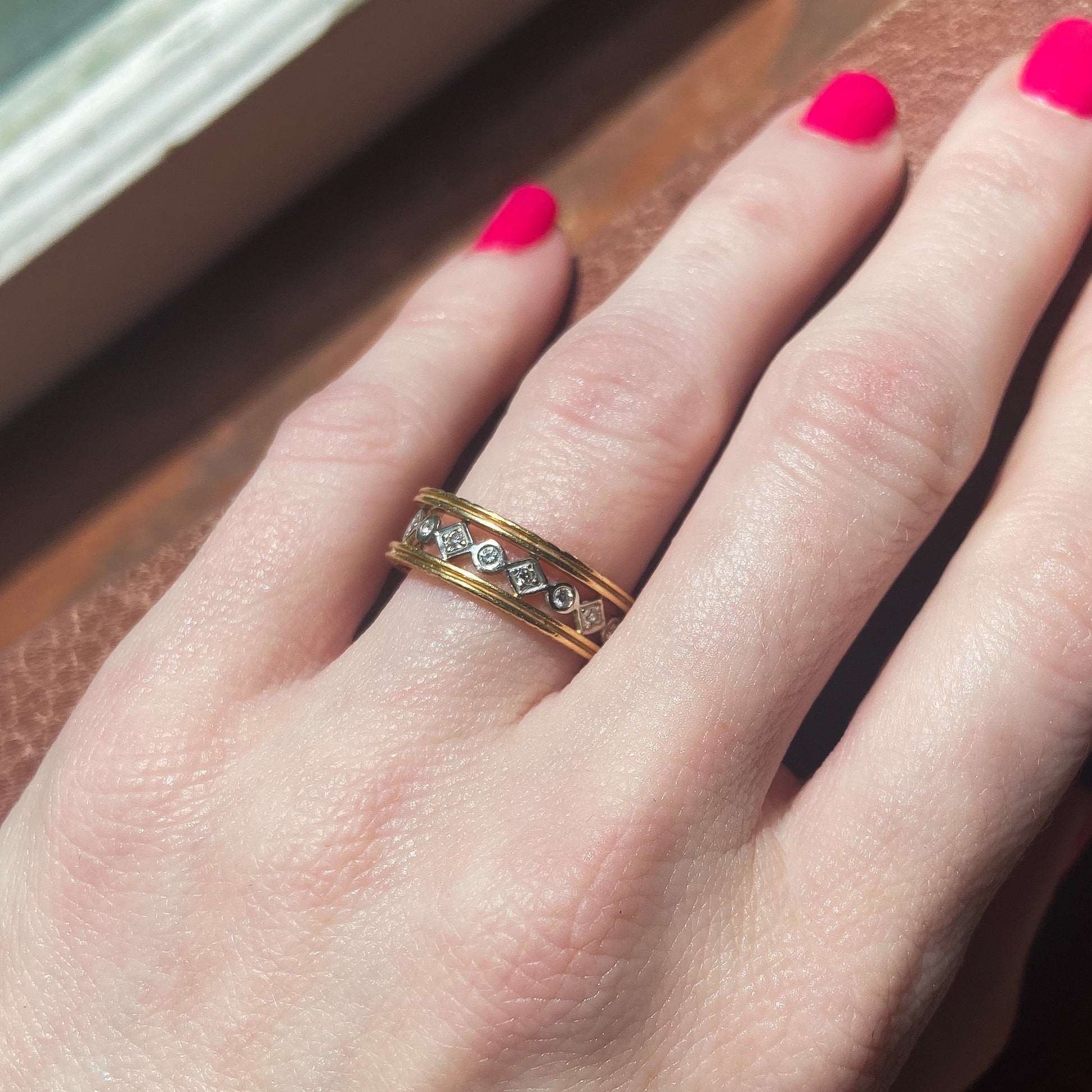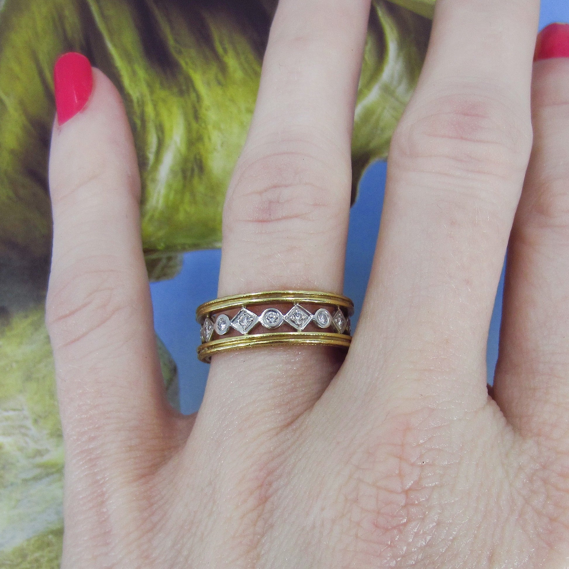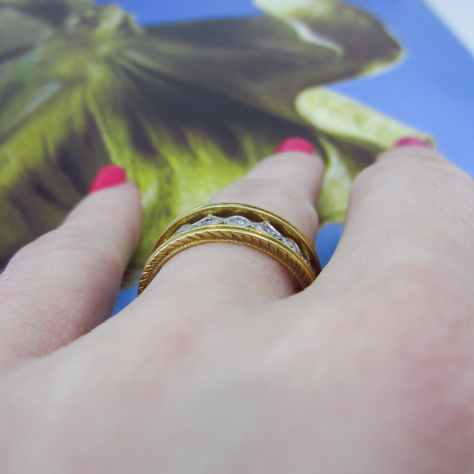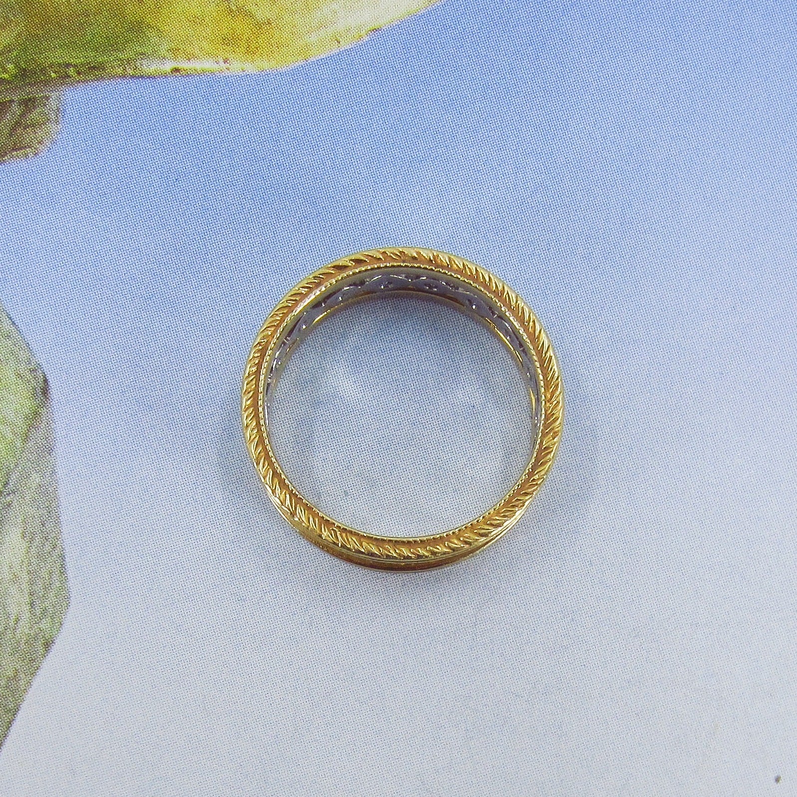 This lovely band dating to the 1990’s features Round Brilliant Cut diamonds set in diamond and round shaped platinum frames flanked by two 18k yellow gold engraved bands. Very pretty in person and has a regal, airy look to it! Size 6.25 and can’t be resized.