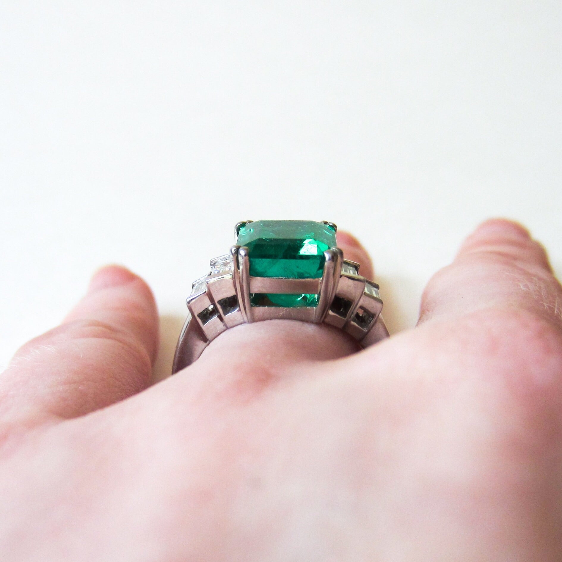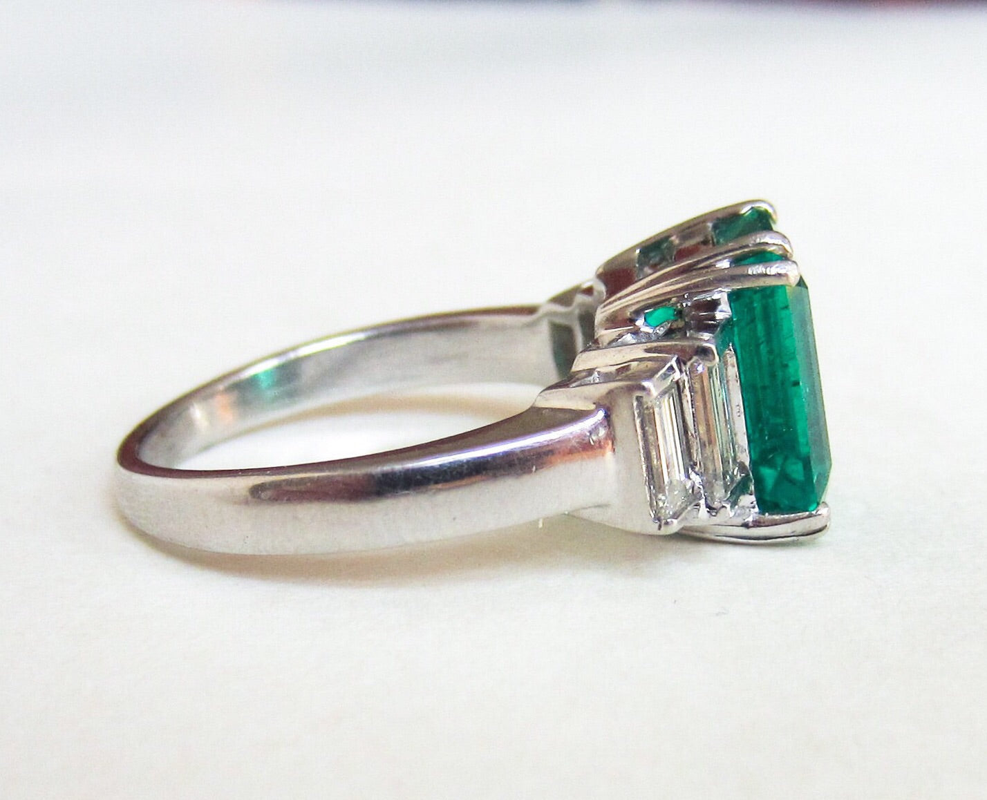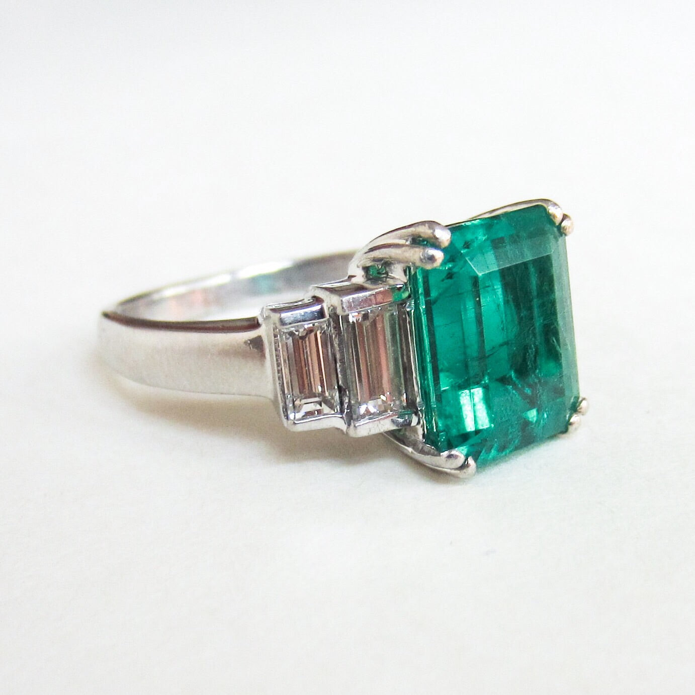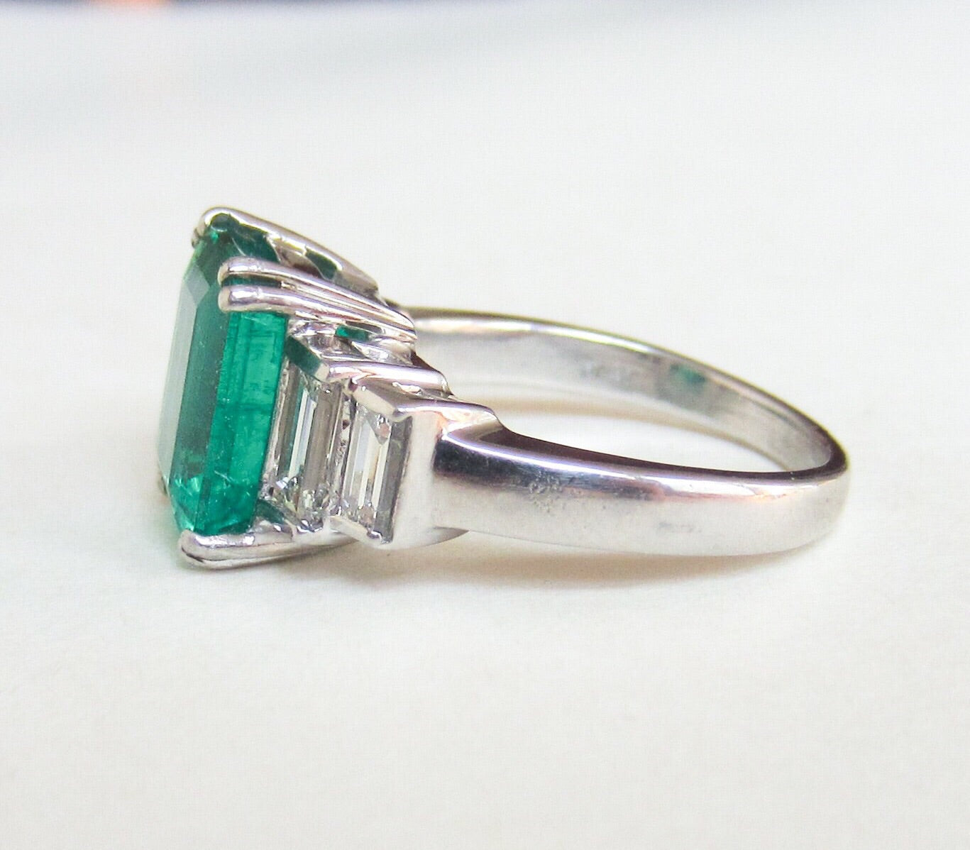 SOLD-GORGEOUS Vintage Emerald 4.57ct and Baguette Diamond Ring Platinum