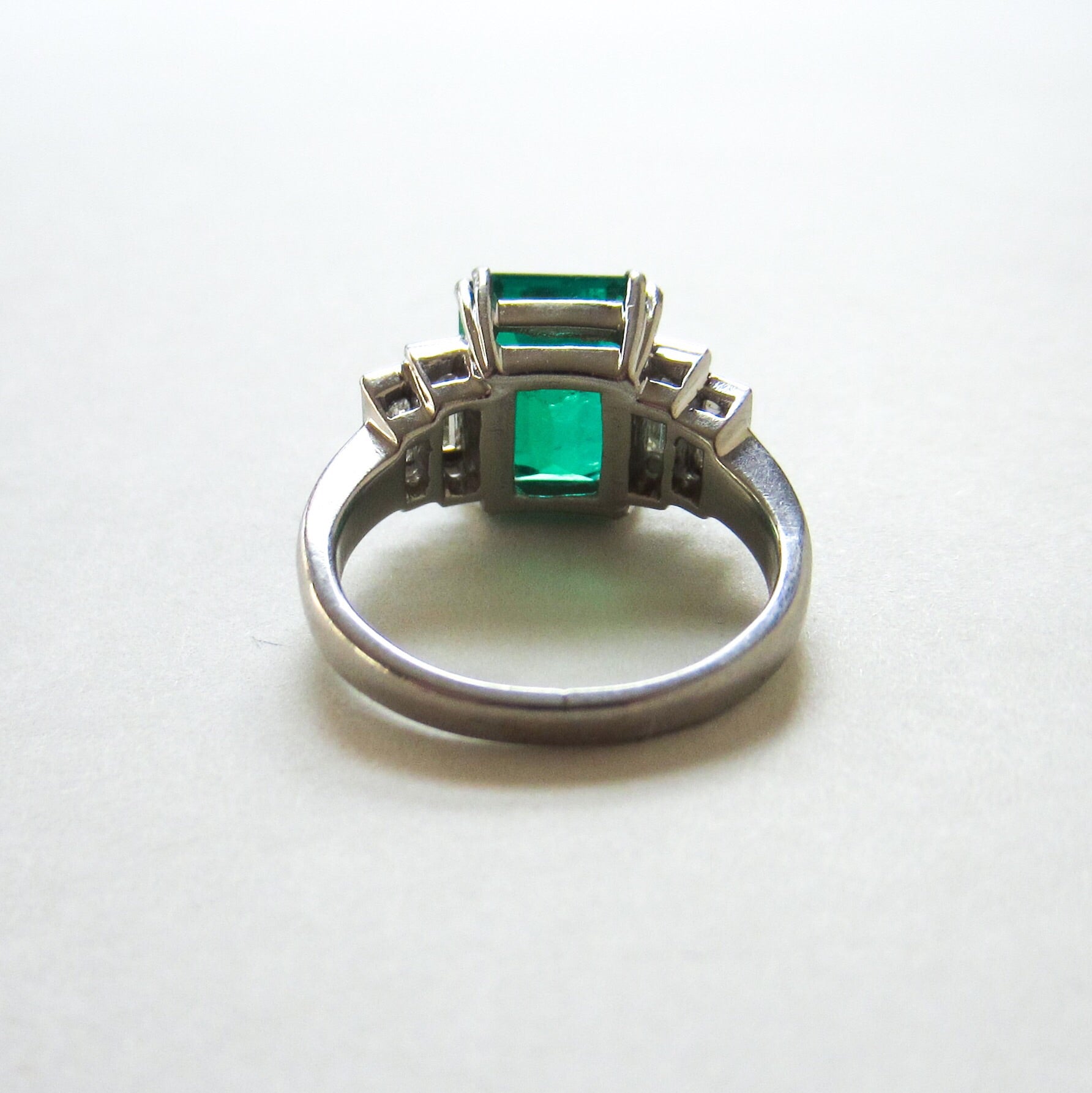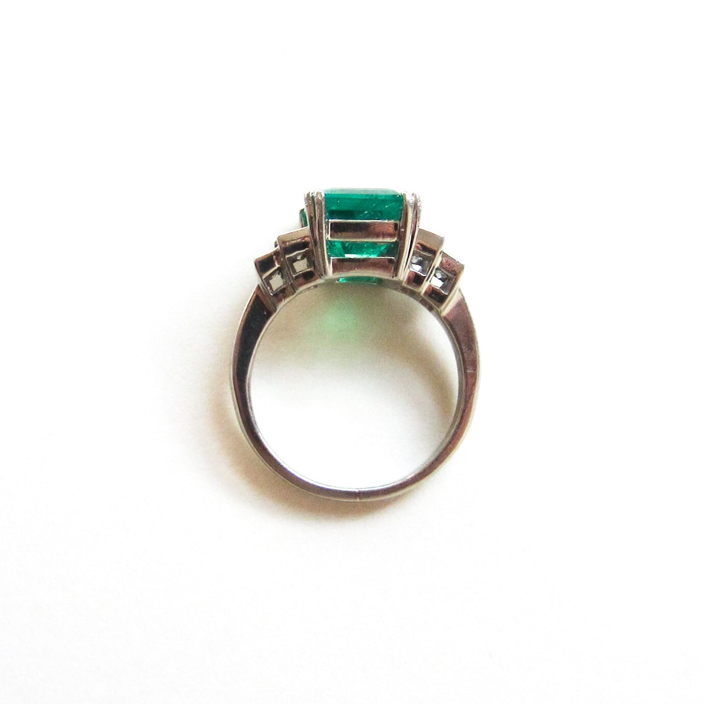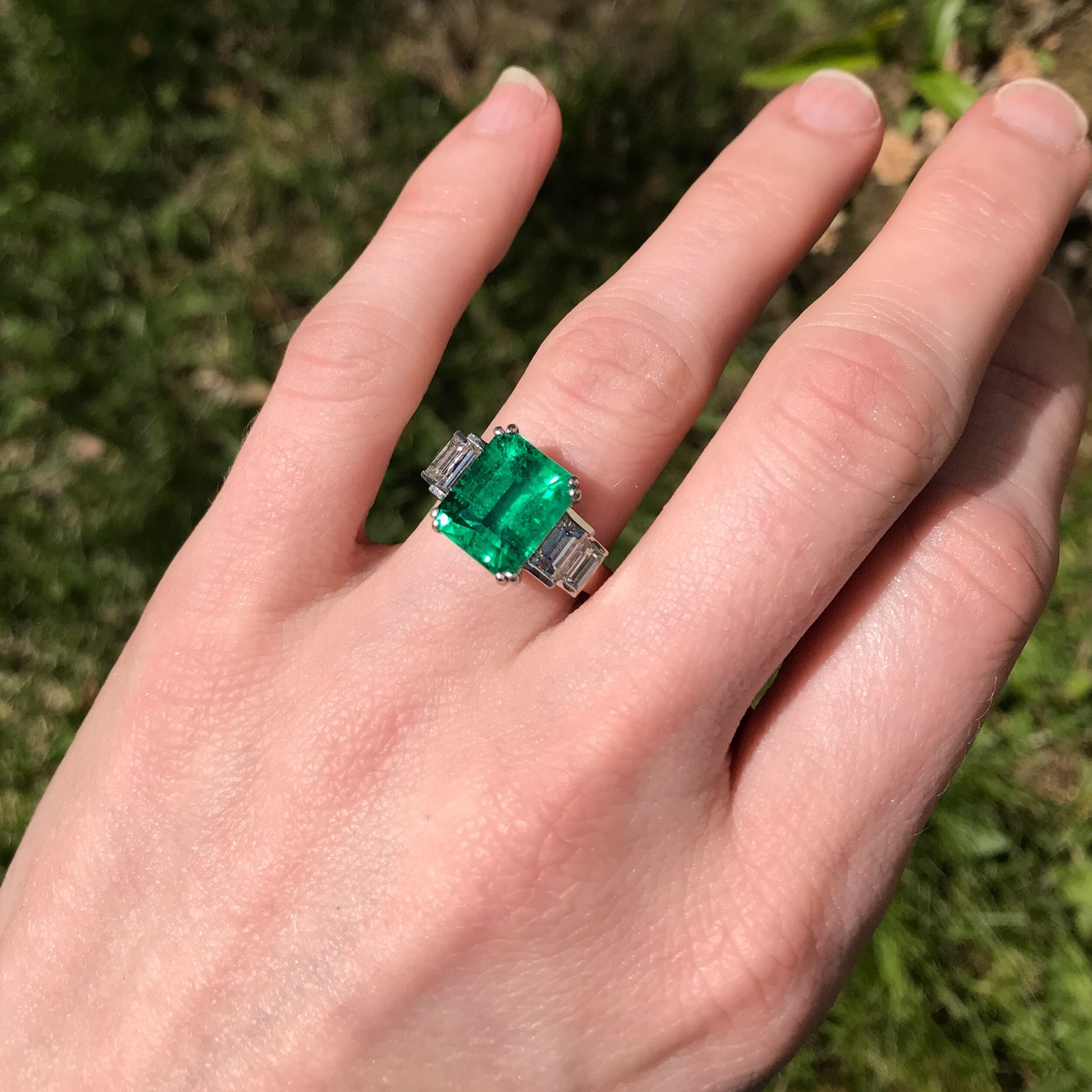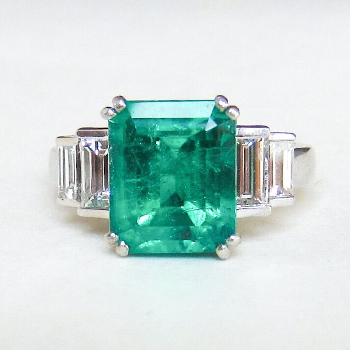 SOLD-GORGEOUS Vintage Emerald 4.57ct and Baguette Diamond Ring Platinum