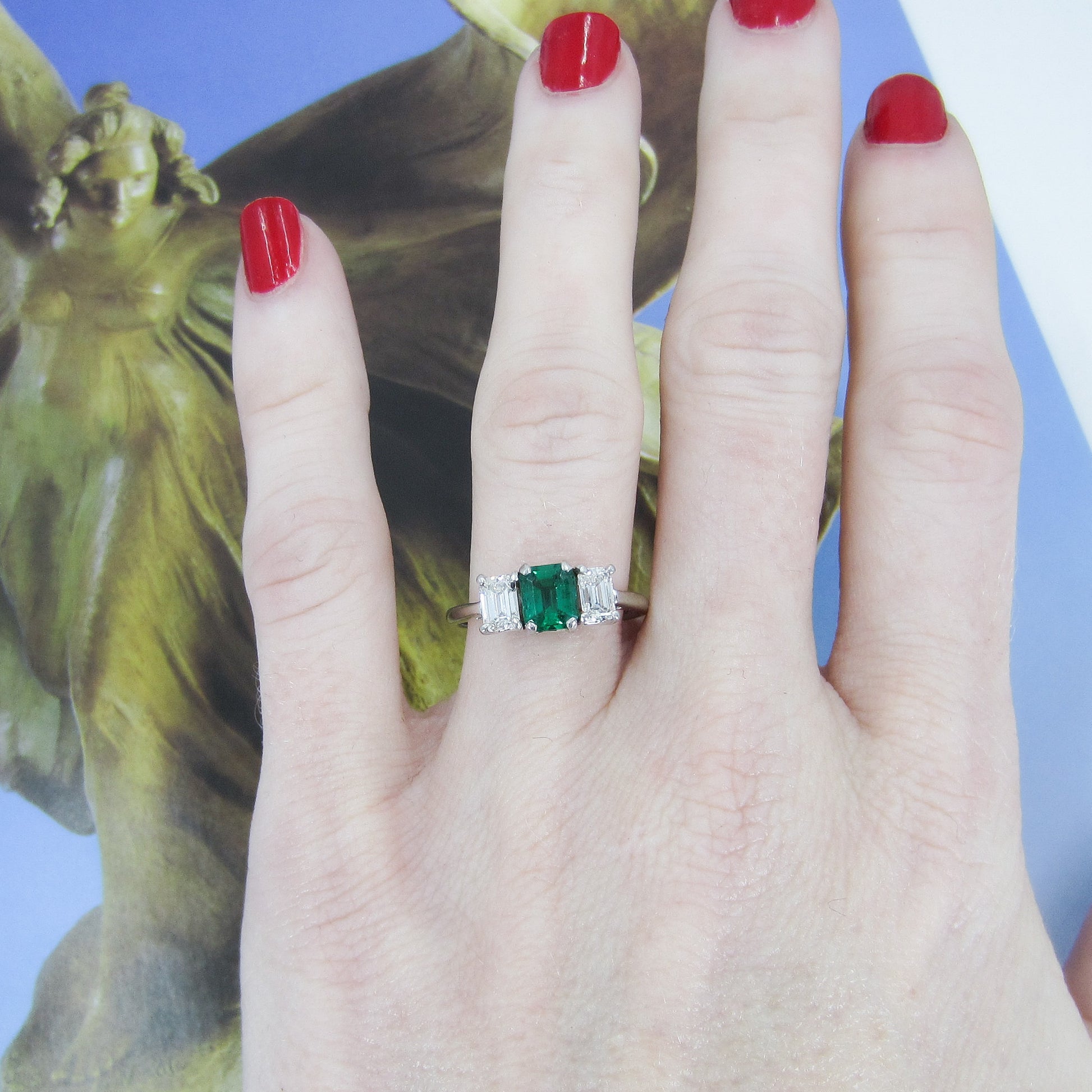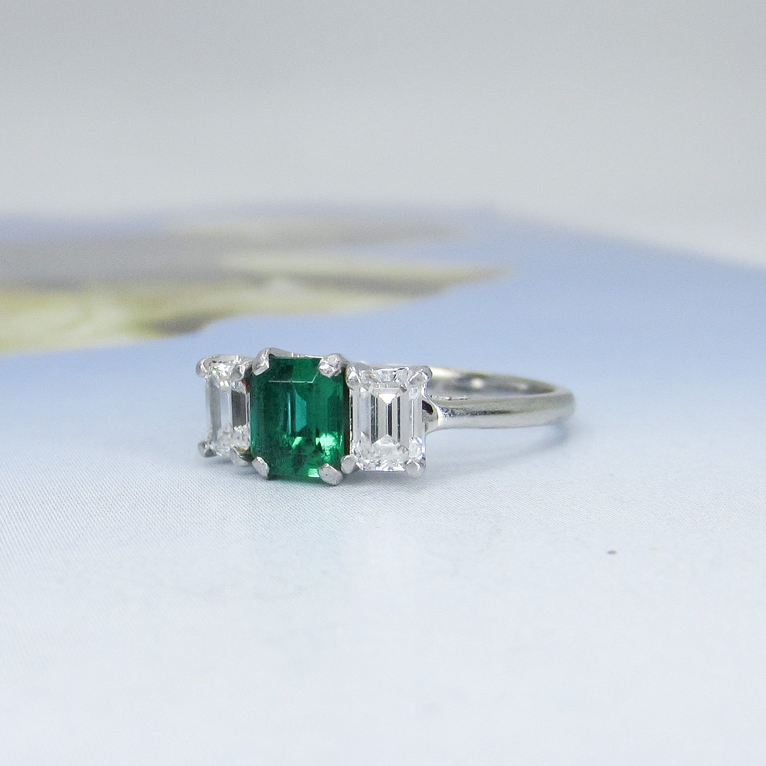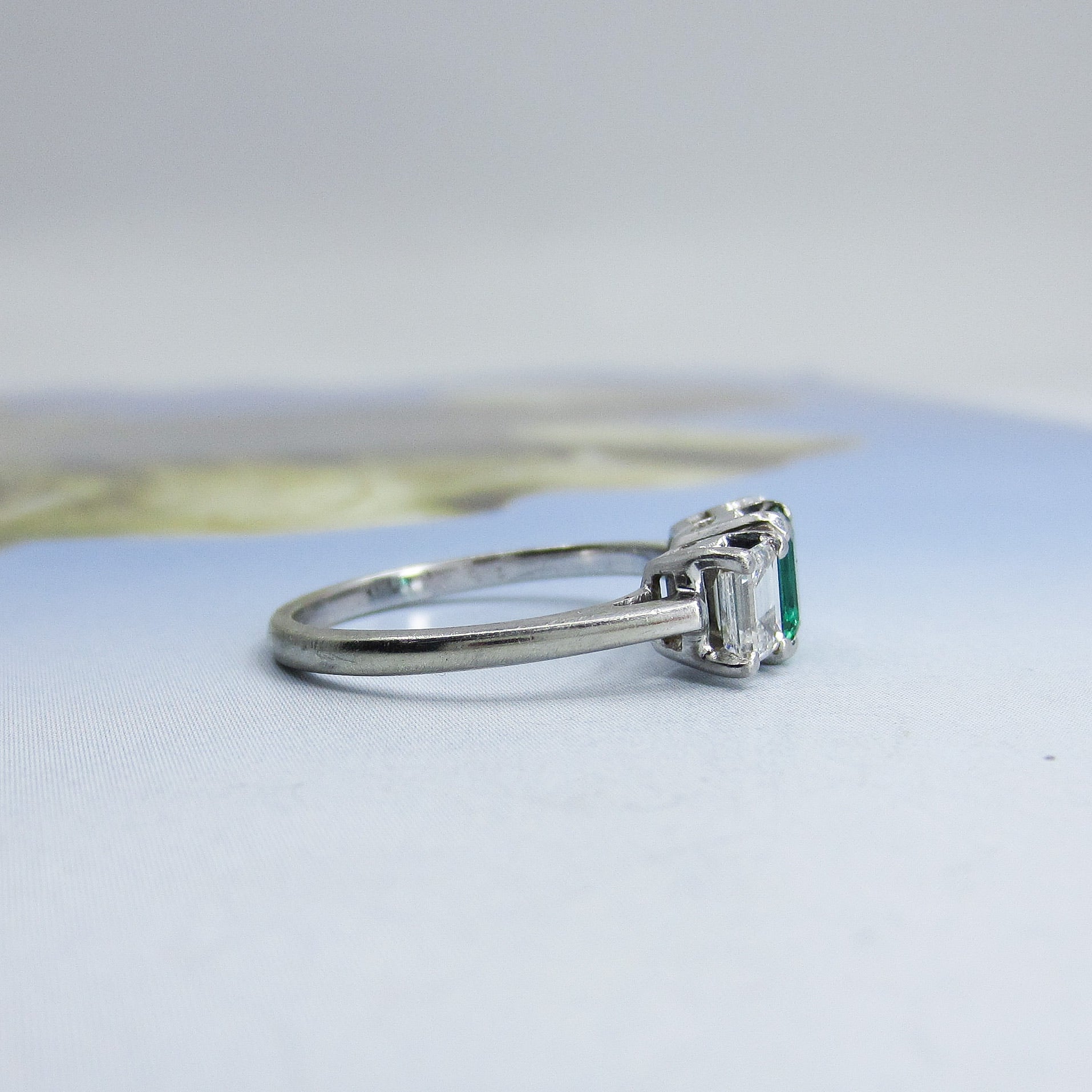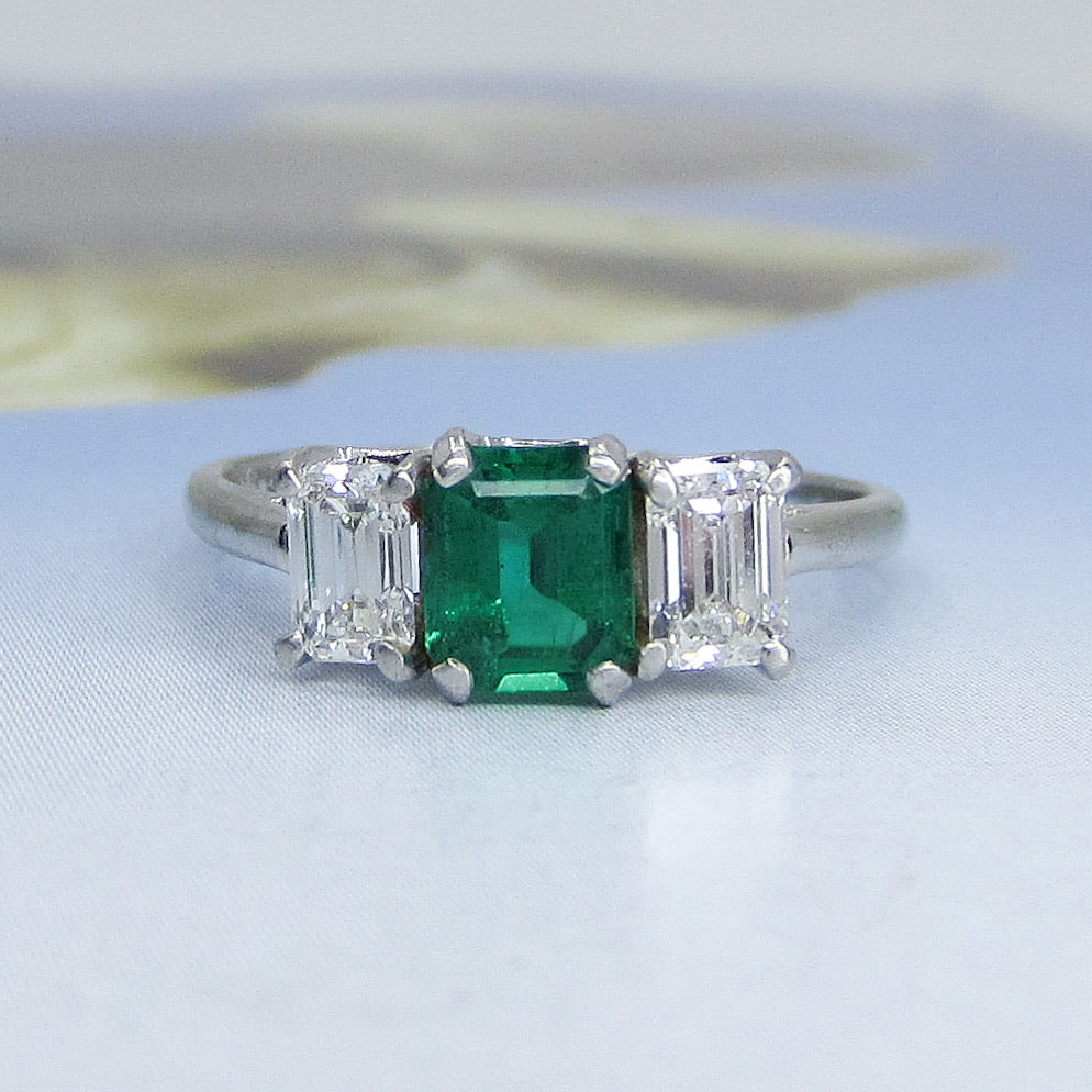This beautiful, vibrant and very high quality ring dates from the 1950's and has a classic three stone design with a little twist--a deep green natural emerald is centered flanked by two emerald cut diamonds set in a platinum basket with 18k white gold band. This one is a beauty guys--she came in with some bigger, flashier rings but my eyes kept going to her. These pics do not do this emerald justice and I know I've said this before with emeralds, but once again I'm faced with the daunting task of capturing the otherworldly glow of an emerald on a stupid mortal's camera! It is not possible! The next time the sun comes out (January 20, 2021) I'll take a video of this ring in action and then you'll really see what I'm talking about. All three stones are of exceptional quality--the color and clarity of this emerald is extremely fine and the diamonds are cut and matched beautifully with superb color and clarity. This face of this ring is somewhat petite but I've found it looks great on both smaller and larger finger sizes. This is a straight-sided ring so you can put a band right next to it should this appeal to you as an engagement ring--which it should, it would be perfect and not one person has ever said they regretted getting an emerald as their engagement ring stone!