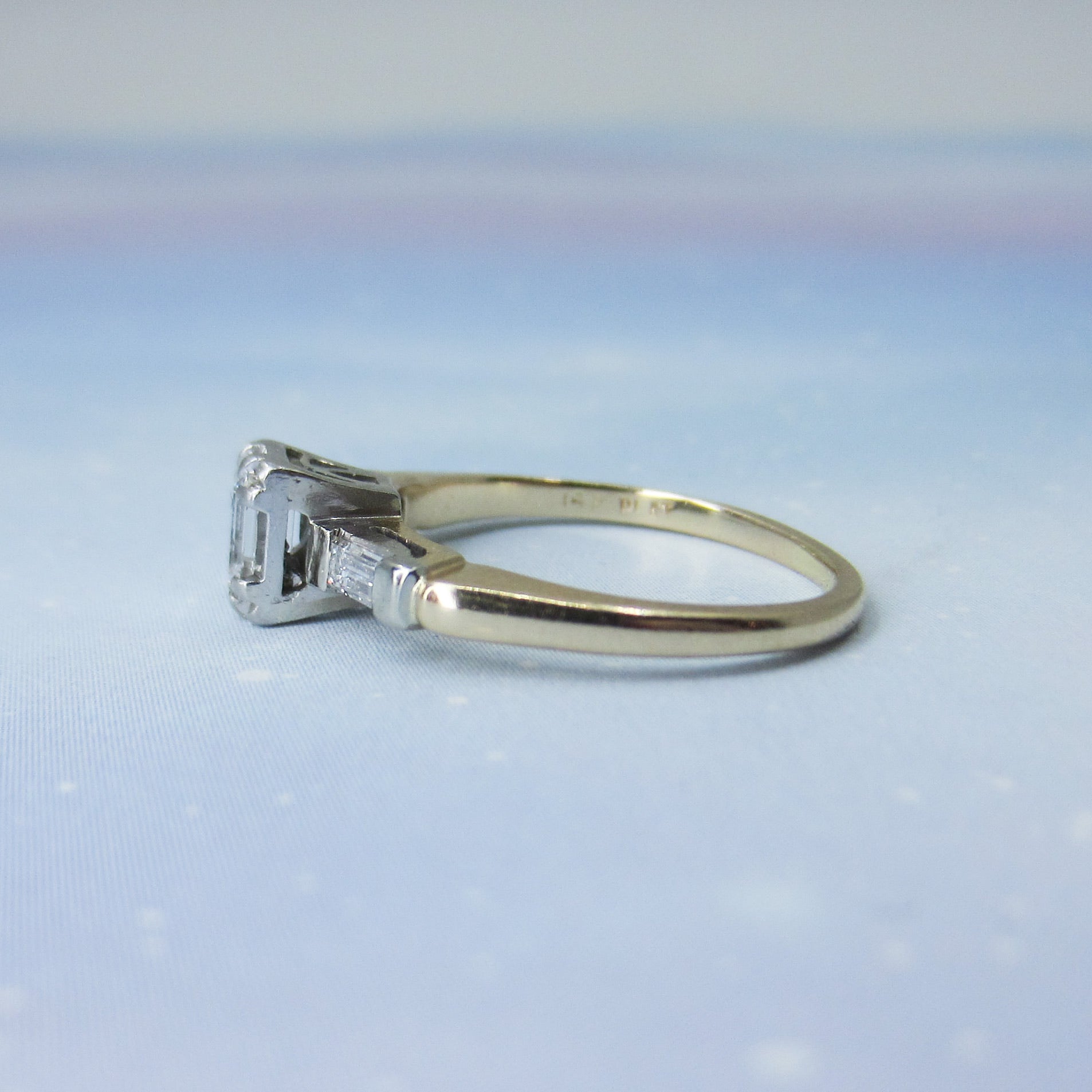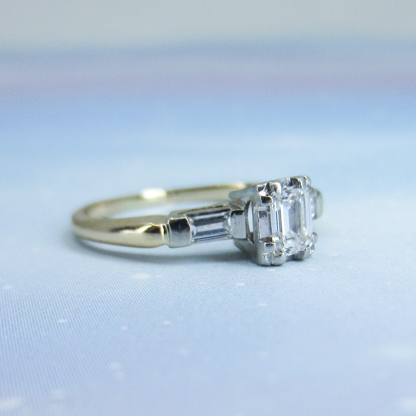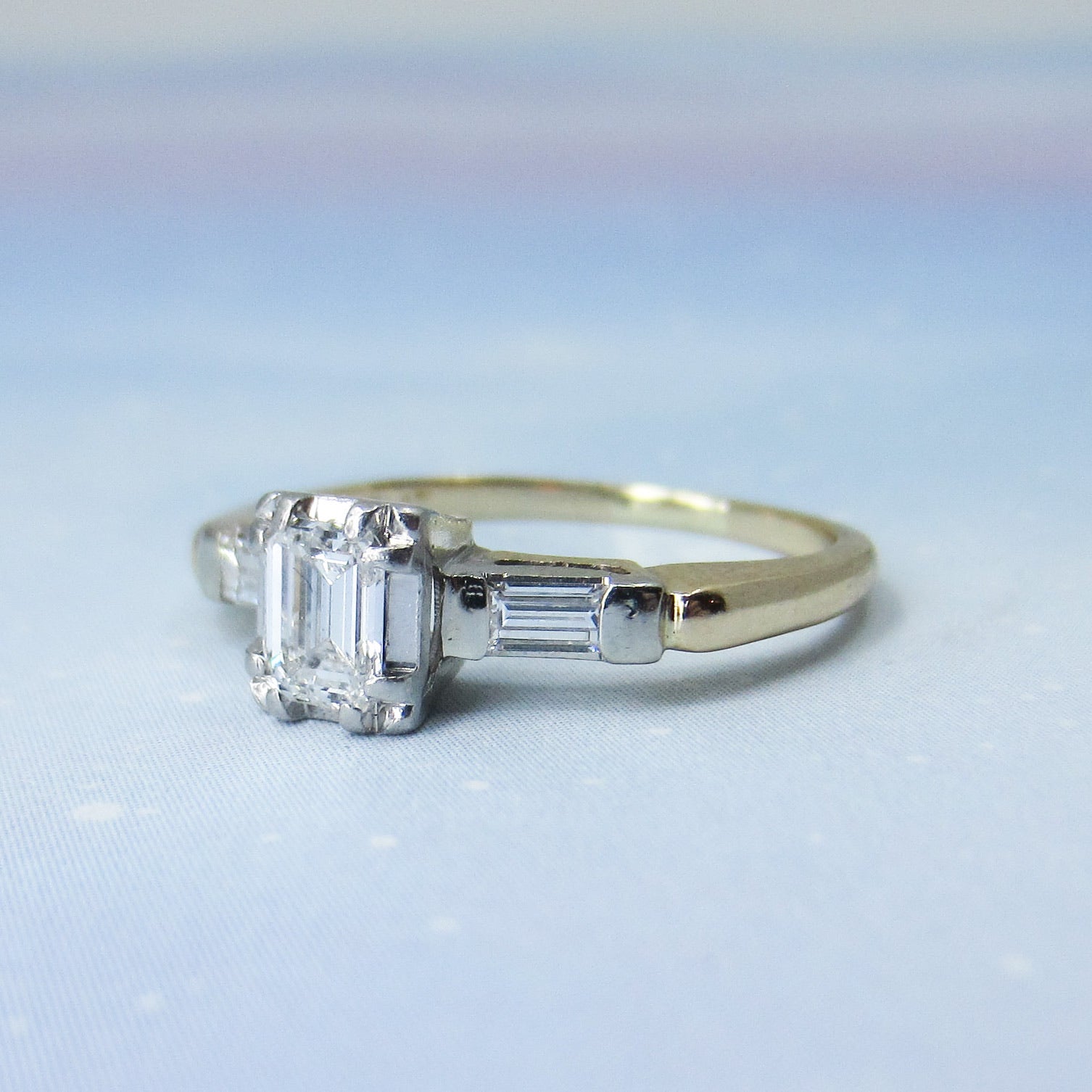 This is a vintage ring from the 1940's with a beautiful stone and a great overall look! Set with a .36ct natural Emerald Cut diamond and two baguette cut natural diamonds in platinum, with a 14k yellow gold band, this ring has a very dainty look that still packs a ton of those great angular flashes of light that emerald cuts are known for! It is a very high quality stone with F-G Color and VS1 Clarity and the baguettes are F-G VS2. A lot of personality in a smaller, very wearable ring!