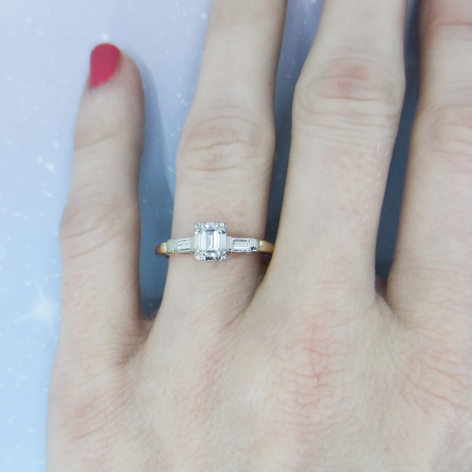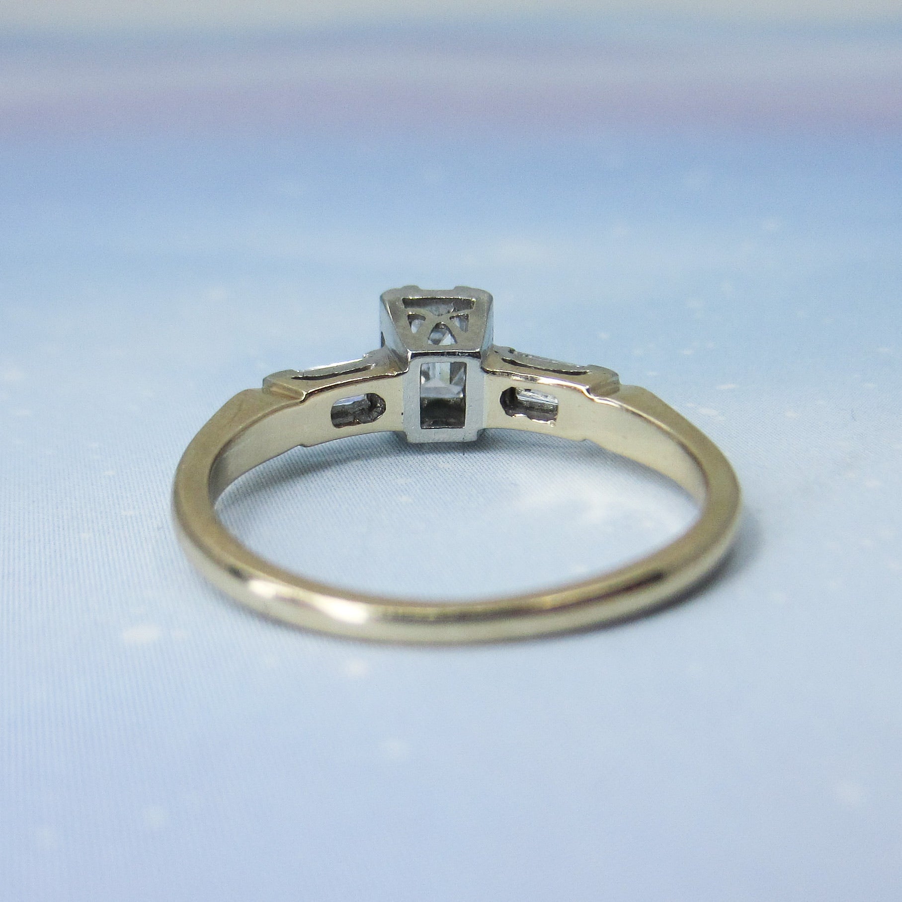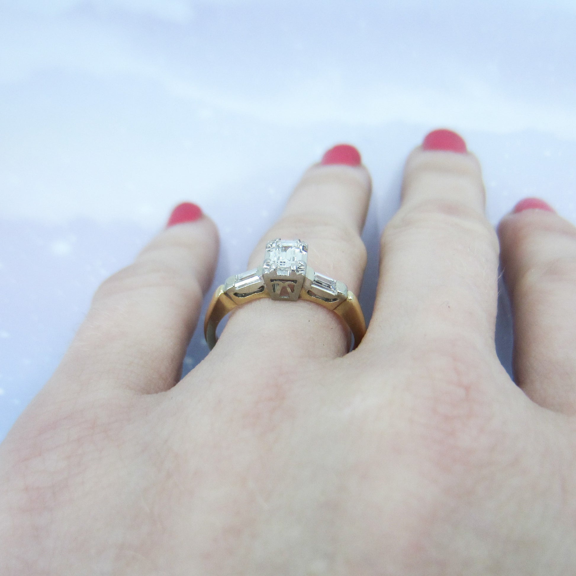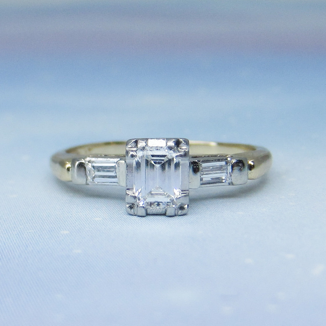 This is a vintage ring from the 1940's with a beautiful stone and a great overall look! Set with a .36ct natural Emerald Cut diamond and two baguette cut natural diamonds in platinum, with a 14k yellow gold band, this ring has a very dainty look that still packs a ton of those great angular flashes of light that emerald cuts are known for! It is a very high quality stone with F-G Color and VS1 Clarity and the baguettes are F-G VS2. A lot of personality in a smaller, very wearable ring!