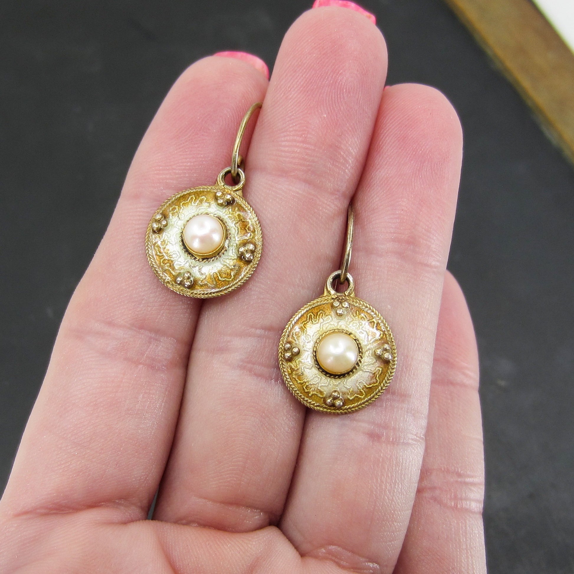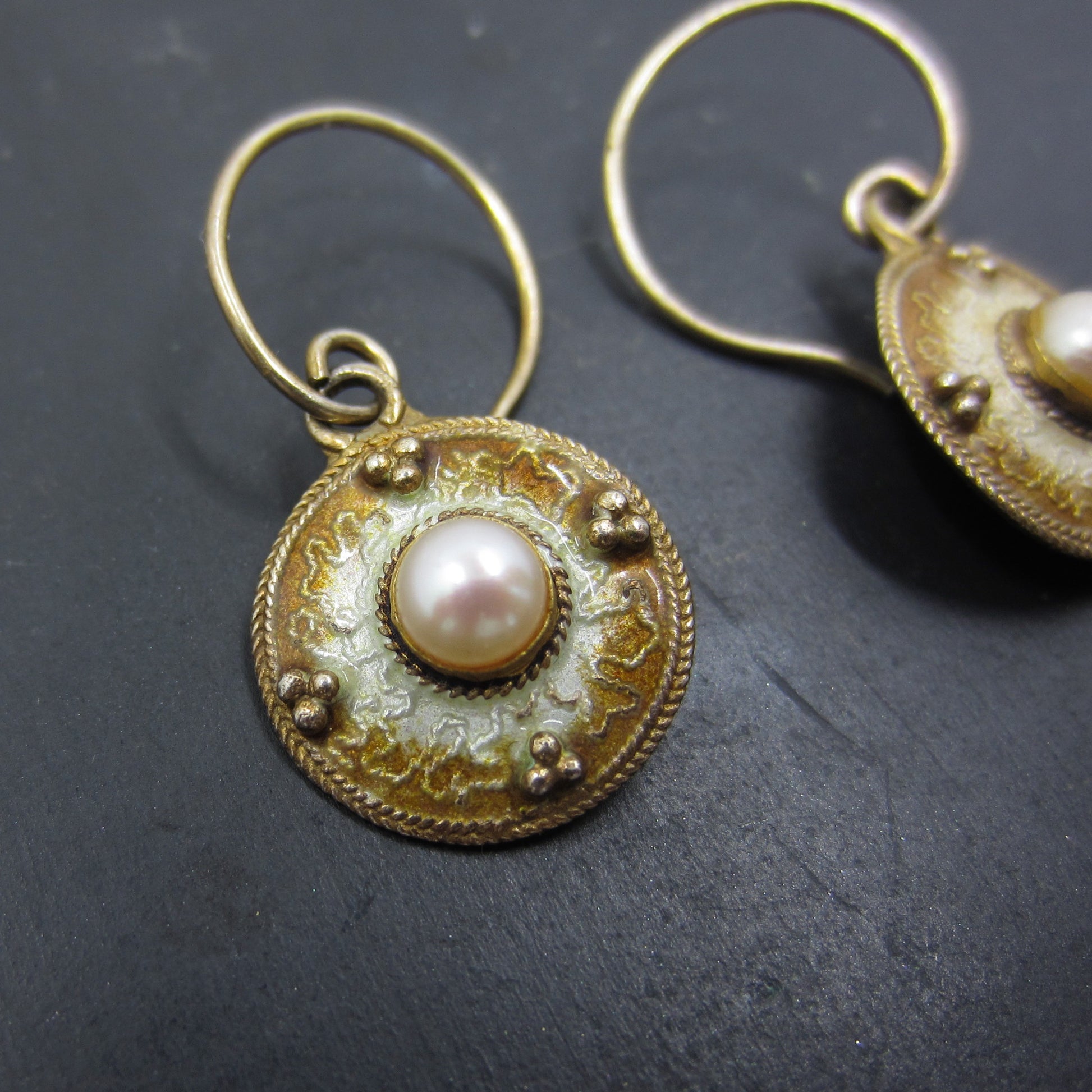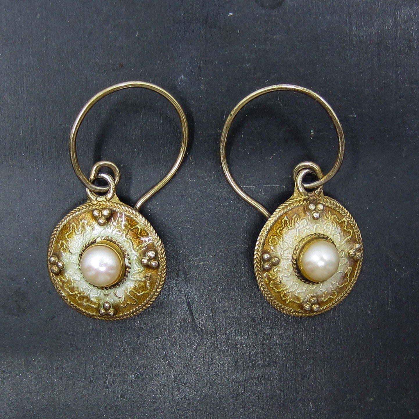 SOLD-Vintage Enamel and Pearl Drop Earrings Gilt Sterling, Scandinavian c. 1970