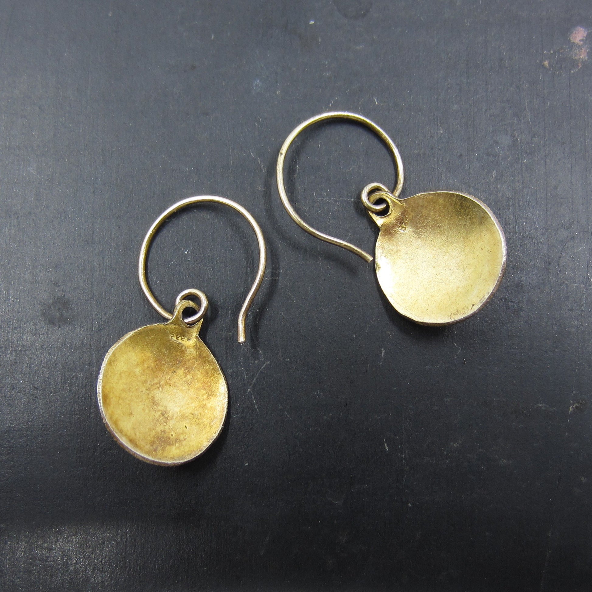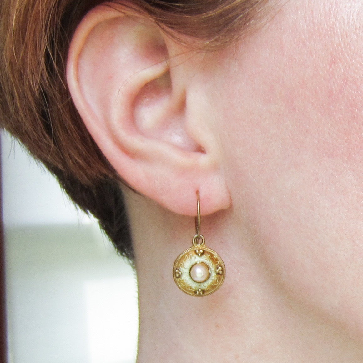 pretty pair of wearable earrings with a bezel set half-pearl in the center framed by white and gold enamel. Made in gilt sterling silver circa 1970's, most likely Scandinavian. These are so pretty on and pearls always add light when worn near the face!