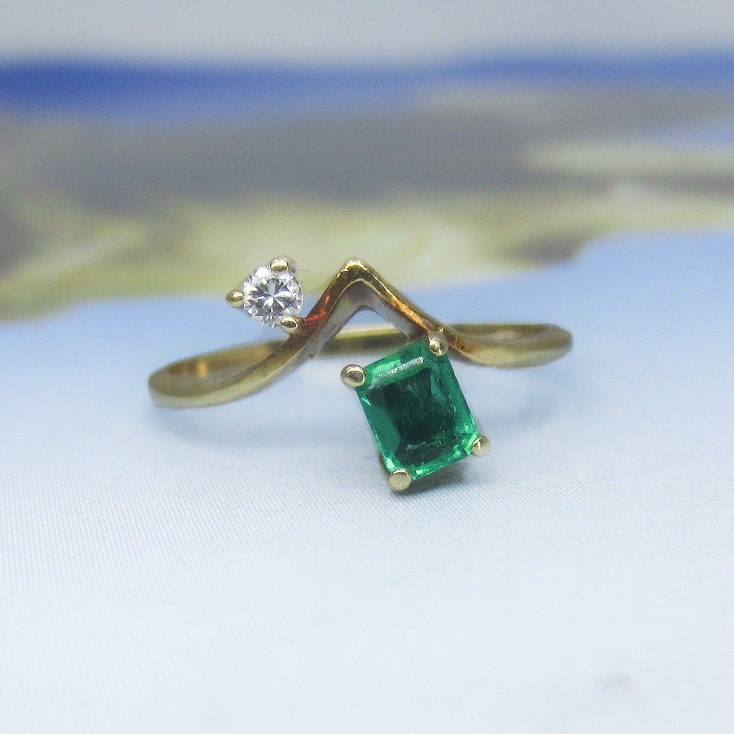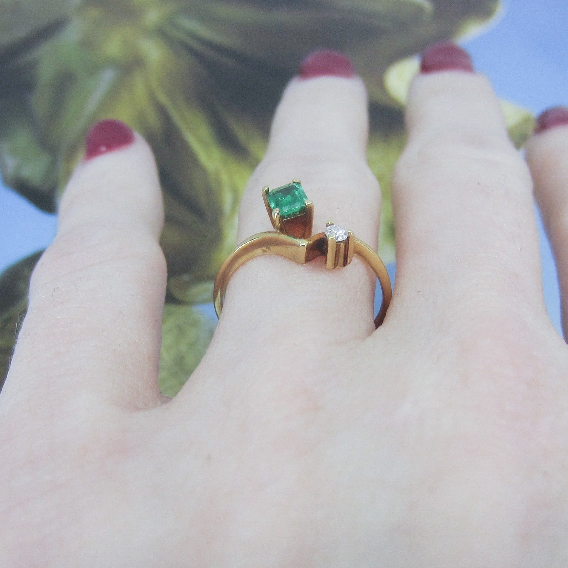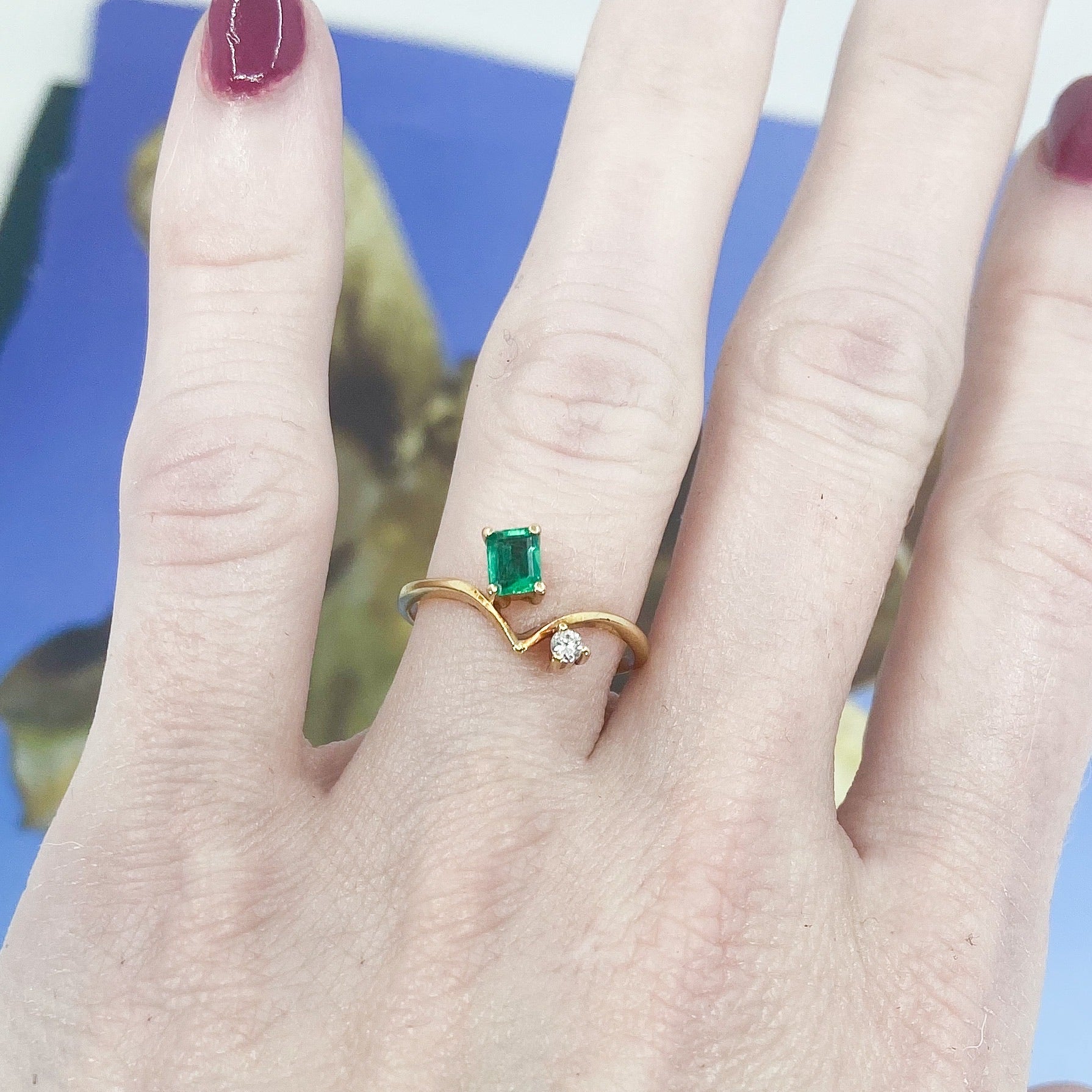 I'm not sure of the age on this dainty little ring, but what I can tell you is that is lovely on the hand and is incredibly fun to wear! I'm going to guess that it was made in the 1970's or so. Set with one very vibrant--I mean perfect color--natural emerald cut emerald and a little diamond on a chevron shaped 18k yellow gold band. Please take a look at the measurements and pics on the hand so you can get a sense of the delicate scale! This would make a wonderfully sweet engagement ring!