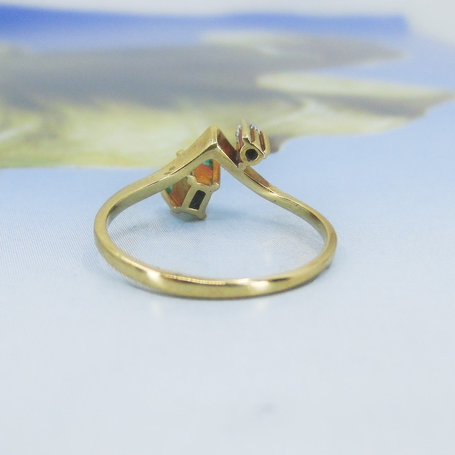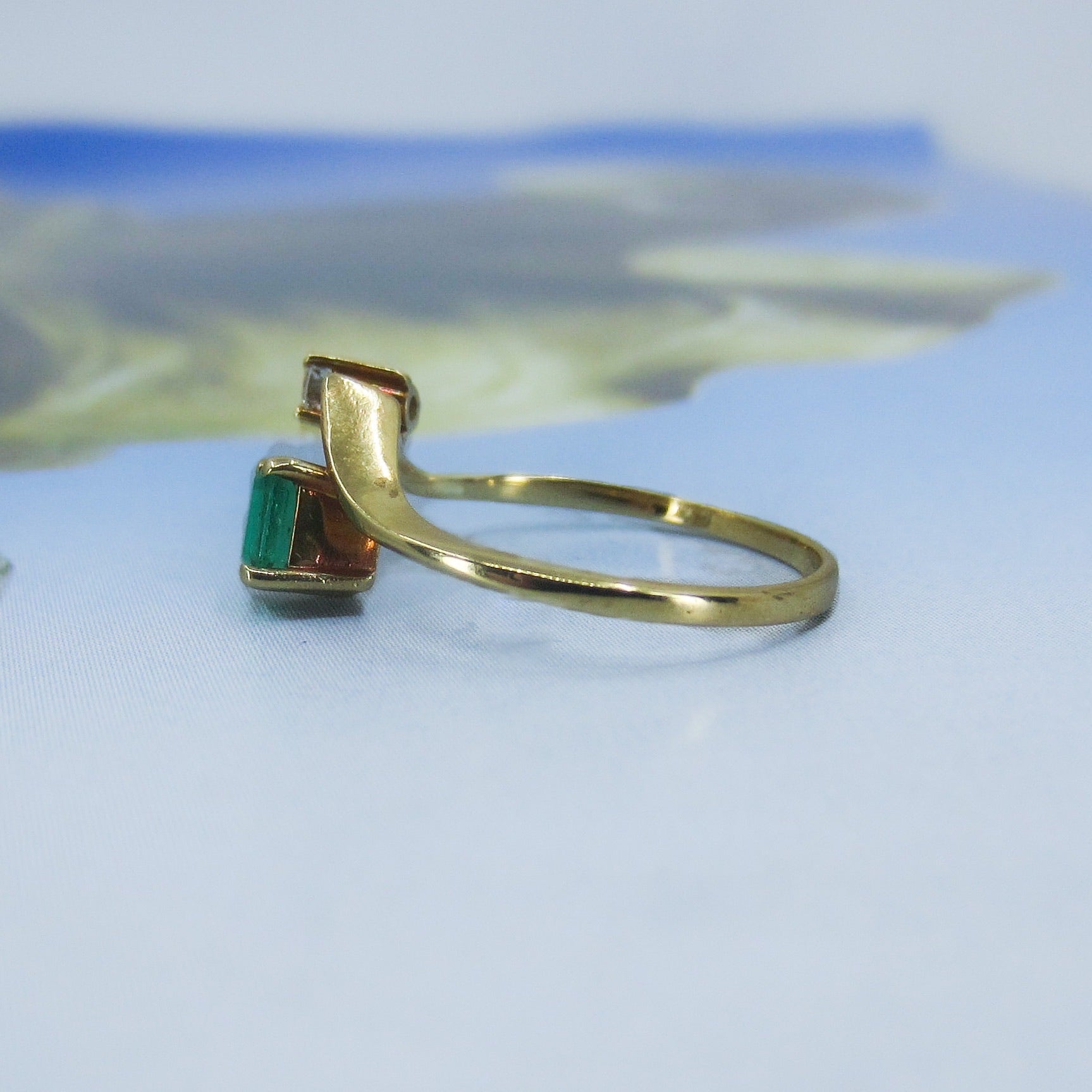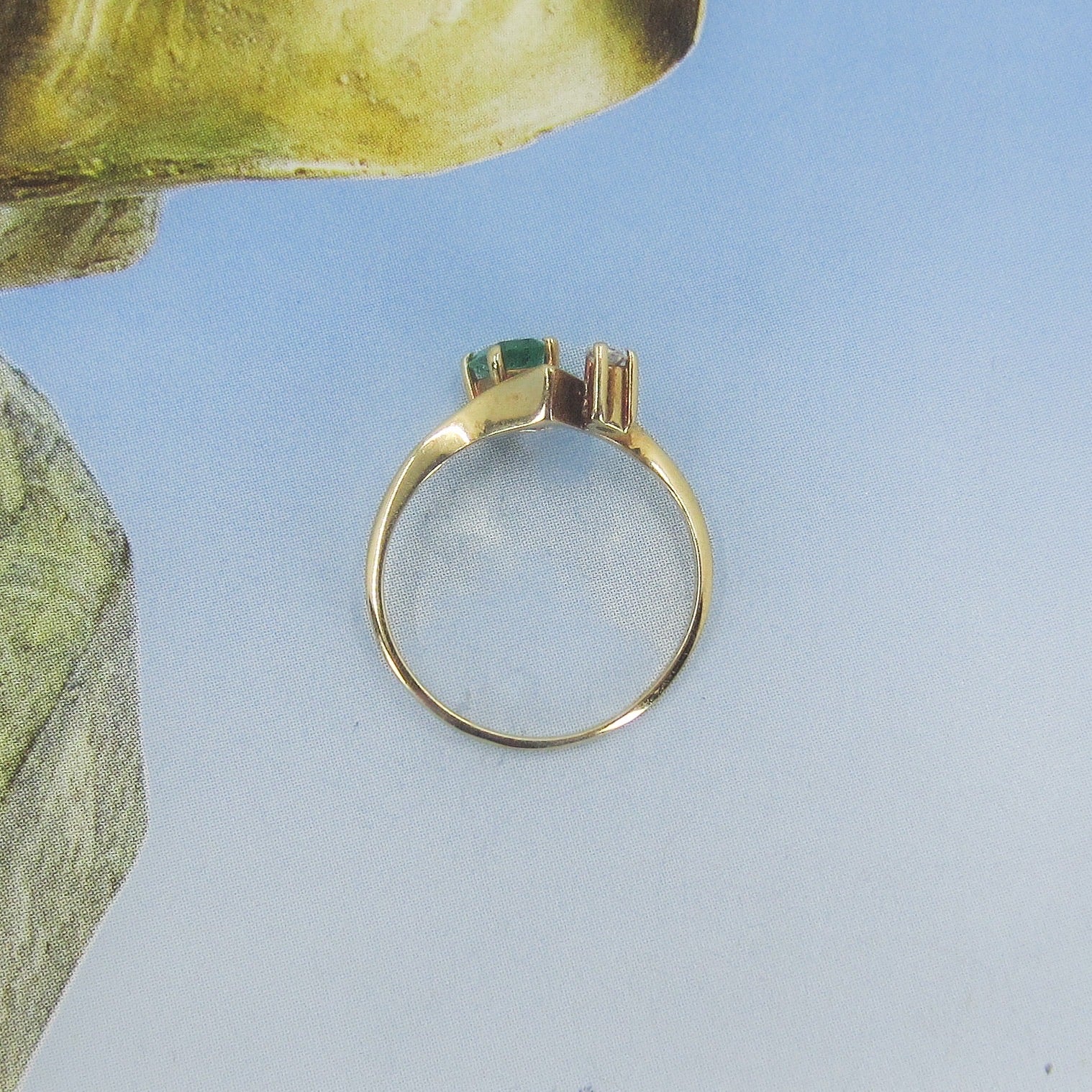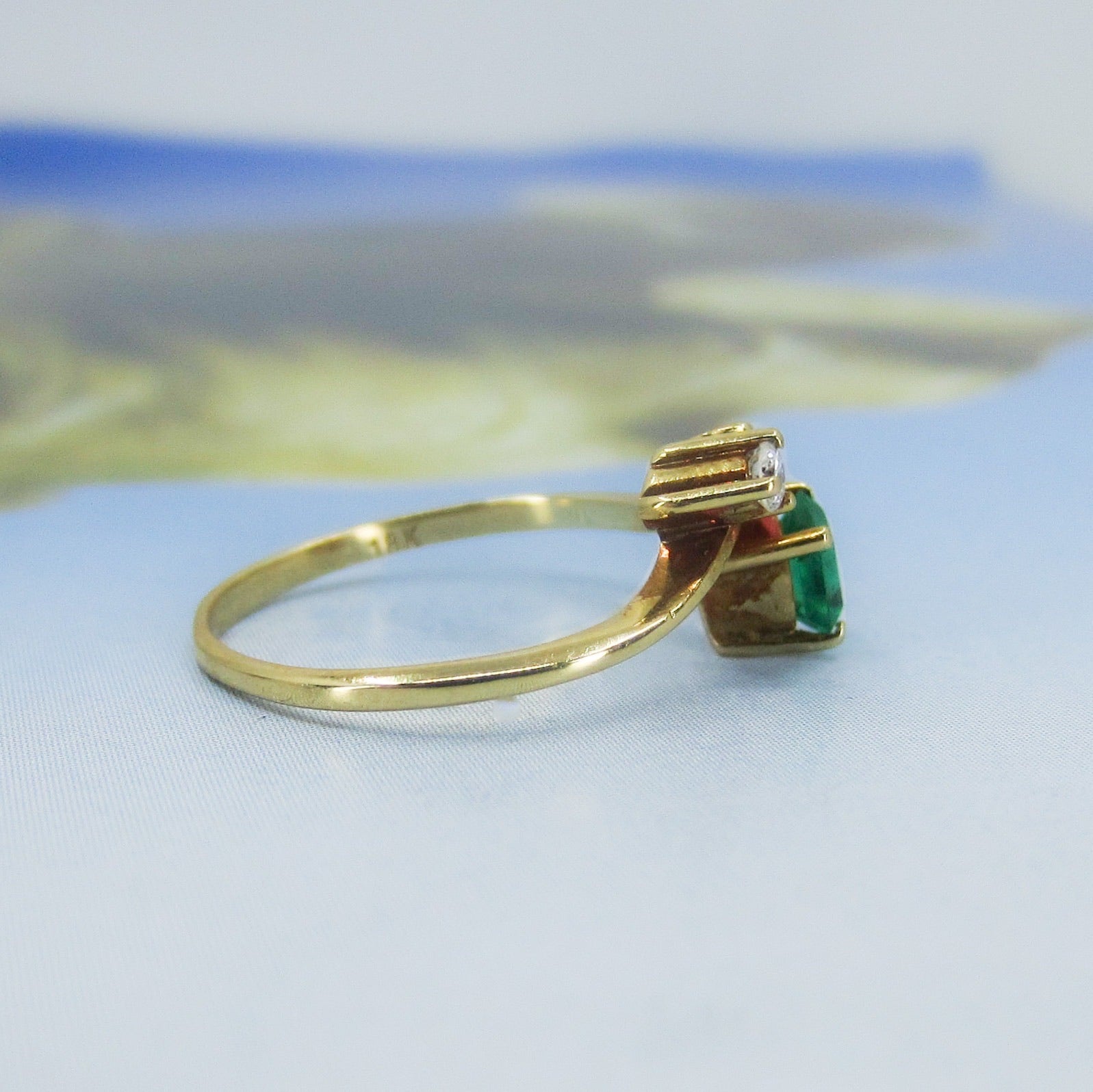 I'm not sure of the age on this dainty little ring, but what I can tell you is that is lovely on the hand and is incredibly fun to wear! I'm going to guess that it was made in the 1970's or so. Set with one very vibrant--I mean perfect color--natural emerald cut emerald and a little diamond on a chevron shaped 18k yellow gold band. Please take a look at the measurements and pics on the hand so you can get a sense of the delicate scale! This would make a wonderfully sweet engagement ring!