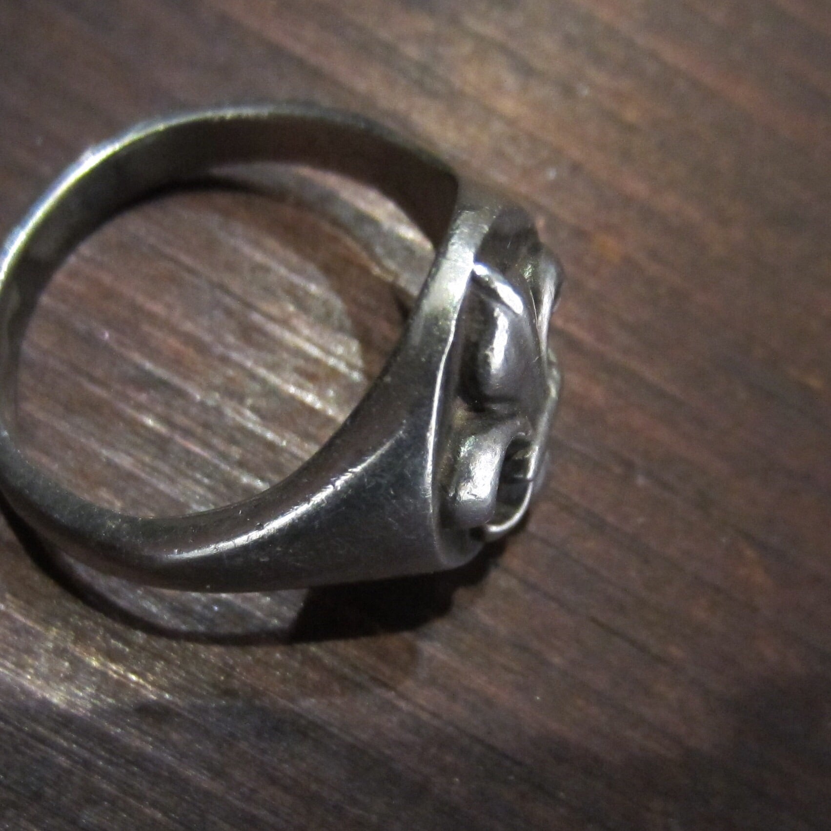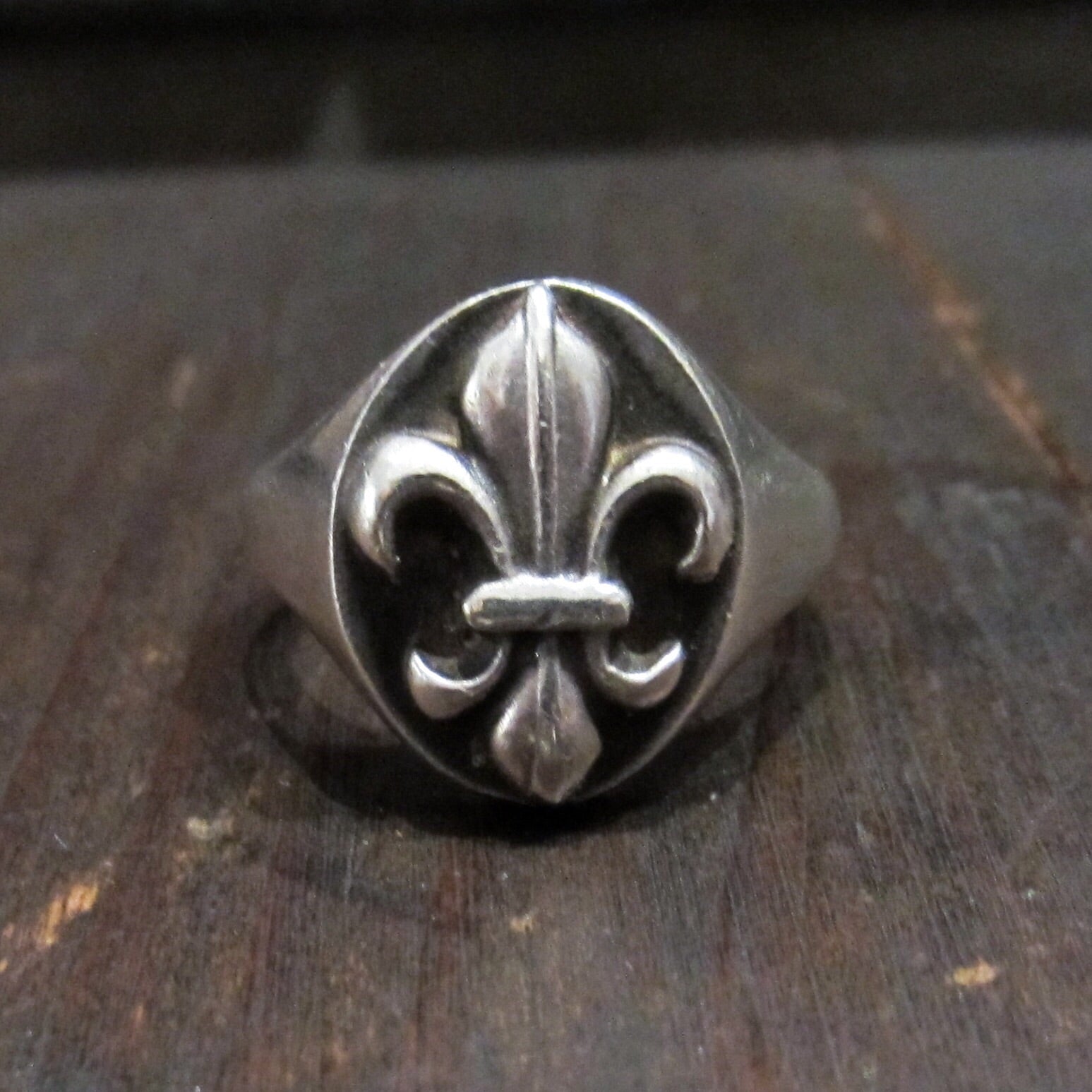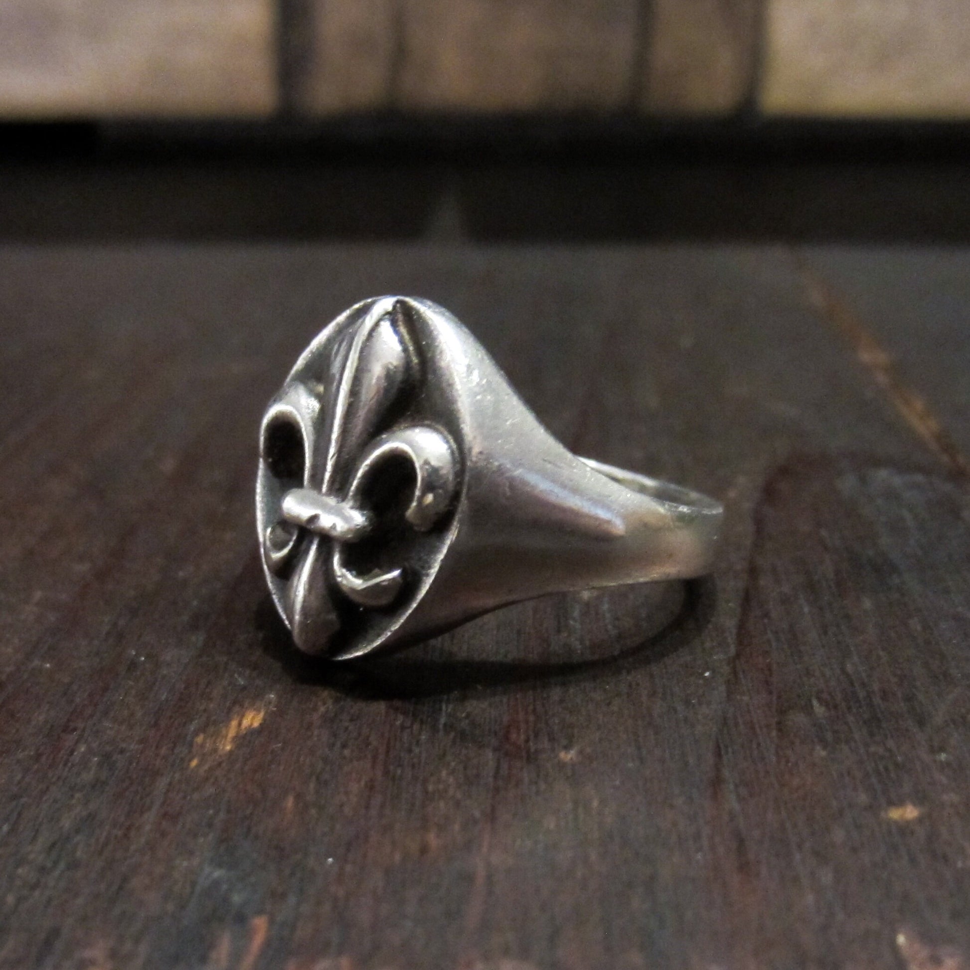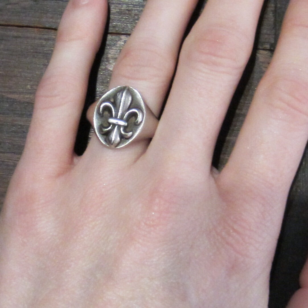 This is a French-made fleur de lis signet ring in sterling silver, of unknown age, with nice patina, soft wear and French hallmarks and maker's mark. The fleur de lis is high relief and pops out from the background patina. It can easily become your everyday statement ring, it has a great look!