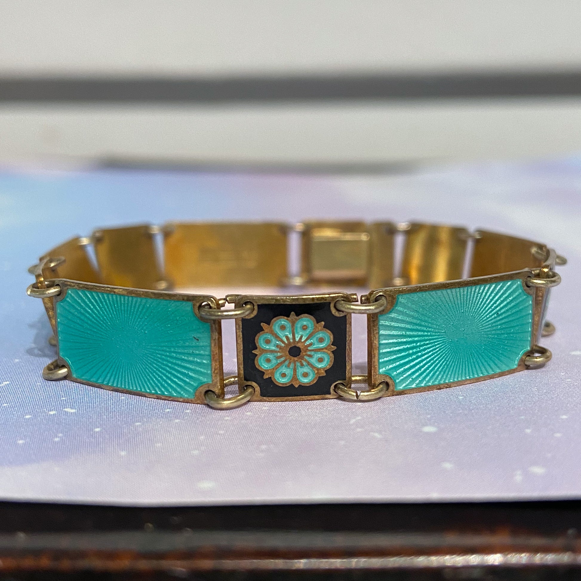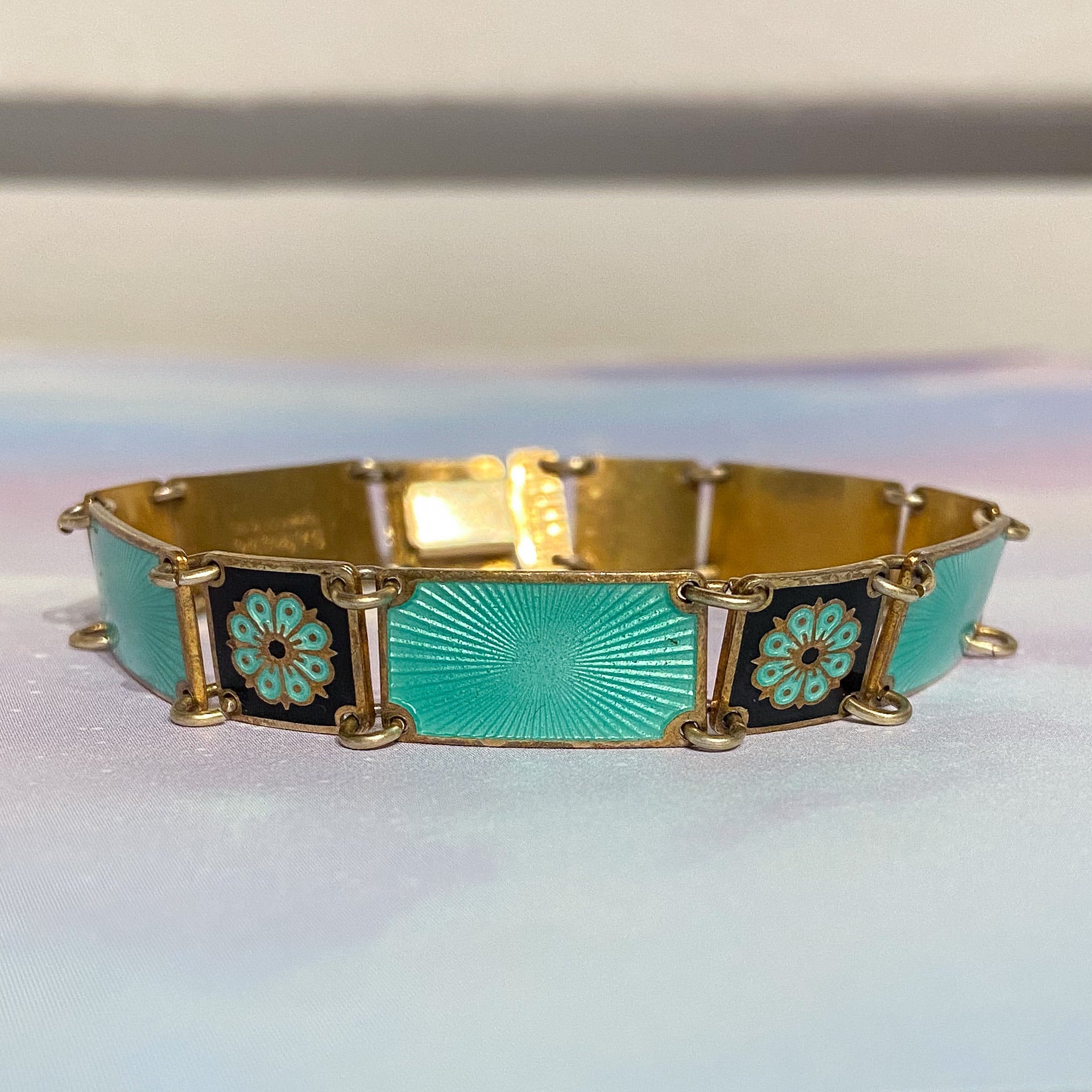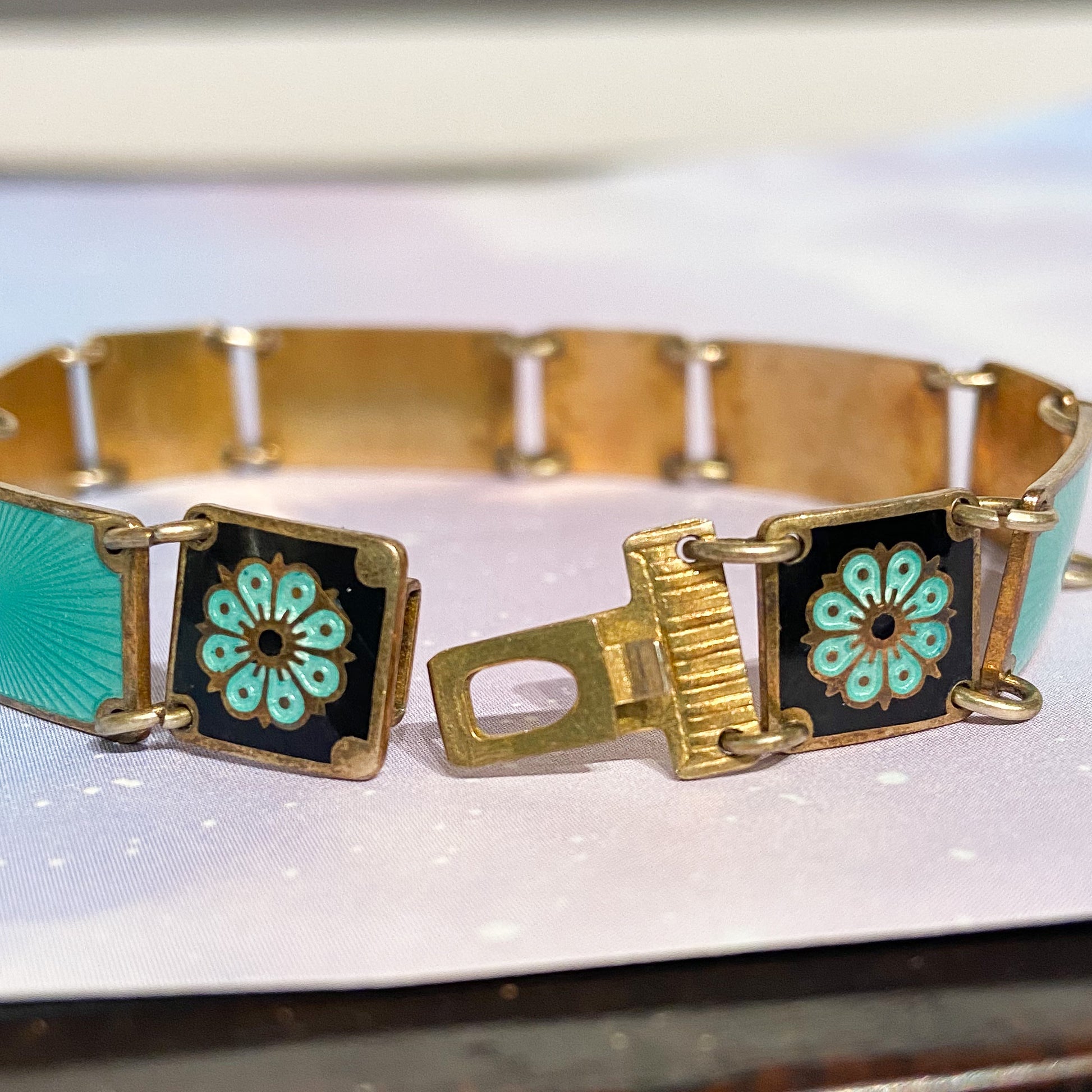Here is an enameled bracelet by famed Norwegian maker David Andersen, made is the most beautiful aqua green color you could possibly imagine. This is one of my all time fave colors, it's a stunner! The black accents set it off perfectly. Made in gilt sterling silver circa 1950's, fully signed and in excellent condition.