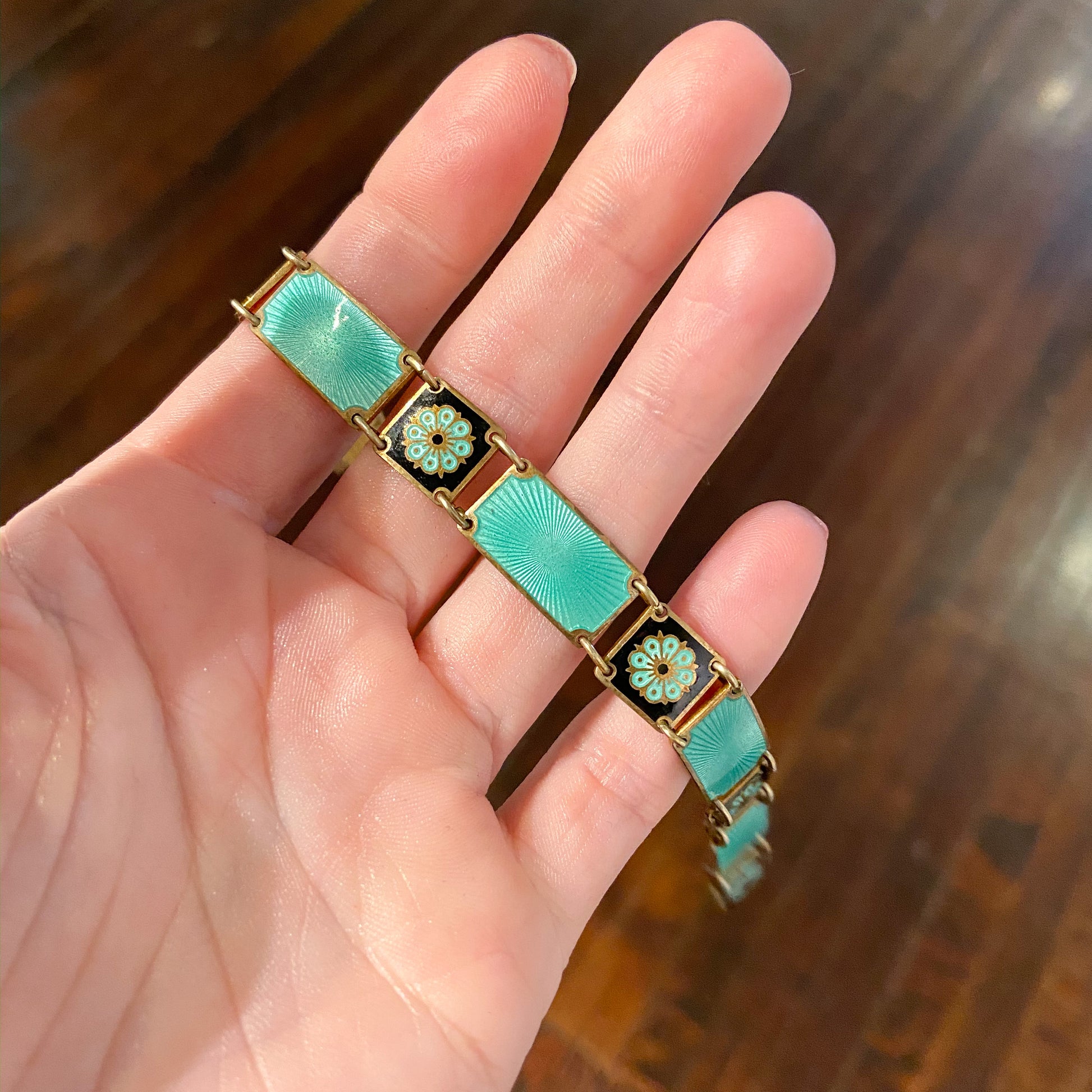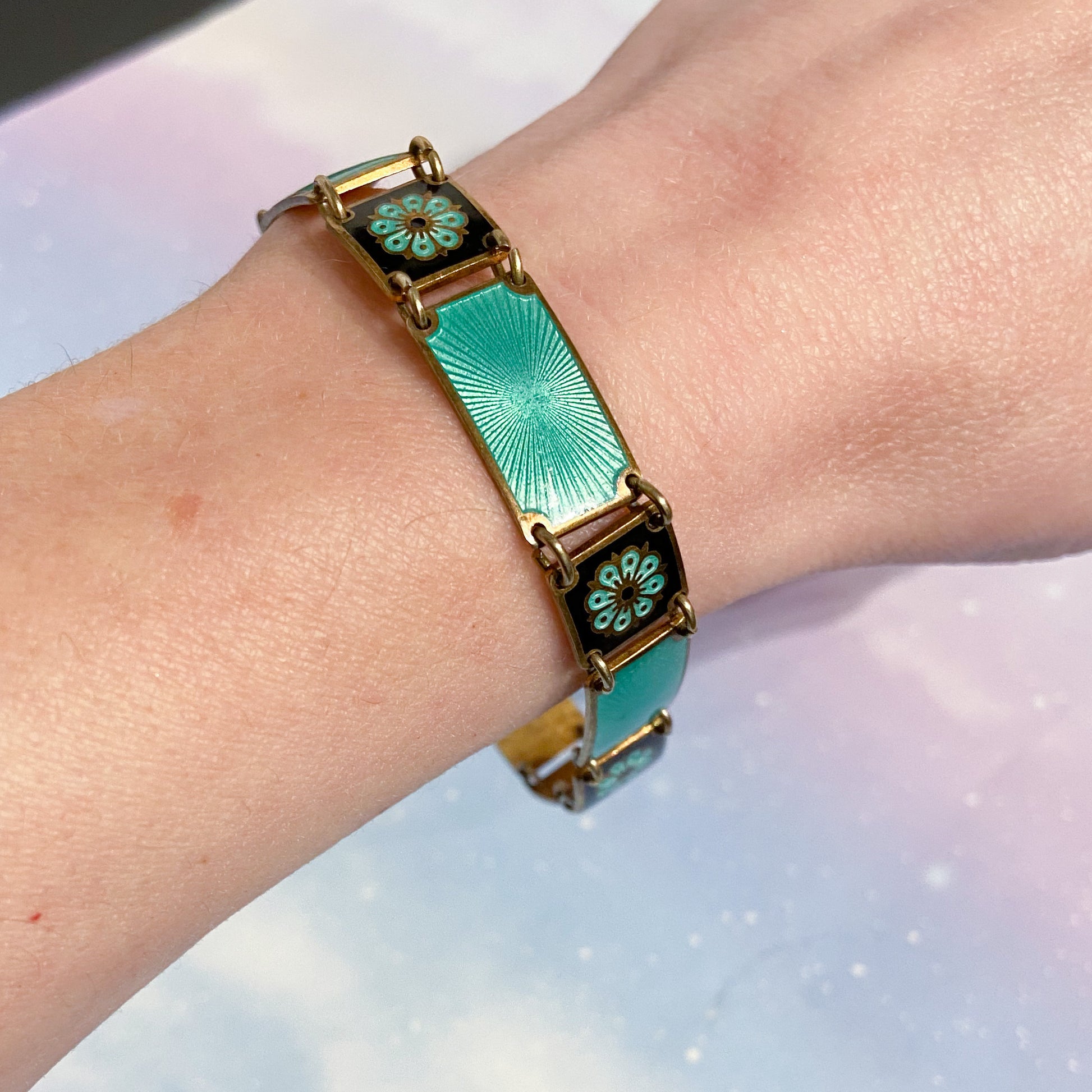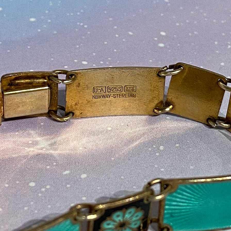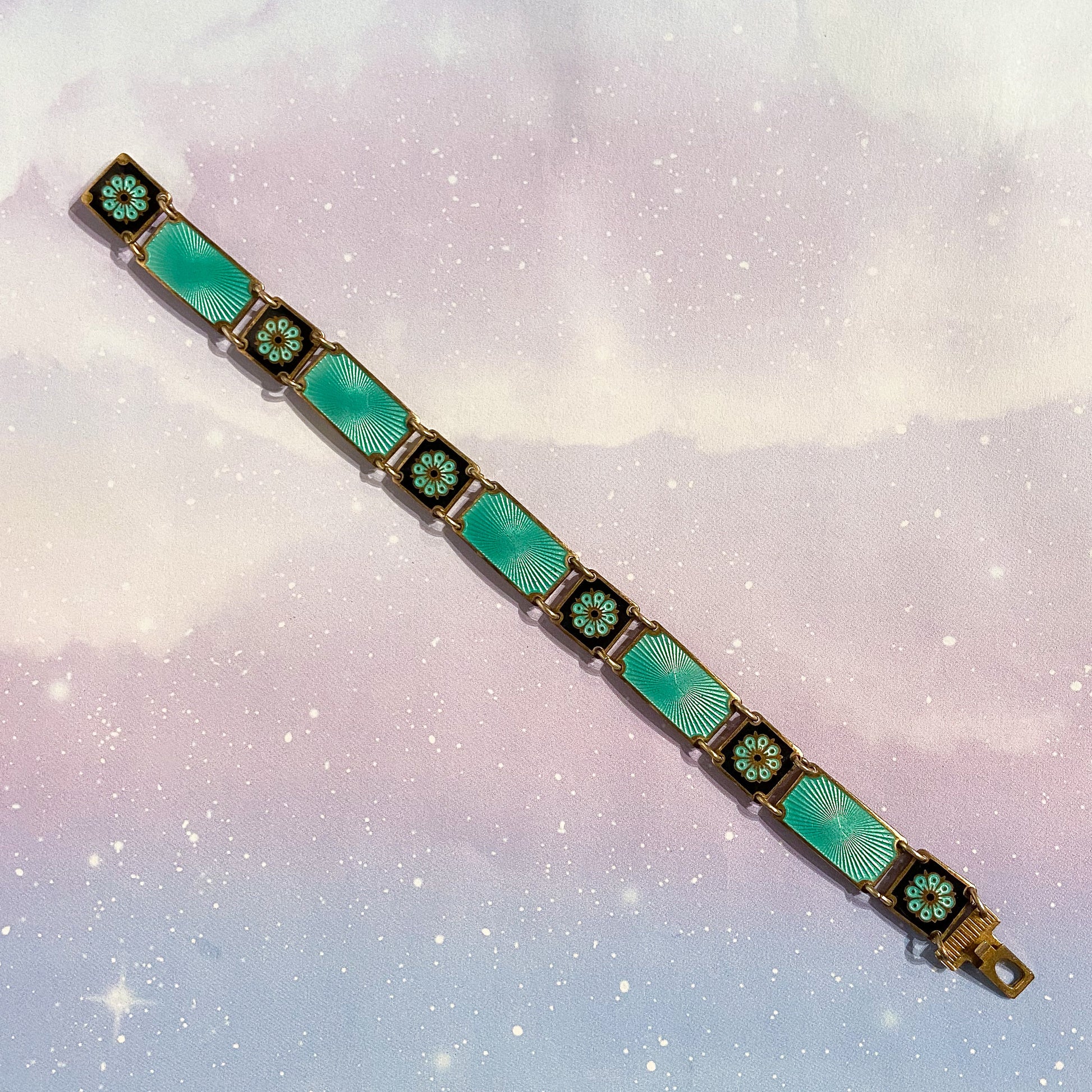 Here is an enameled bracelet by famed Norwegian maker David Andersen, made is the most beautiful aqua green color you could possibly imagine. This is one of my all time fave colors, it's a stunner! The black accents set it off perfectly. Made in gilt sterling silver circa 1950's, fully signed and in excellent condition.