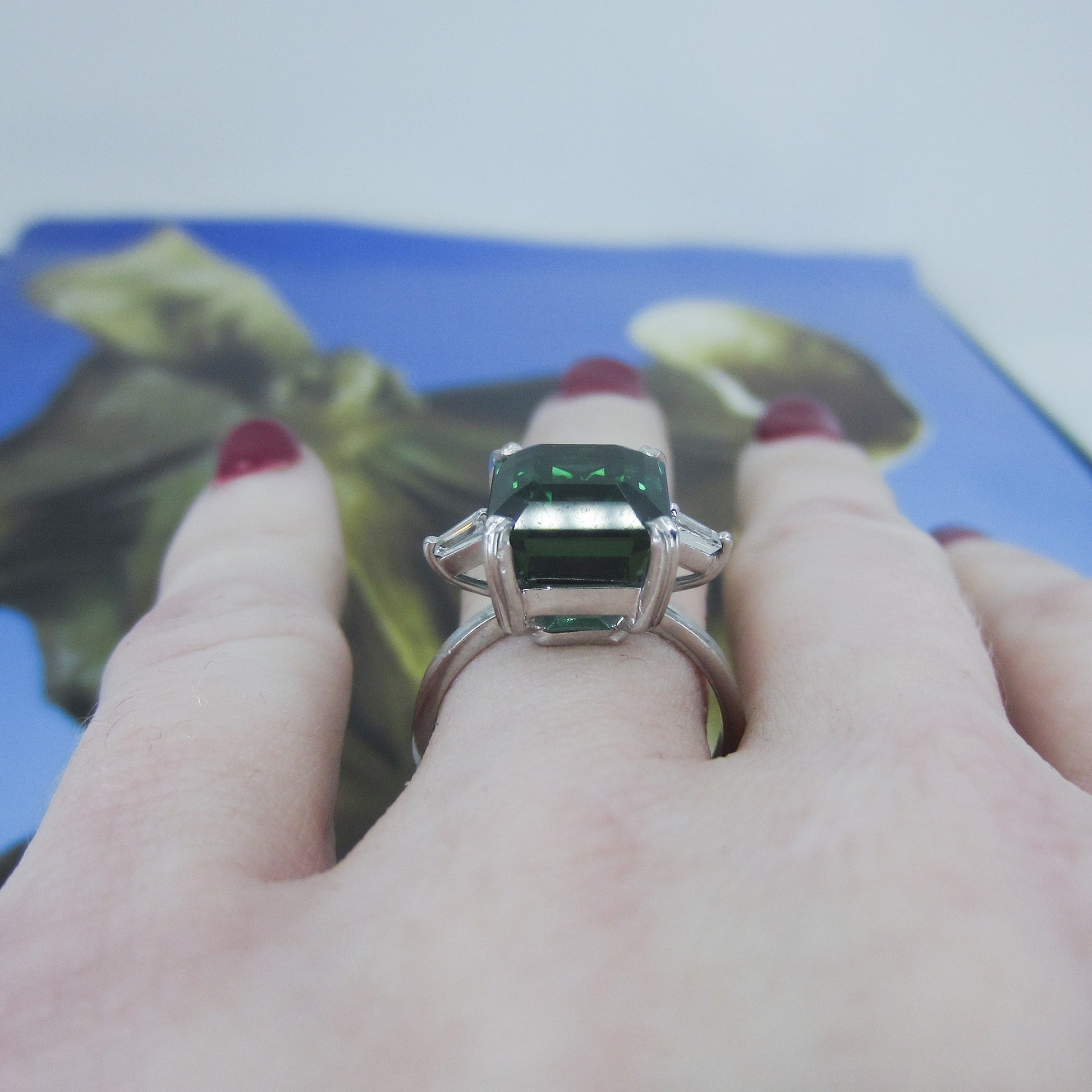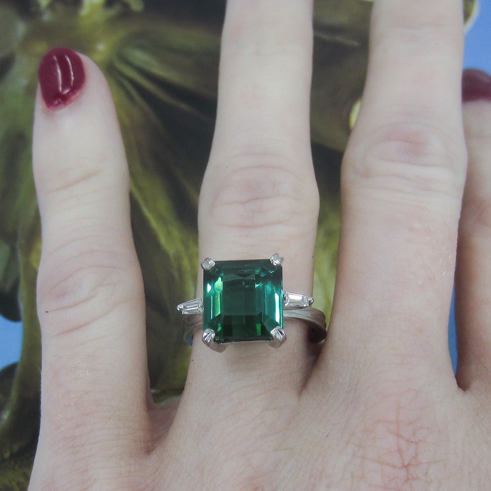 Natural green tourmaline weighs approximately 3.75ct. Baguette diamonds weigh approximately .10ctw with G-H Color and VS Clarity.