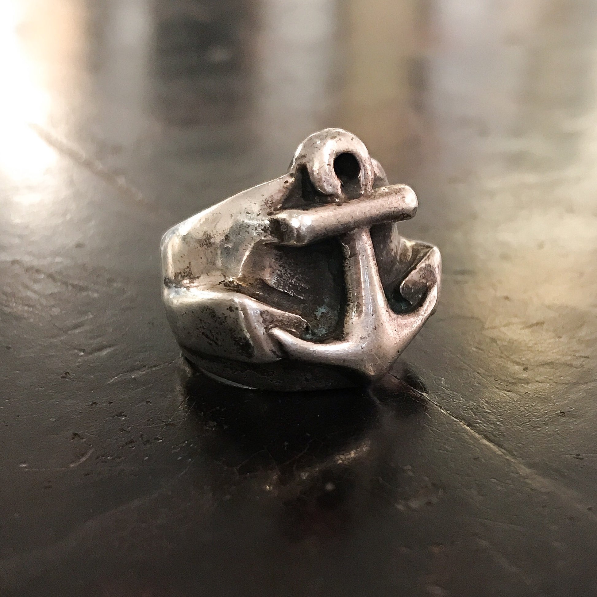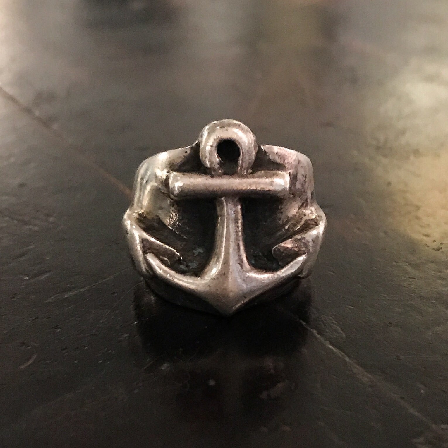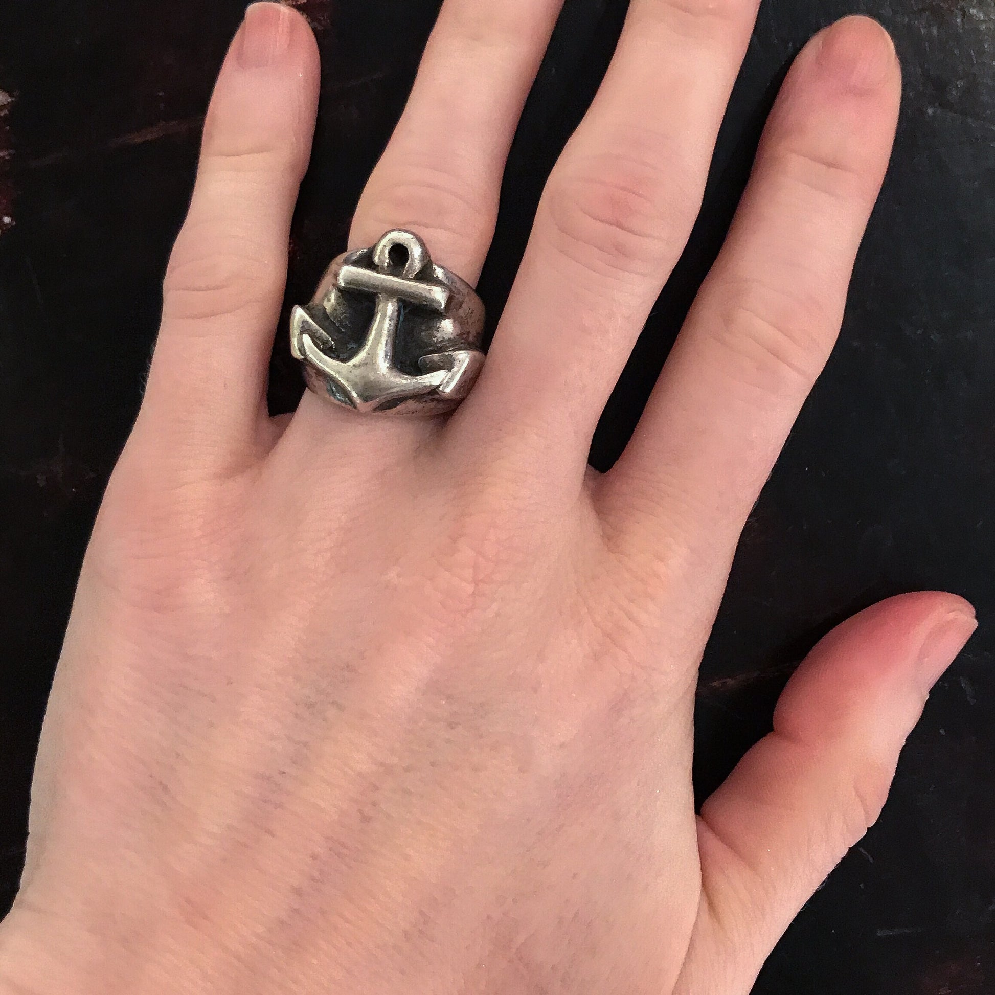 I don't know how old this awesome, very heavy vintage anchor ring is--it looks very Mid-Century to me and it has a lot of wear, but it is signed and I don't know this maker. So I'll leave it at just "vintage" as the description, but whoever gets this ring won't care because it is SO COOL. It was almost certainly a man's pinky ring and would be very good as one still, but it could also be a very chunky ladies ring too!