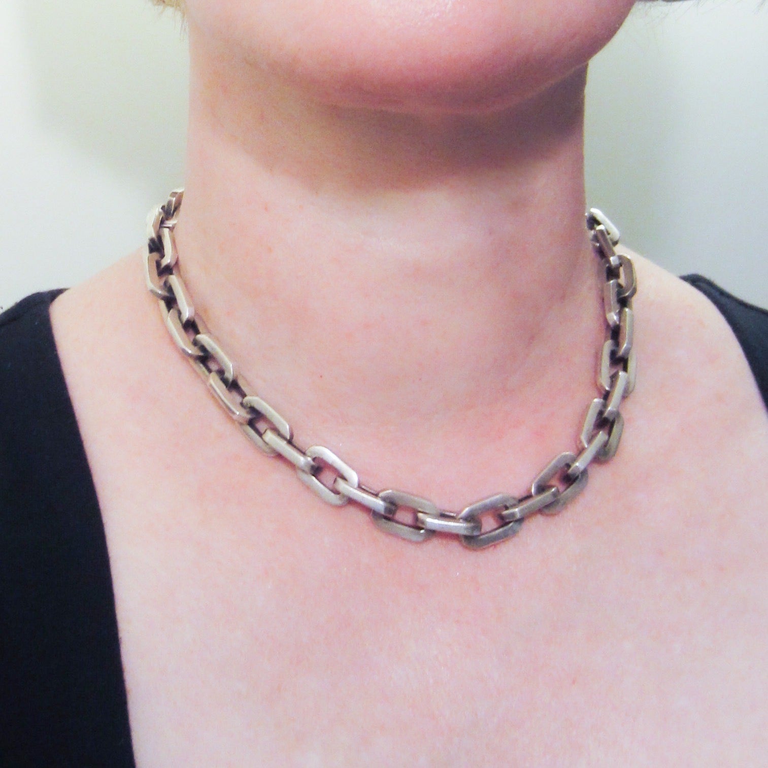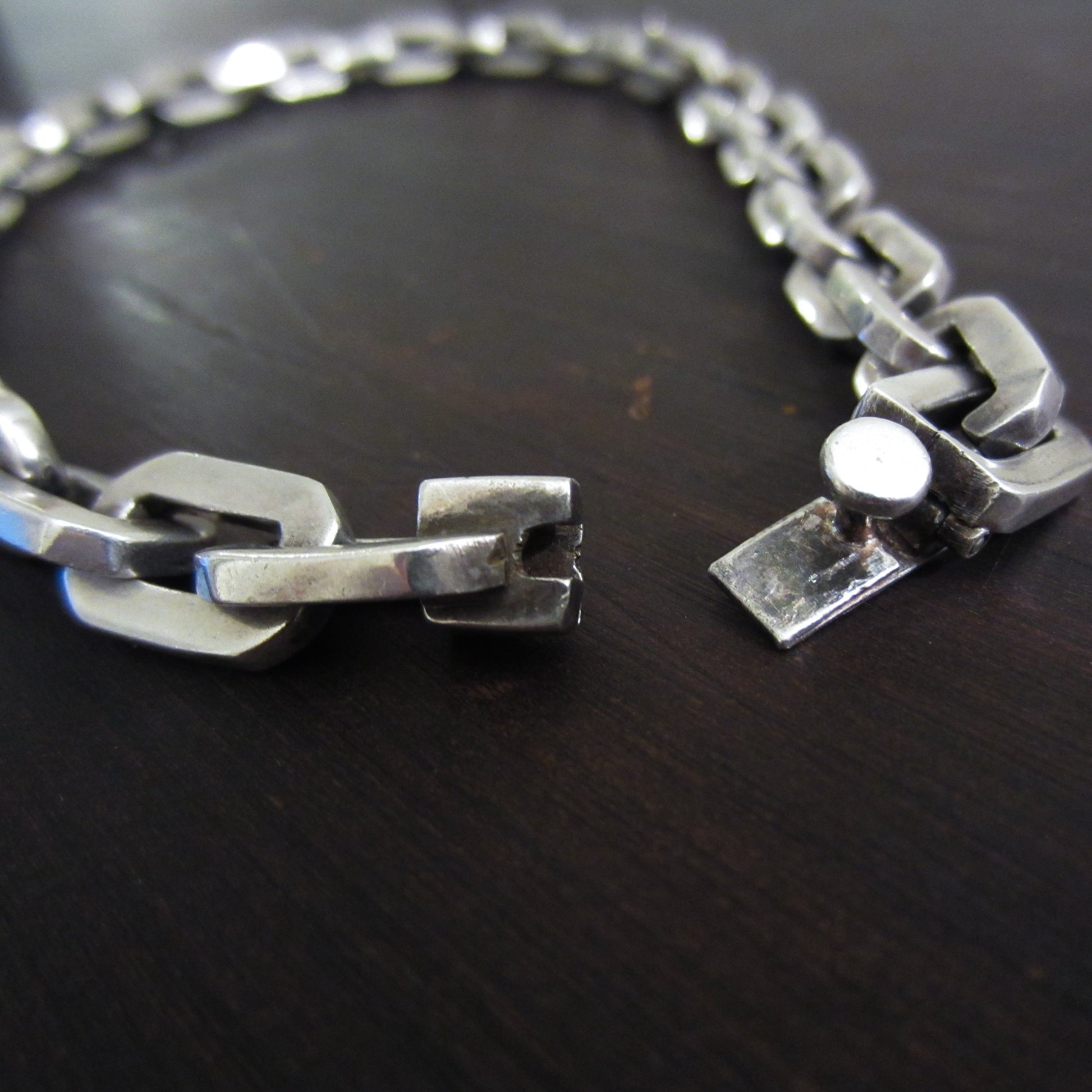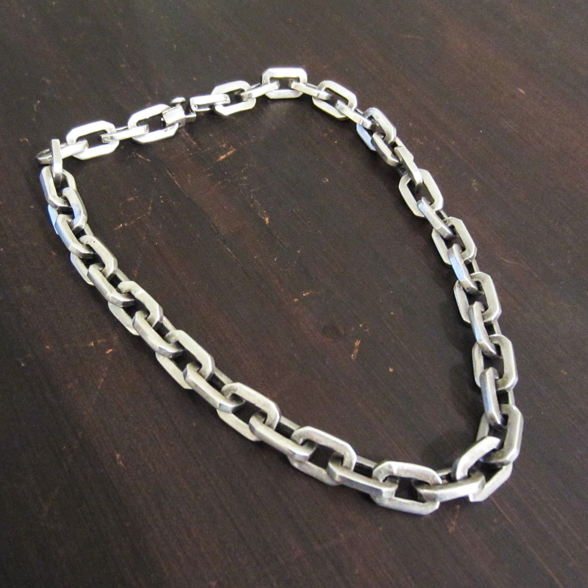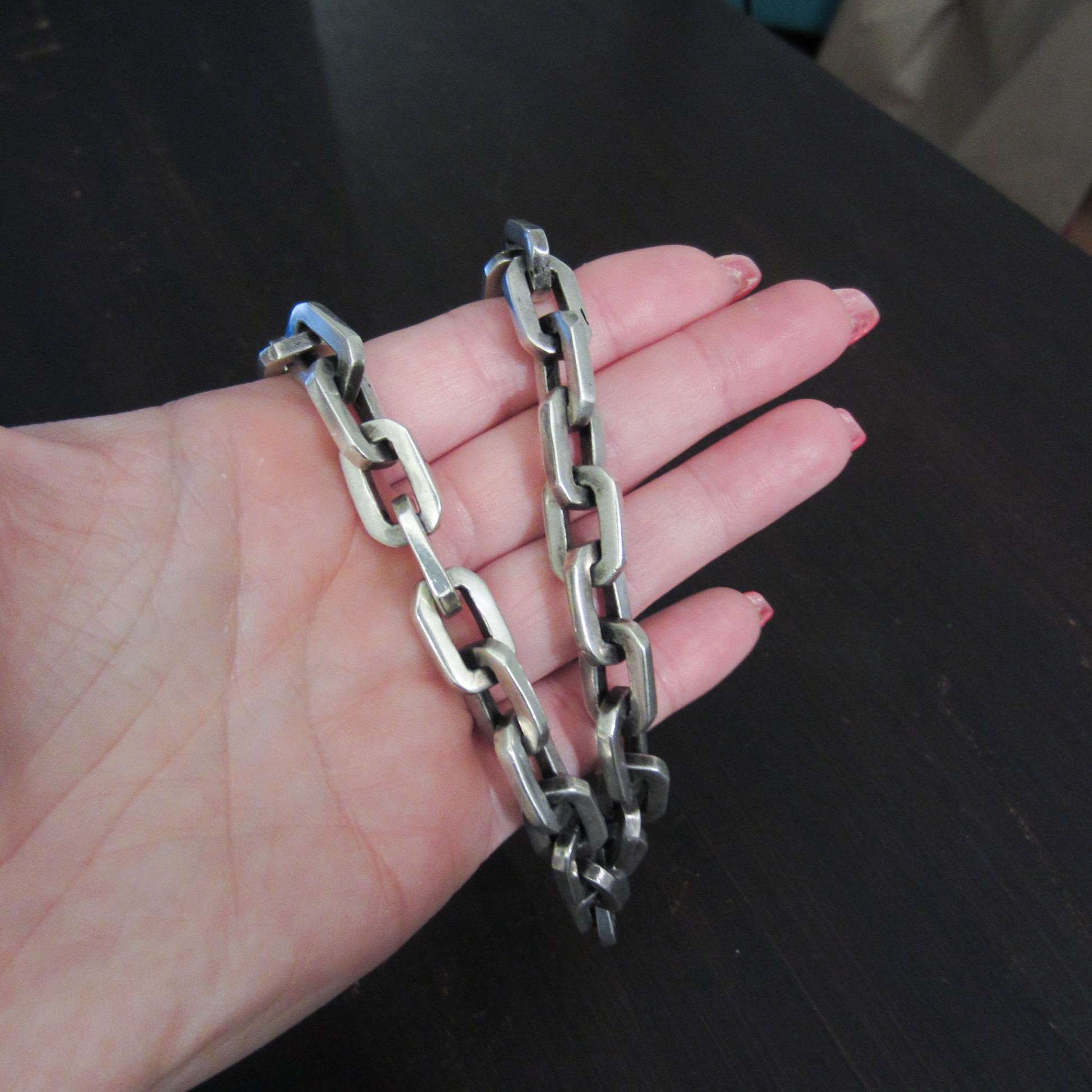 This fabulous chain from the Taxco region of Mexico is made of sterling silver and consists of rectangular links giving it a very cool geometric look. And let me tell you something, you are going to know at all times that you are wearing this chain because it is HEAVY. Weighing in at 116 grams and measuring 17", this is a finely made piece circa 1970's that will become a wardrobe staple for its new owner!