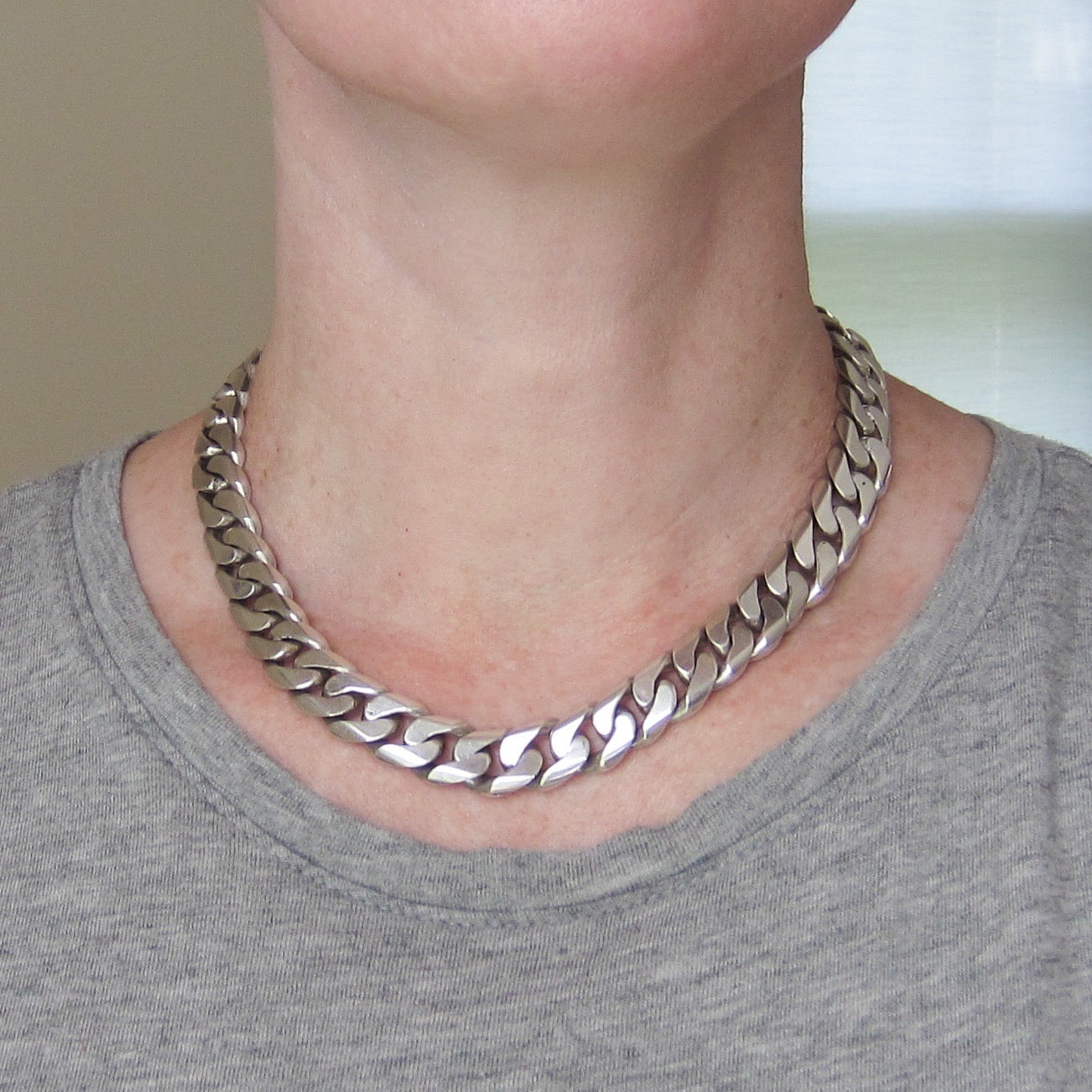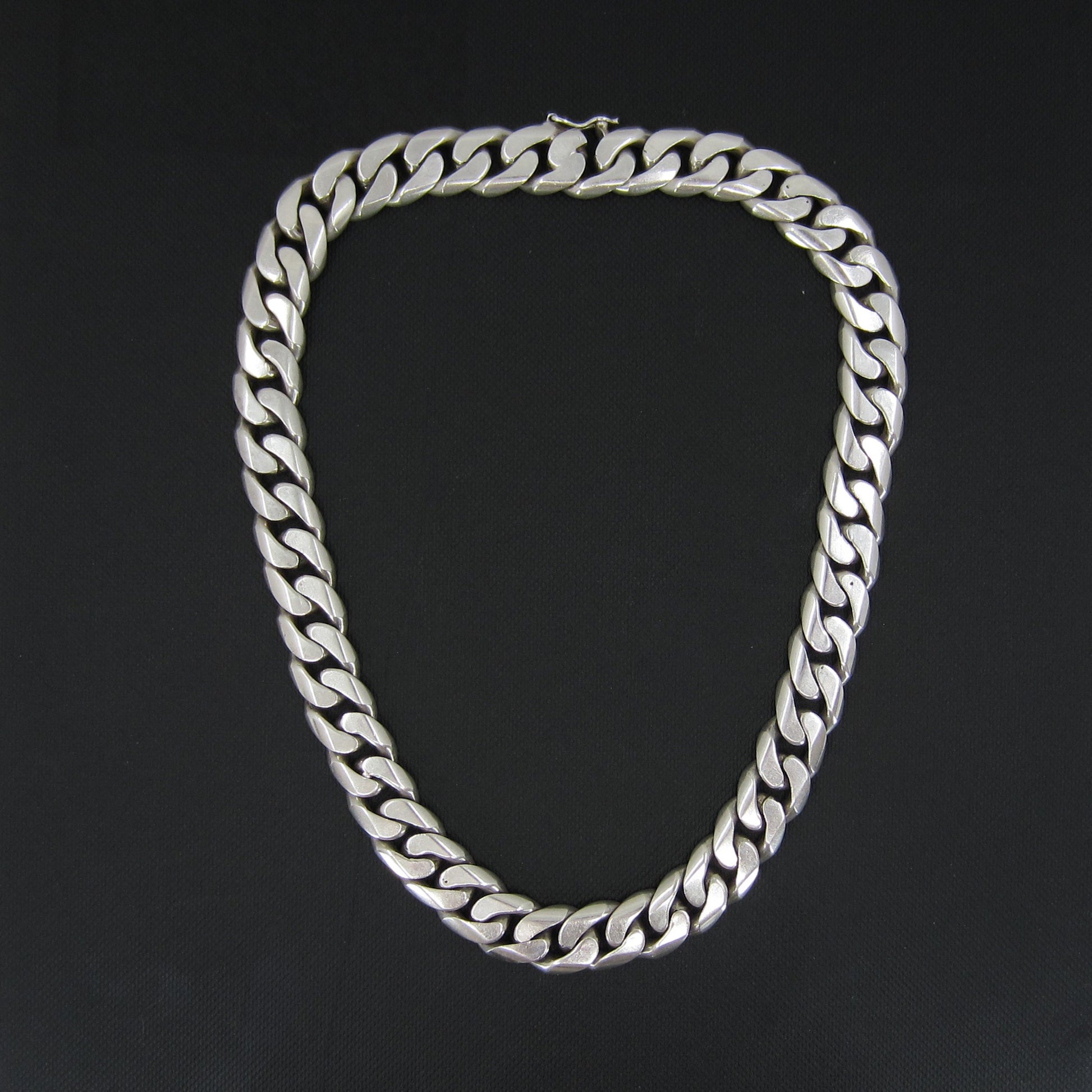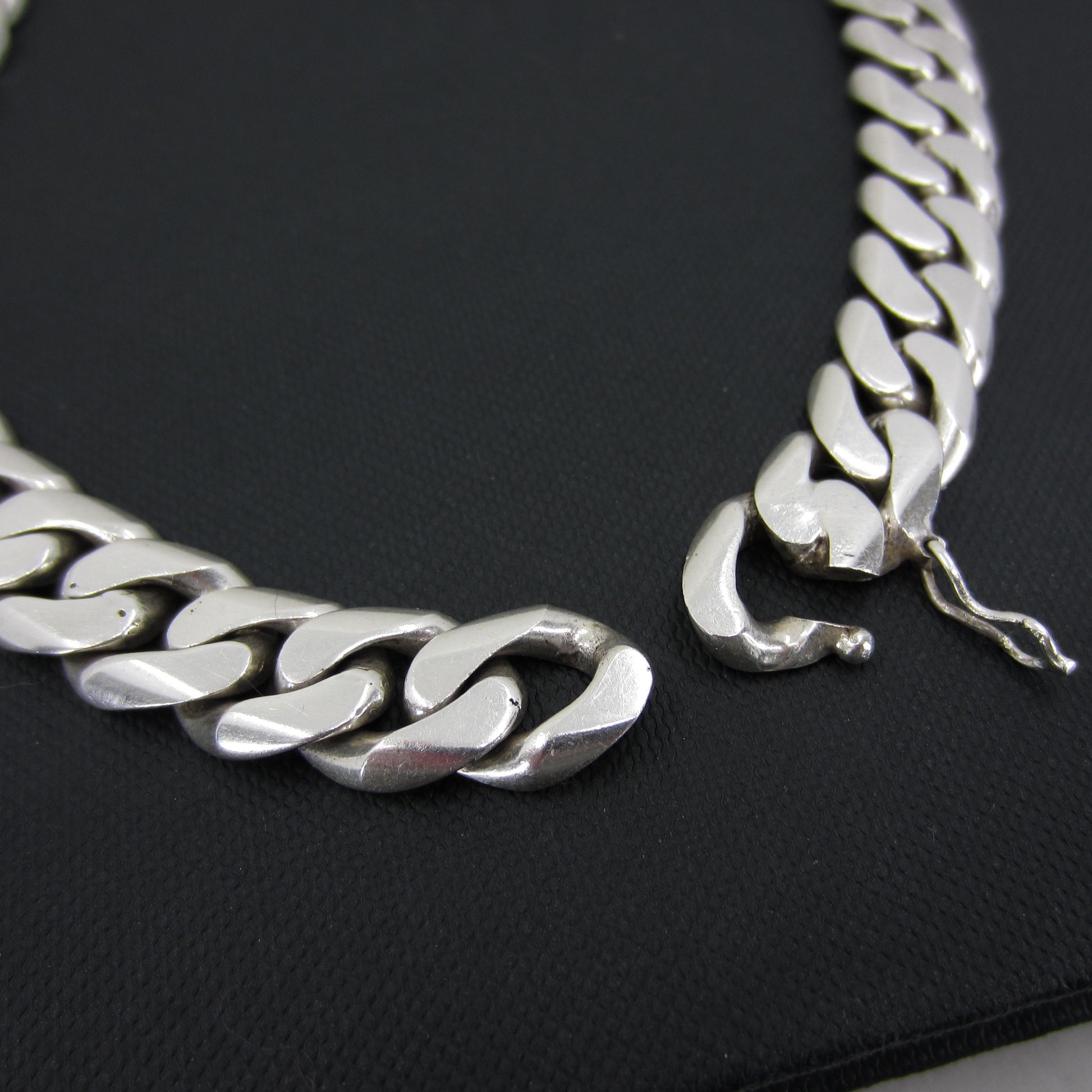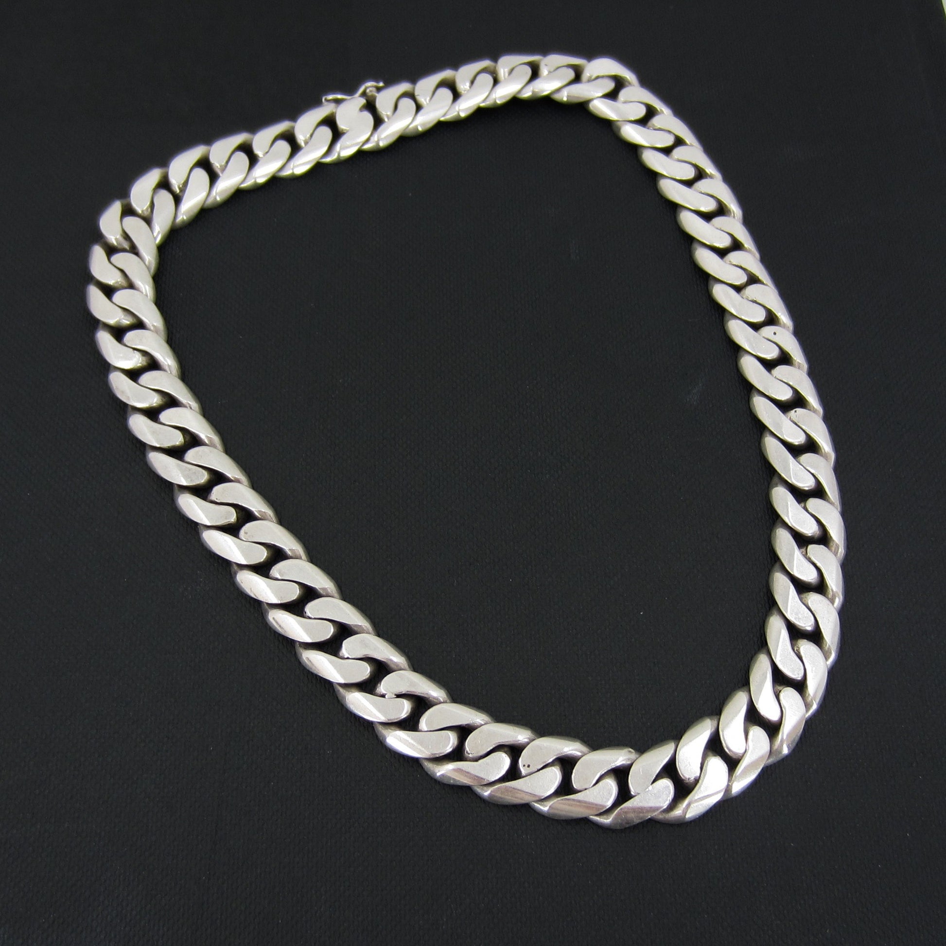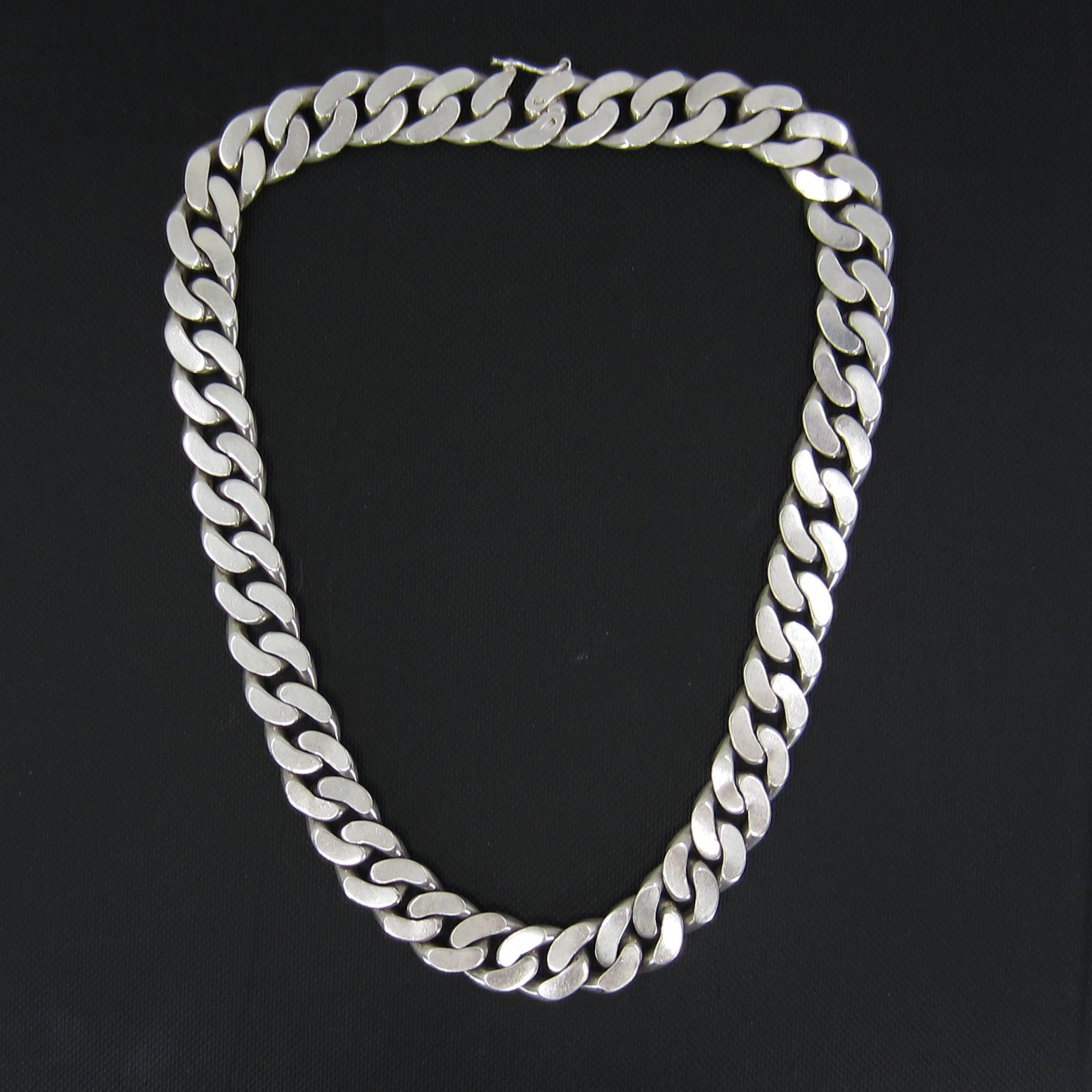 A beautiful and very heavy flat curb link chain circa 1970's-80's with a hidden clasp and a wide gauge. Sterling silver and made in Italy. Measures 17" length.